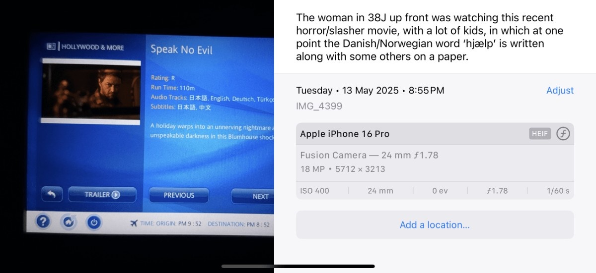 As the ending credits rolled, only an hour remained into the flight. I must emphasise here again that the IFE was painfully slow to fast-forward and rewind, and that it was glaringly obvious that it’d been designed in a time well before Netflix and Amazon Prime Video, with their instant skippability (or skip-forwardability, if you will), became global forces.