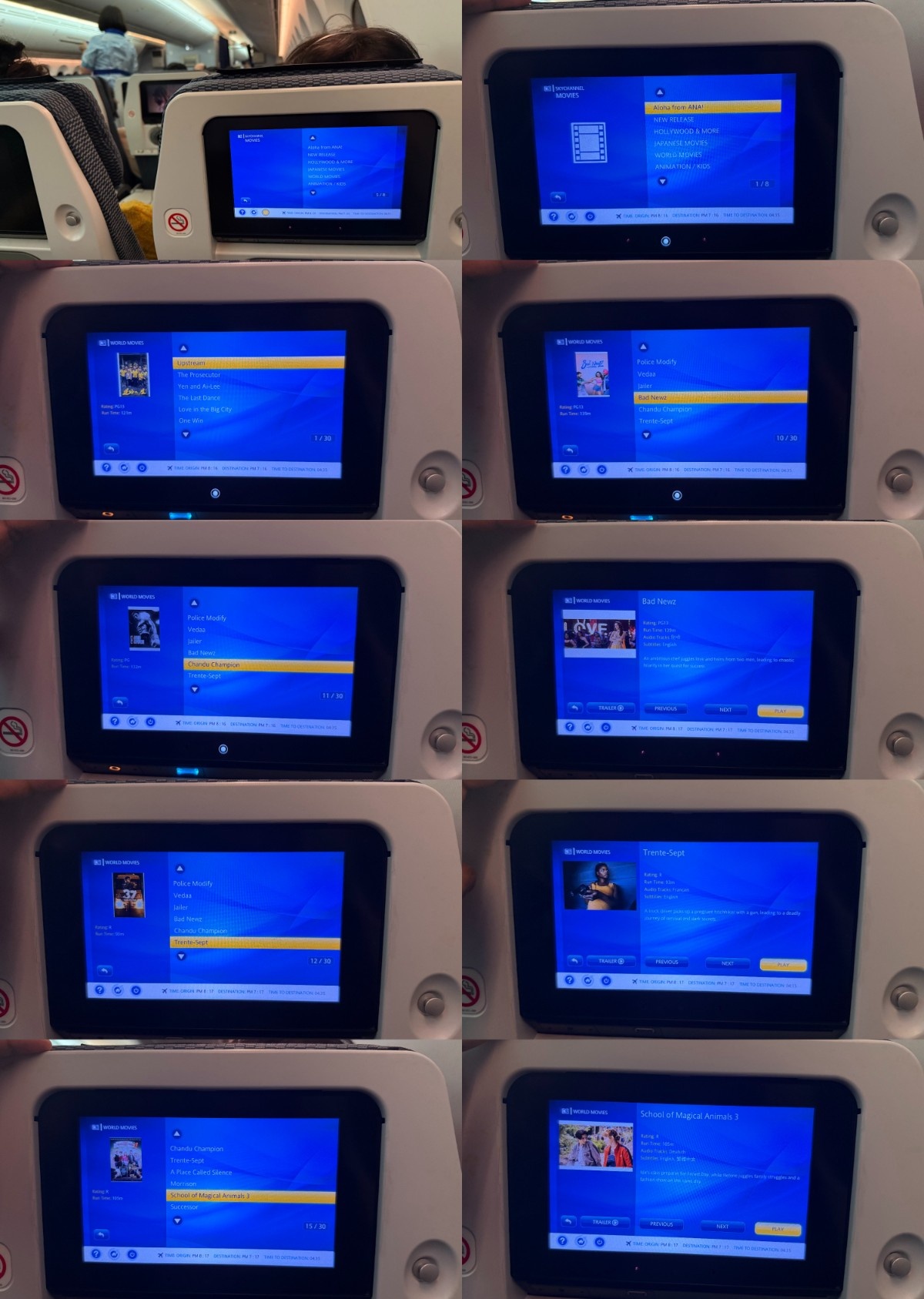 Having finally seen the last of Japan, I was determined not to feel as blue as the IFE interface, and so set out to explore its entertainment offerings. Surprisingly, while ANA is no CX or SQ, it did have a couple of newer Bollywood releases (Bad Newz and Chandu Champion), which I appreciated. But this wasn’t the day for the same old Indian movies — why not be a little adventurous on a trip that had been precisely that?
