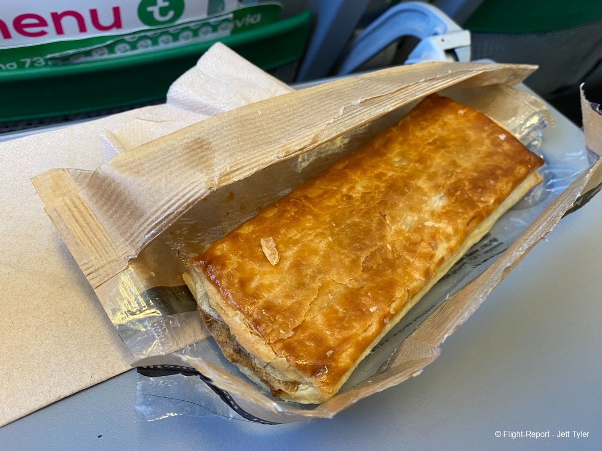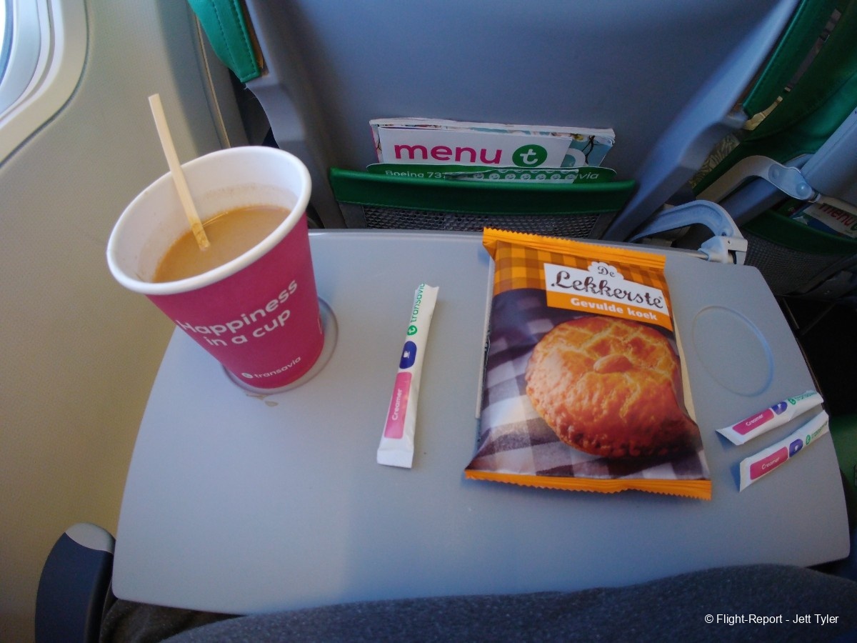 I ordered some lunch off the inflight menu so I could feature some stuff for the article and my Flight Review video, for 11EUR (£9.60p) I got a Hot Drink + Sweet Snack as well as Beef Sausage Roll. For the hot drink I went with coffee and for the sweet snack I opted for a Dutch classic known as "Gevulde Koek" which is basically an Almond Cake, they are very tasty!