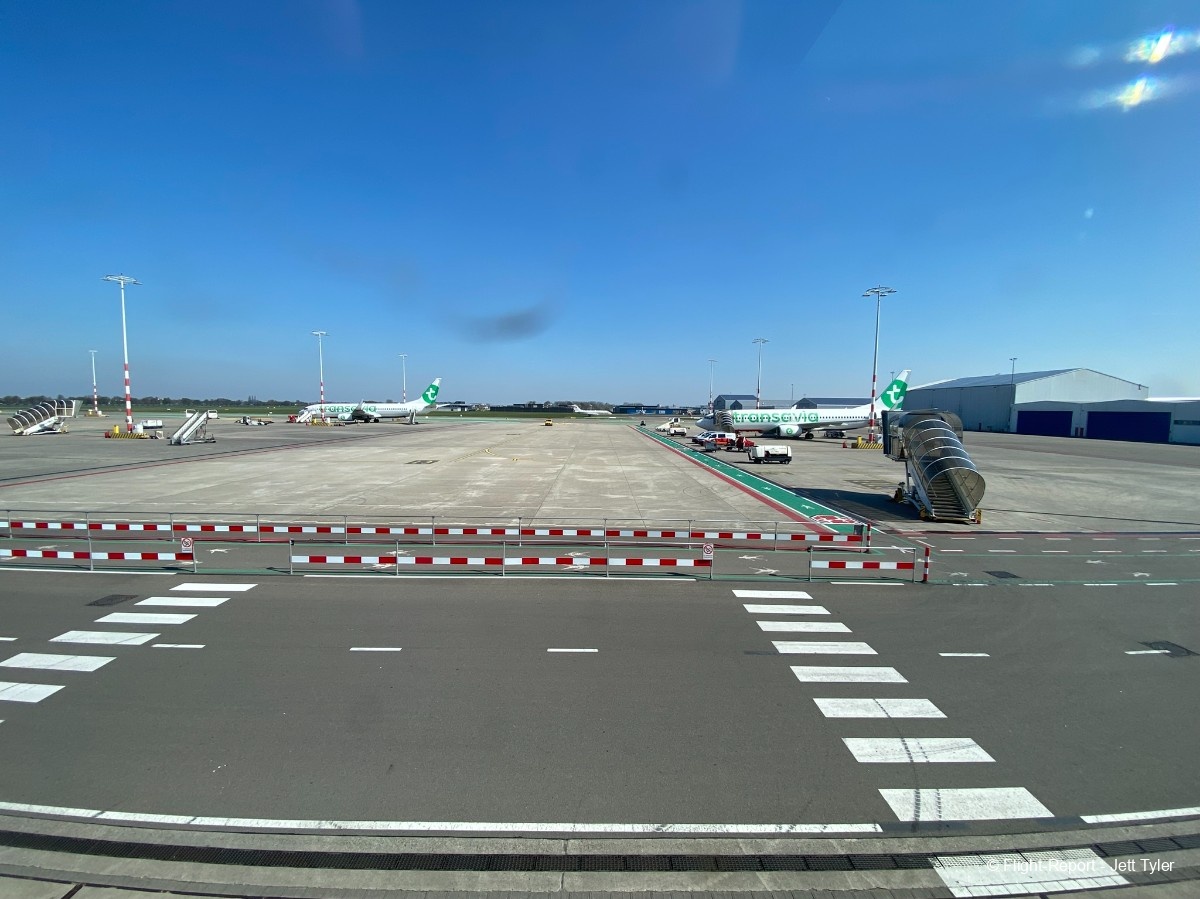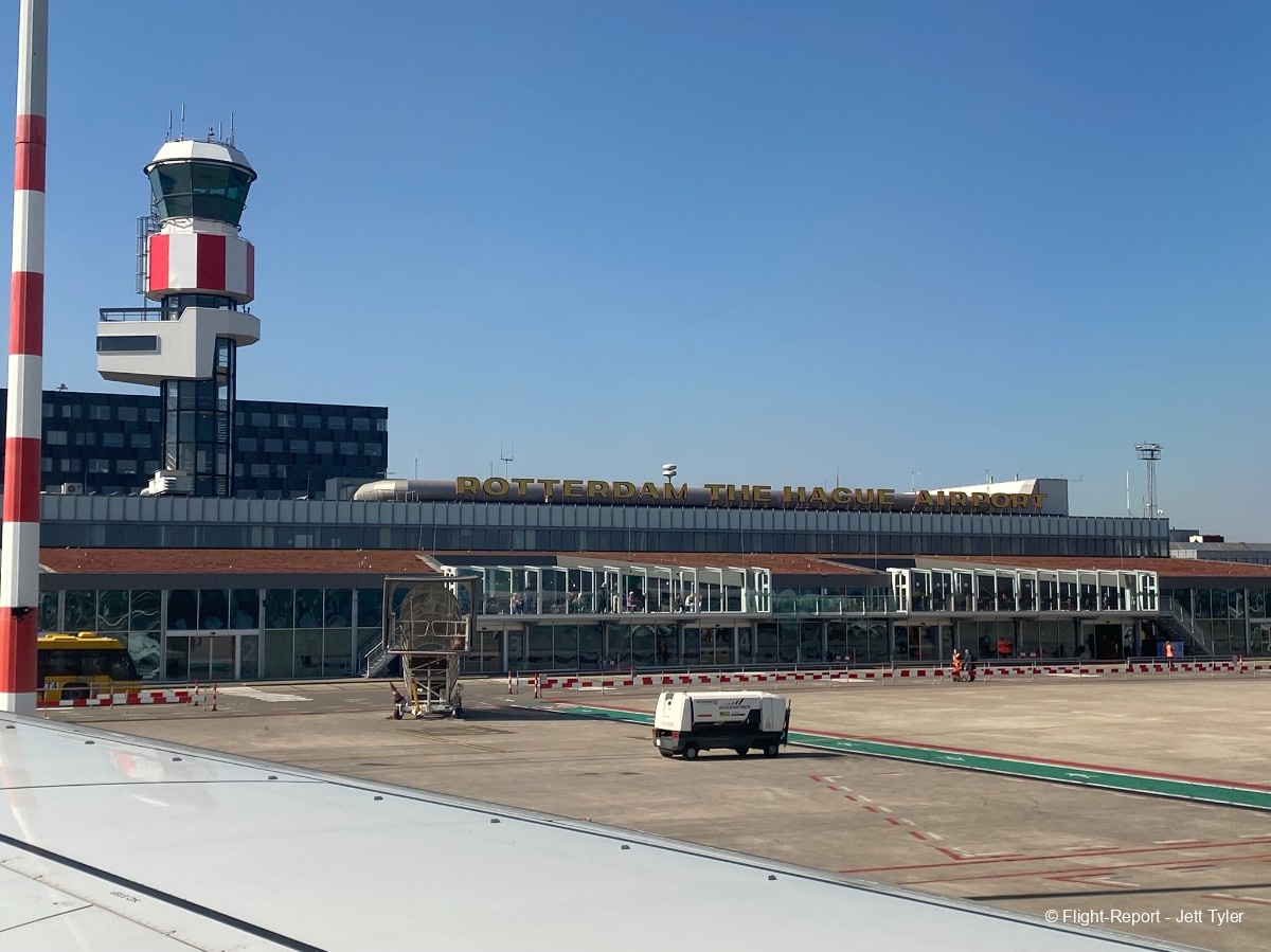 We landed into Rotterdam the Hague Airport, arriving on Runway 06. We departed the runway and began the quick taxi to the main apron for the airliners at the Airport. We passed the general aviation hangars as well as restaurant which has amazing runway views!