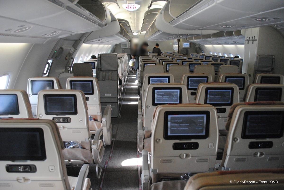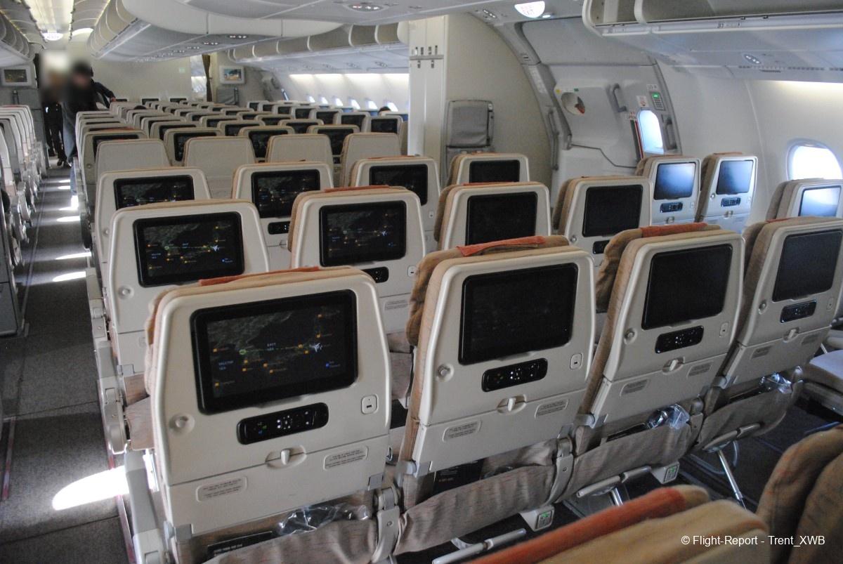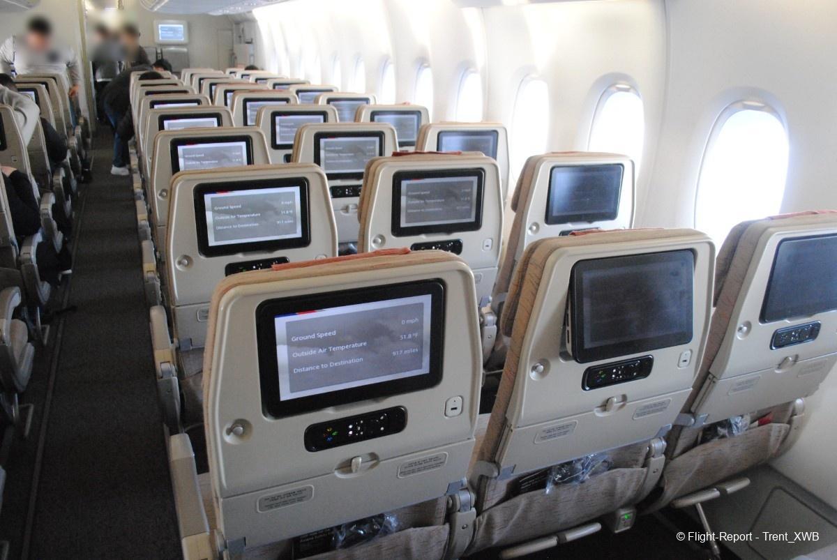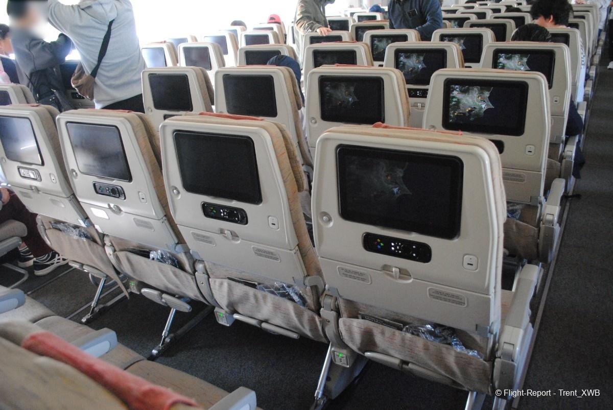 View of the upper-deck economy cabin after the flight. Please note that exit row seats (70AB and HK) don't have windows.