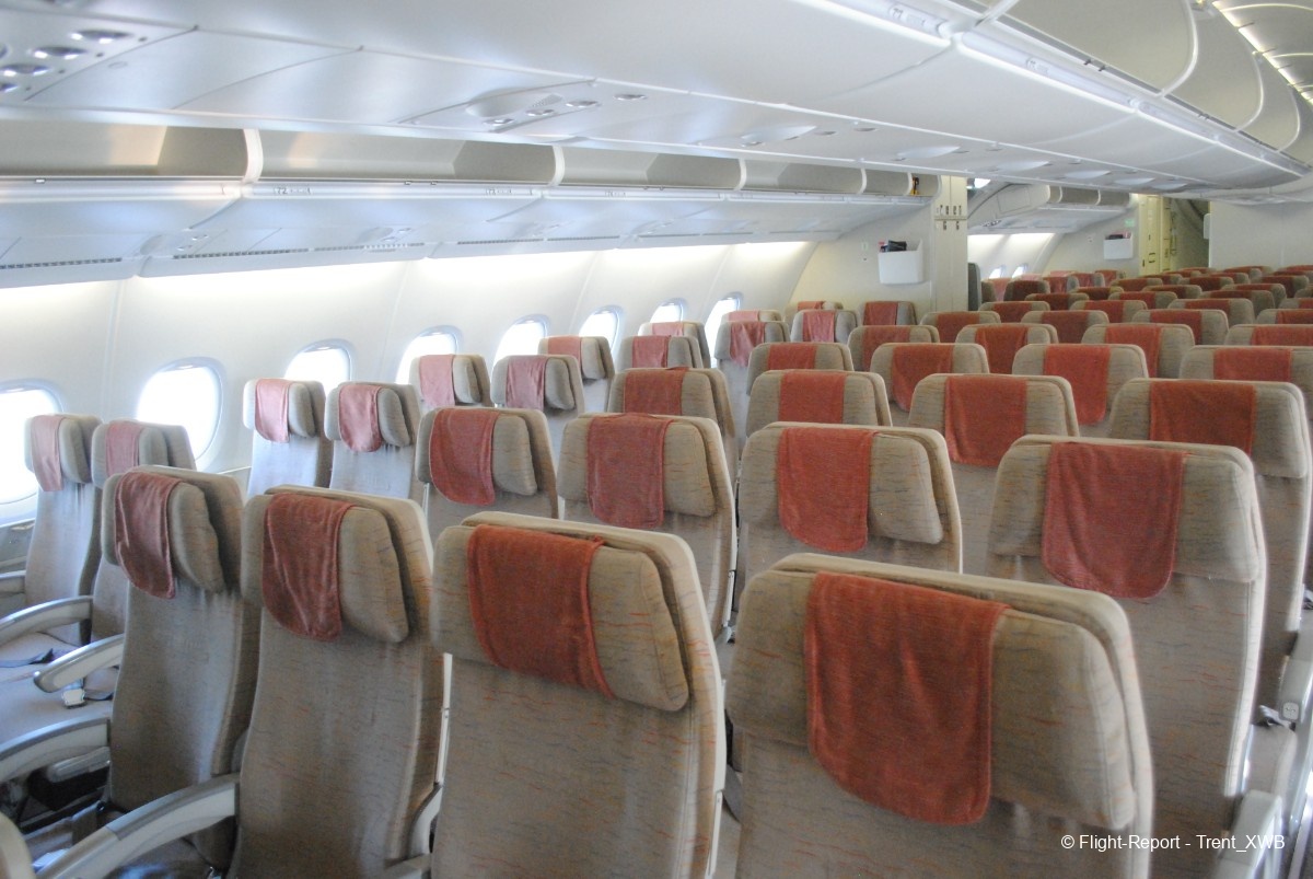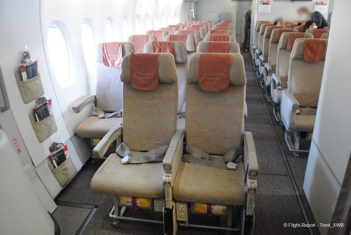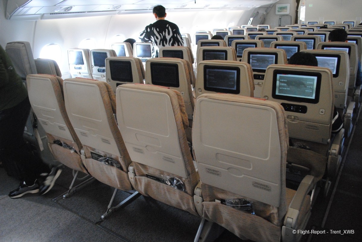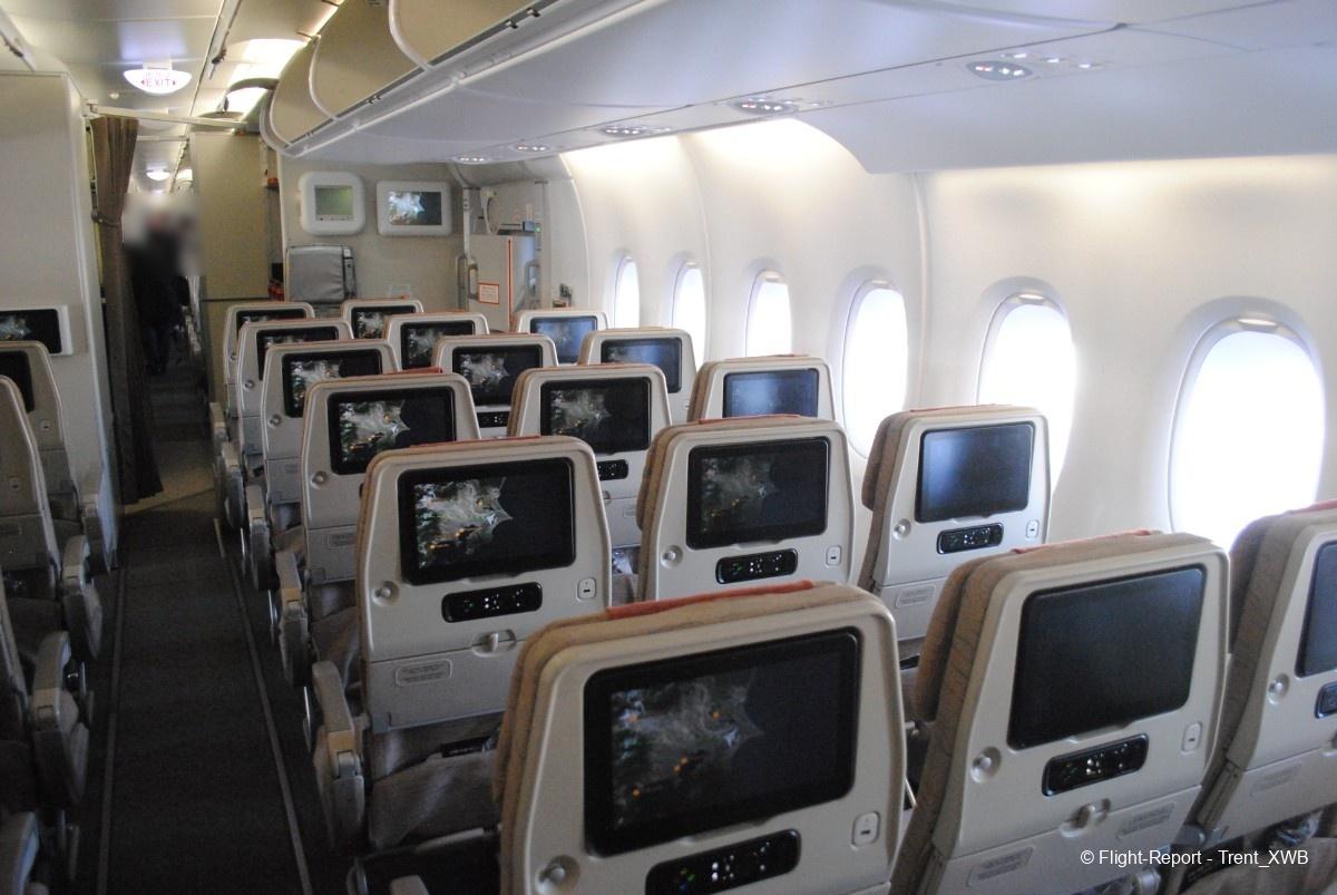 View of the upper-deck economy cabin after the flight. Please note that exit row seats (70AB and HK) don't have windows.