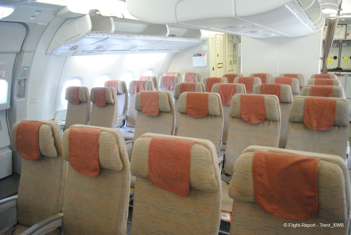 The upper-deck economy cabin consists of 106 seat in 2-4-2 layout. Unlike British Airways A380, there is no partition into 2 cabins by a lavatory between U3 doors pair. Just one relatively long cabin. Please note that exit row seats 80A/K near U3 doors don't have windows (and seats 70A/K near U2 doors as well). Overhead bins in economy are of A330ceo-type (relatively small).