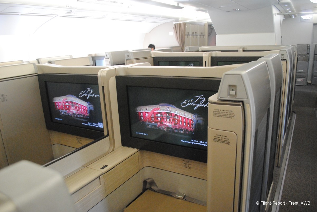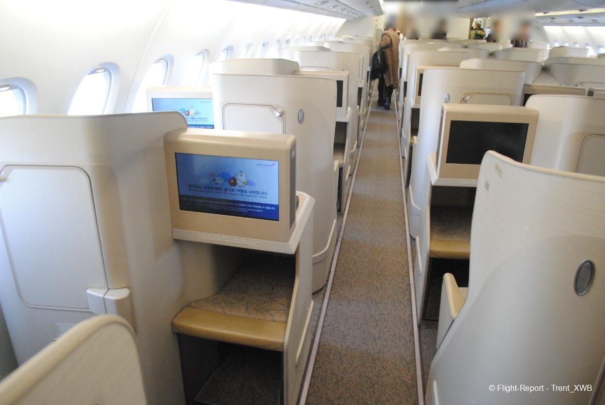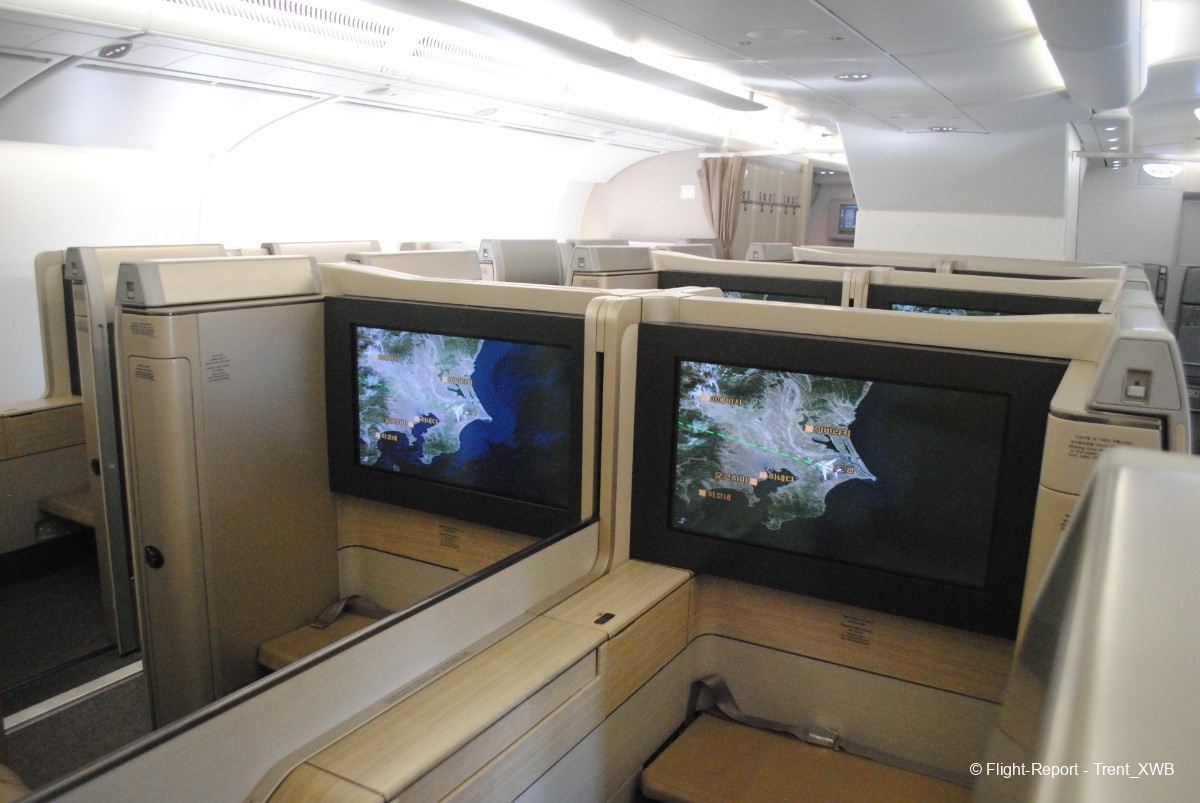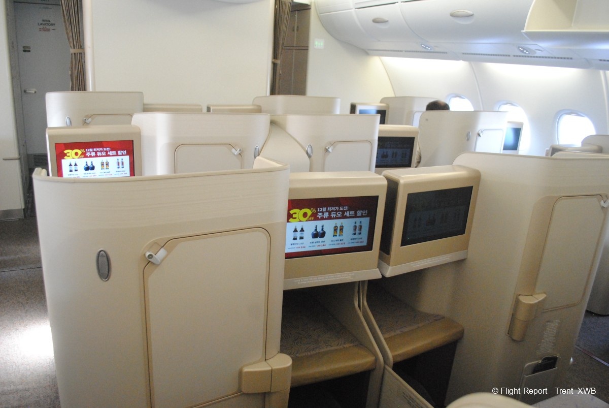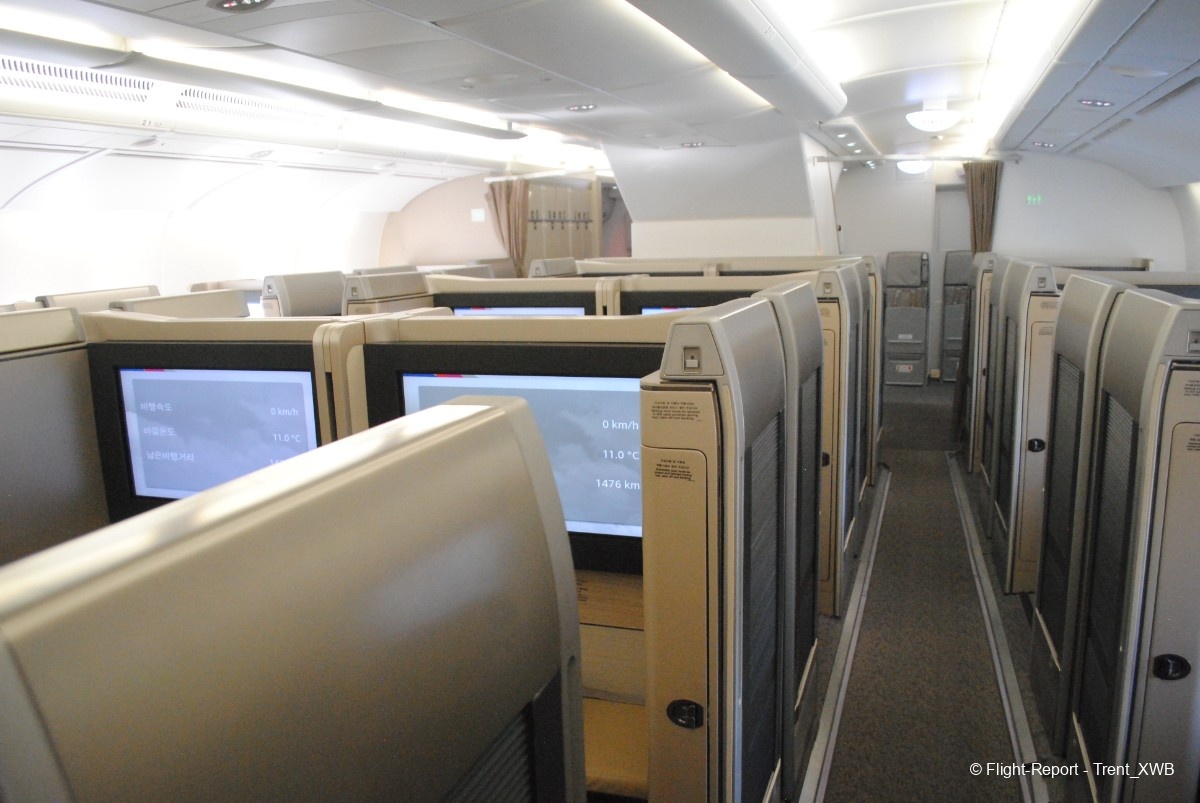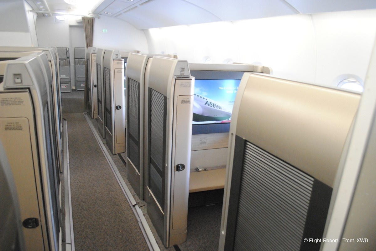 In the very front of the lower deck there is a first class cabin, which consist of 12 1-2-1 suites (based on B/E Aerospace Oasis platform). OZ currently calls it "business suite" and sells like a kind of "business plus" without real first-class service.