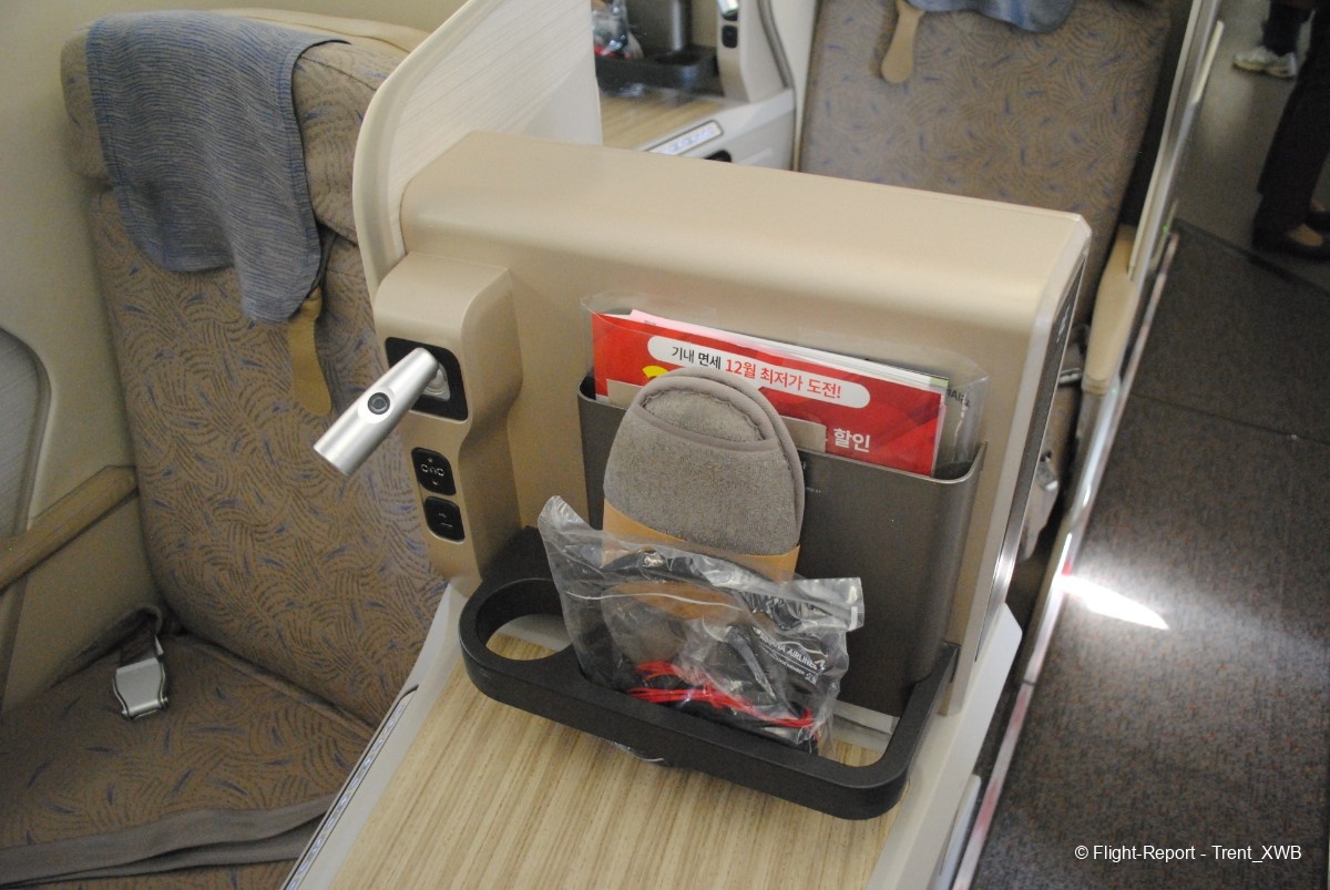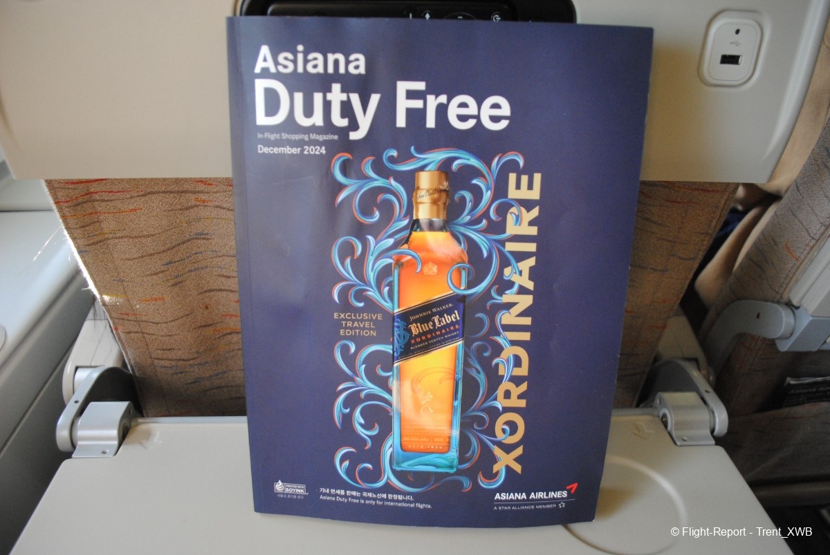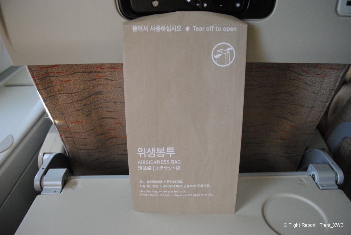 The seat pocket contains headset, safety card, duty-free magazine, waste bag and Korean immigration card.