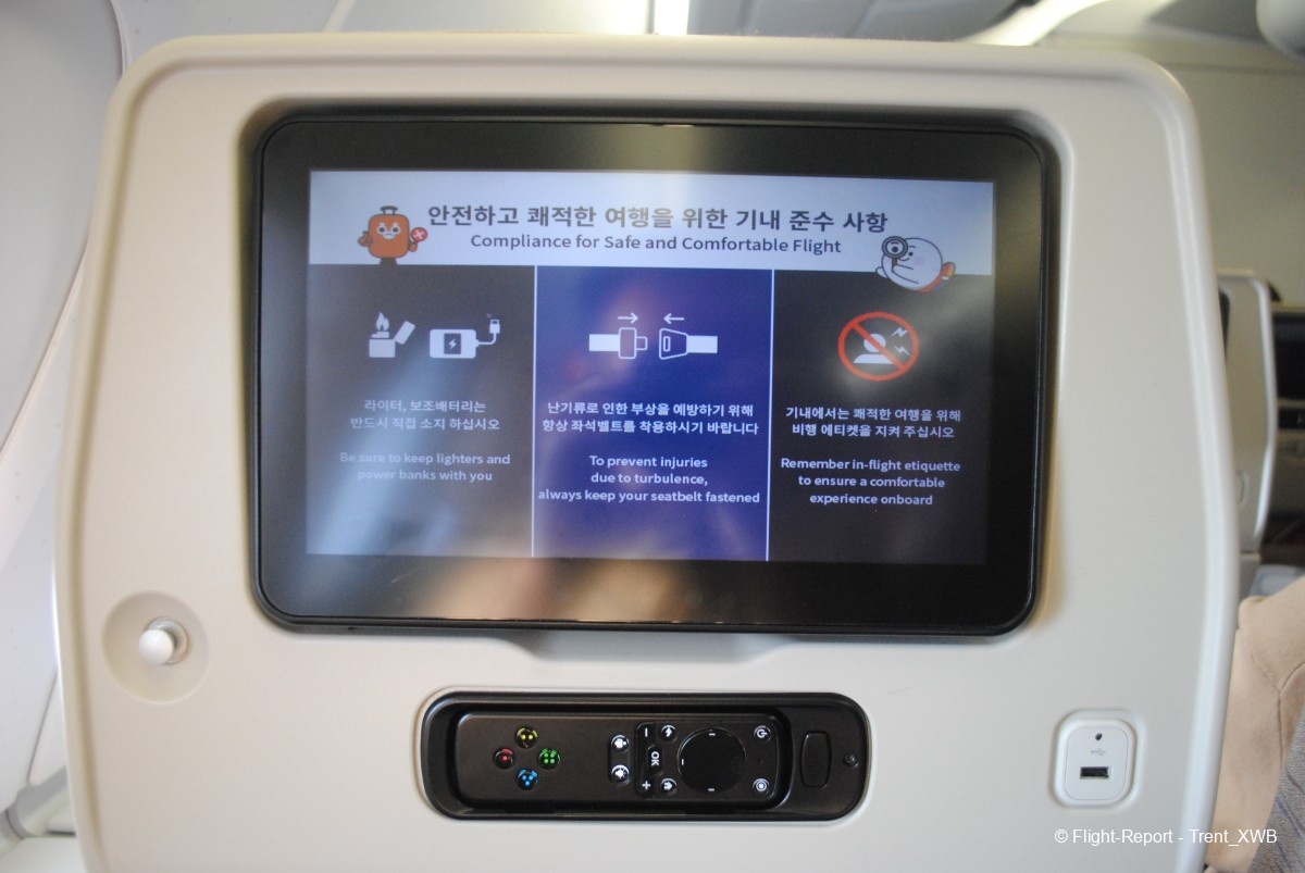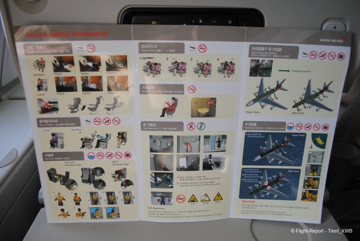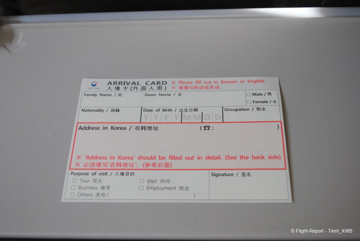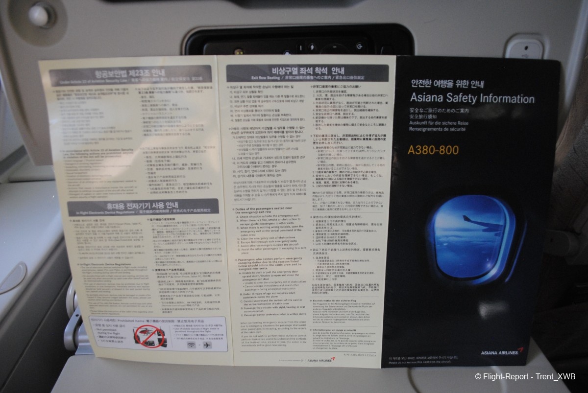 The seat pocket contains headset, safety card, duty-free magazine, waste bag and Korean immigration card.