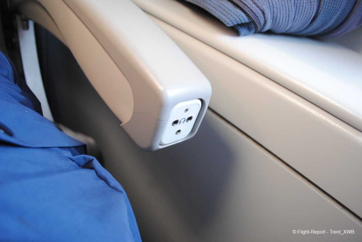 The seat features IFE with big screen and adjustable angle, remote control, USB port, coat hanger, bi-fold tray table, seat pocket, legrest and universal power socket underseat (one for a pair of seats). The headset socket is located in the armrest.