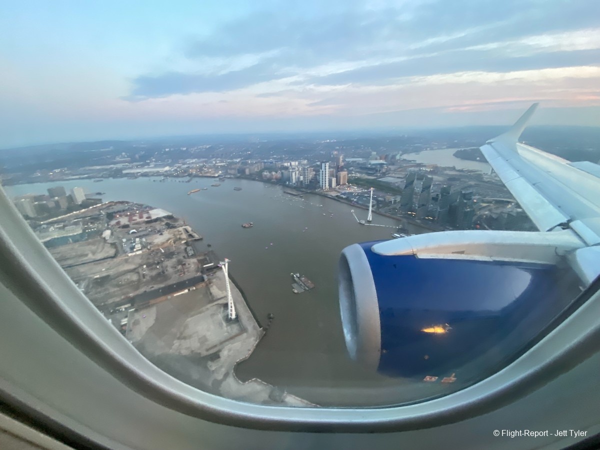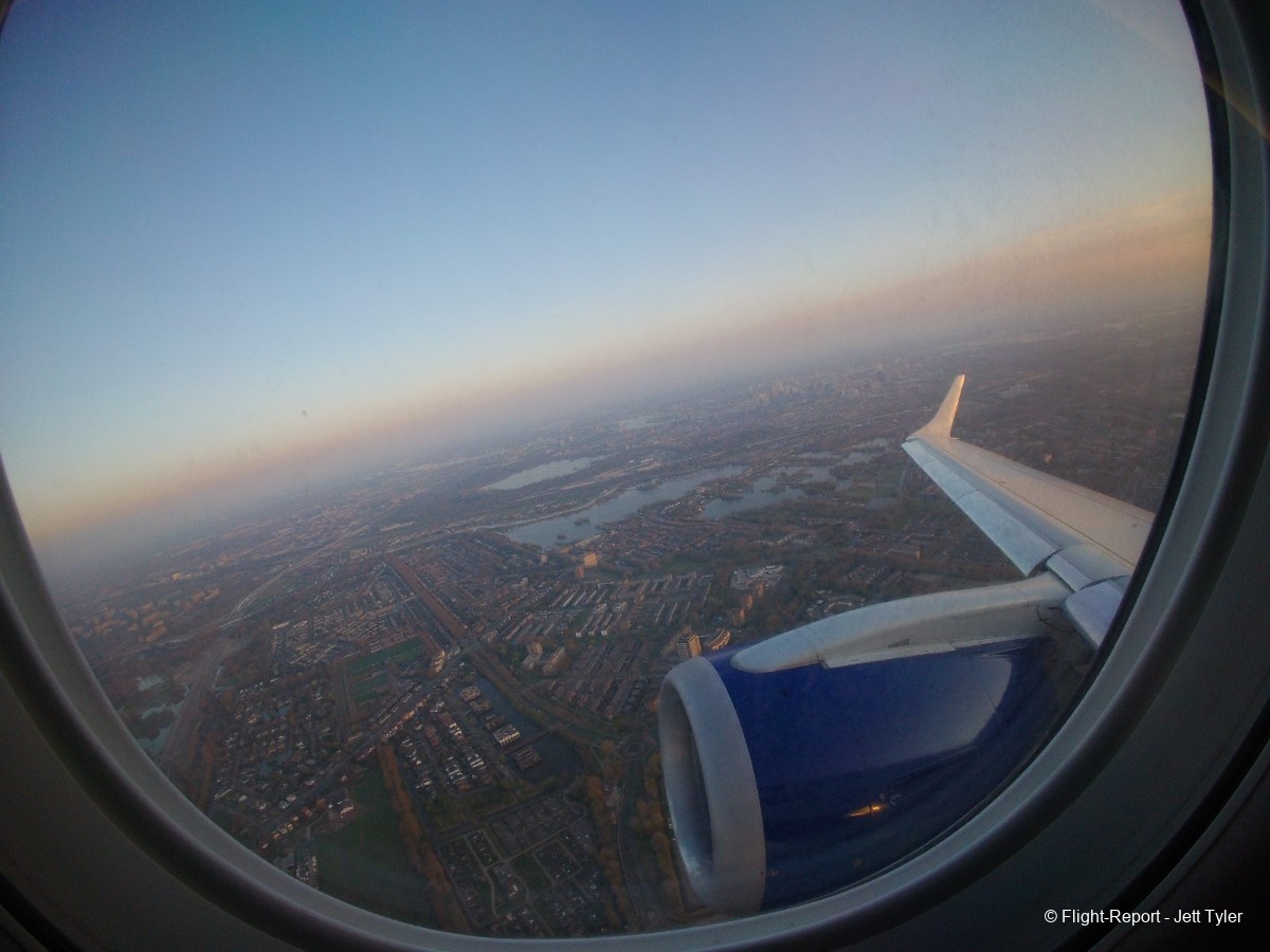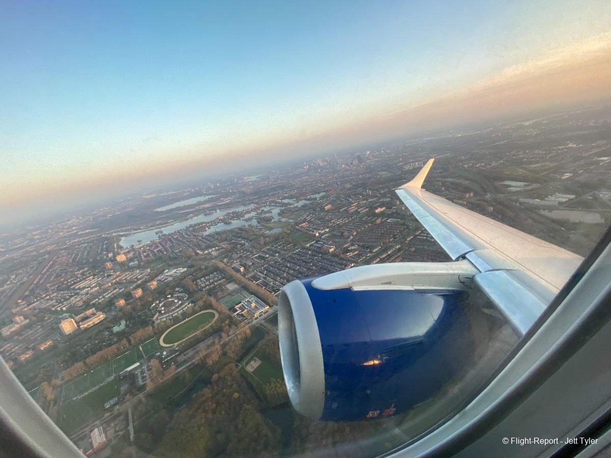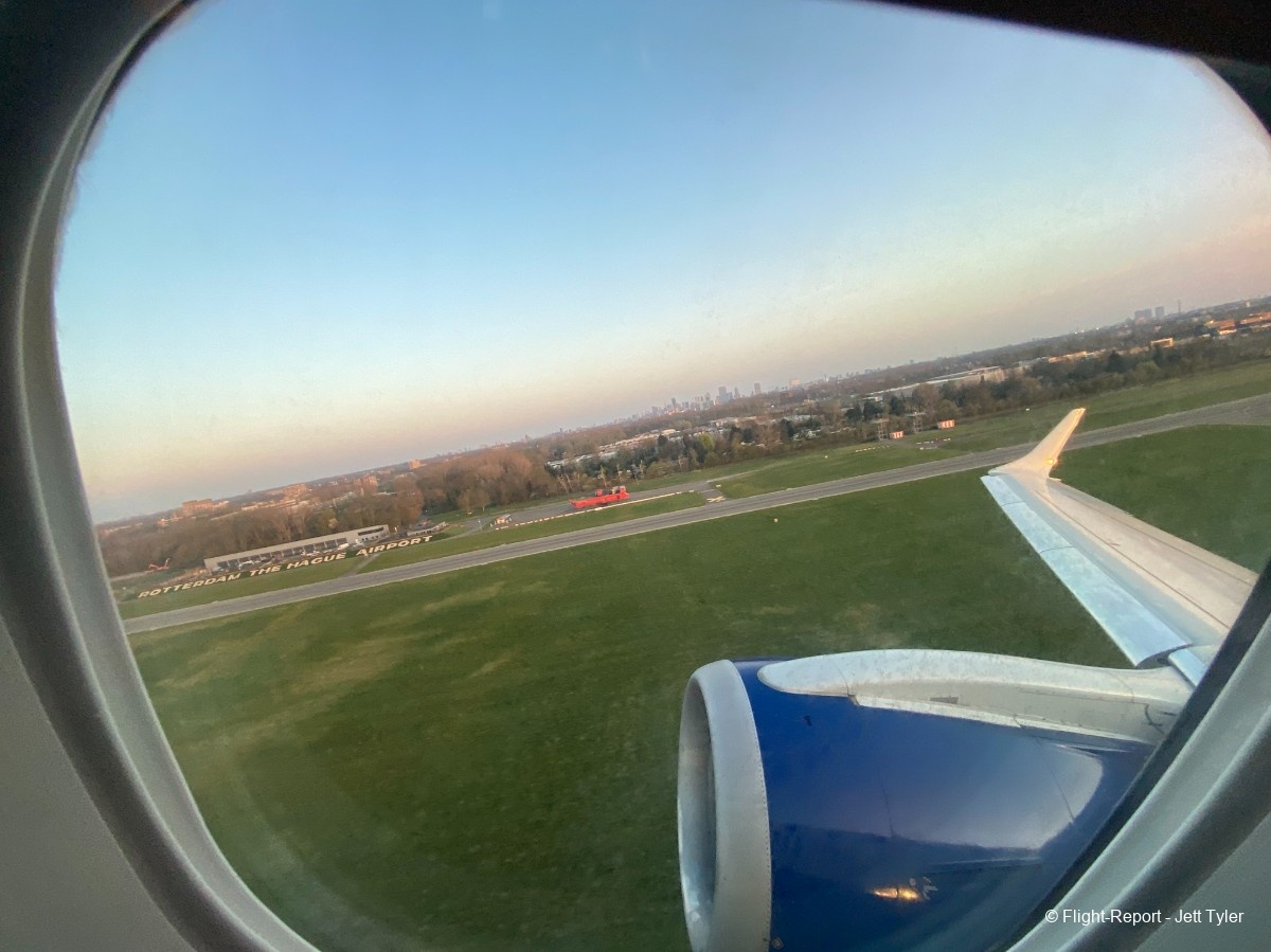 We held by the Runway for a few minutes to allow a Transavia Boeing 737-800 to land and once he was off the Runway- it was our turn to line-up and get going. The take off allowed for some amazing views of Rotterdam on departure, this was going to be a beautiful "Golden Hour" flight as we darted across the North Sea!