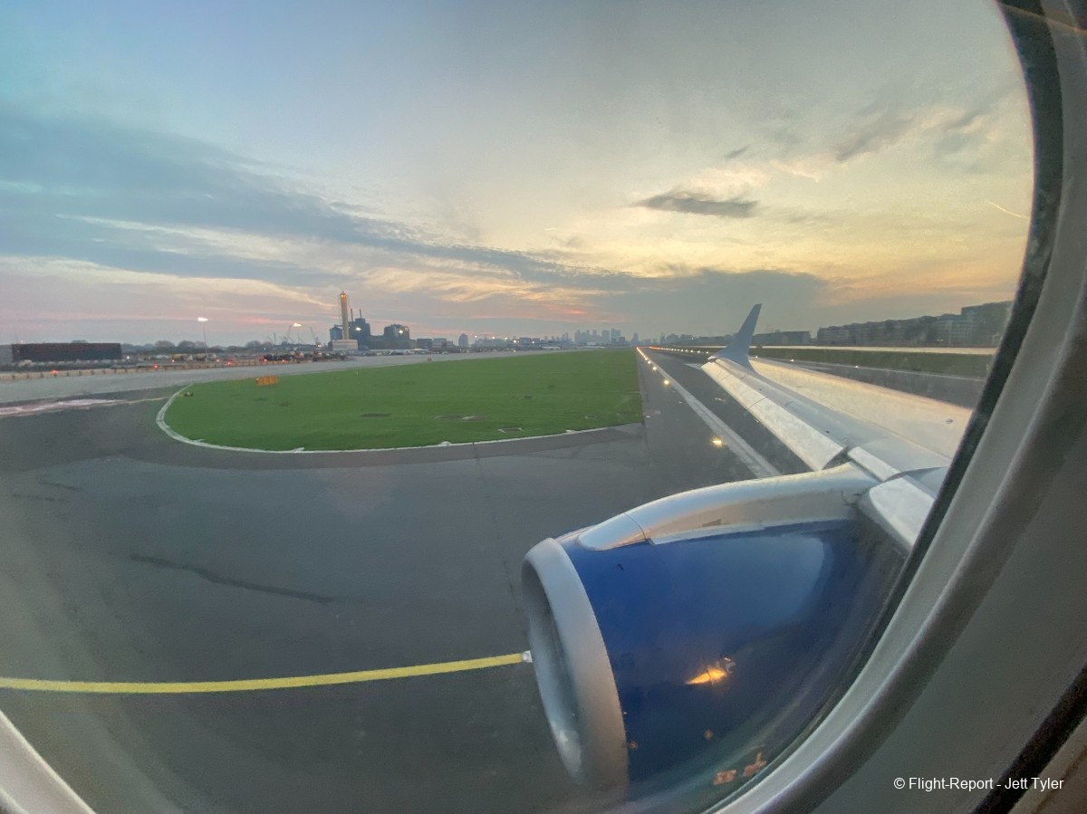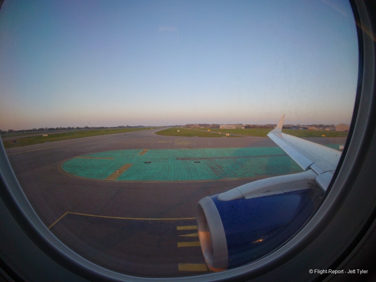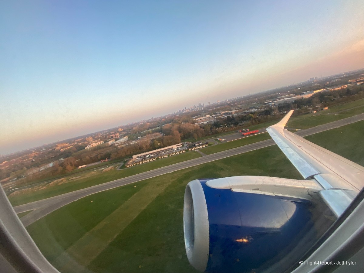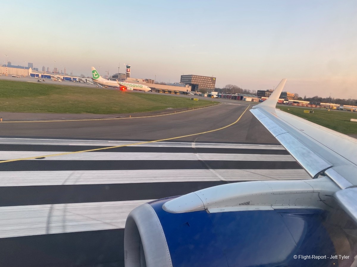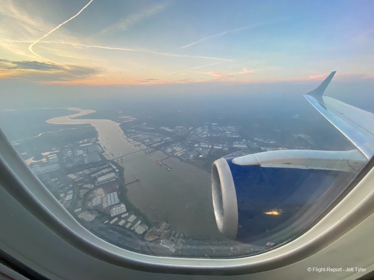 We held by the Runway for a few minutes to allow a Transavia Boeing 737-800 to land and once he was off the Runway- it was our turn to line-up and get going. The take off allowed for some amazing views of Rotterdam on departure, this was going to be a beautiful "Golden Hour" flight as we darted across the North Sea!