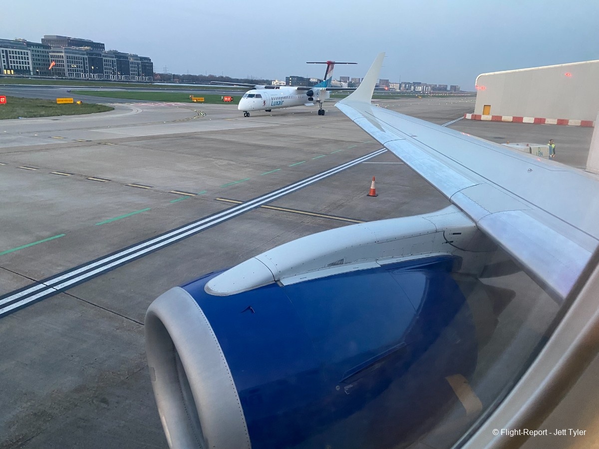 We exited the Runway at the Eastern end of the Runway and back-tracked towards the Terminal for our stand. It was amazing seeing the London Skyline in the distance from LCY, we still had a great bit of "Golden Hour" left as we parked up. As we turned in I saw one last look at the line-up of Embraer ERJ aircraft further up the ramp. As we began to wind down and prepare to disembark- a Luxair Dash 8 Q-400 arrived in from Luxembourg.