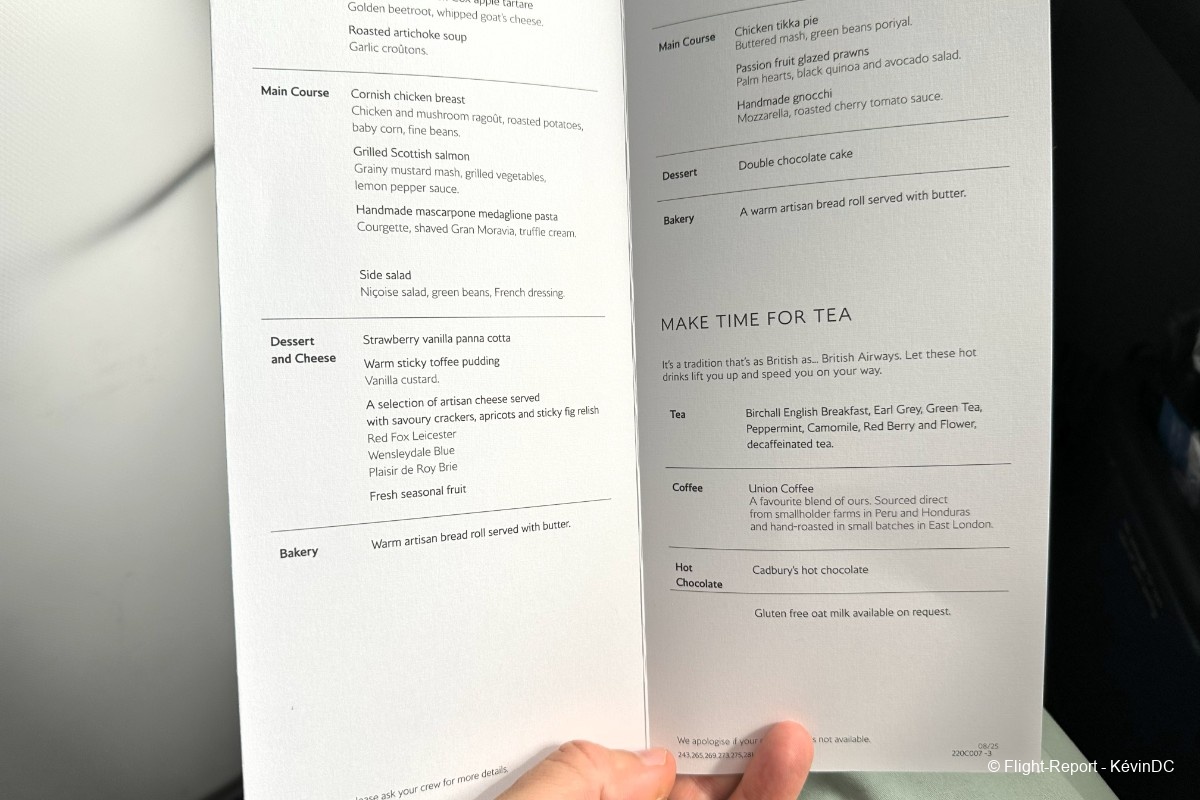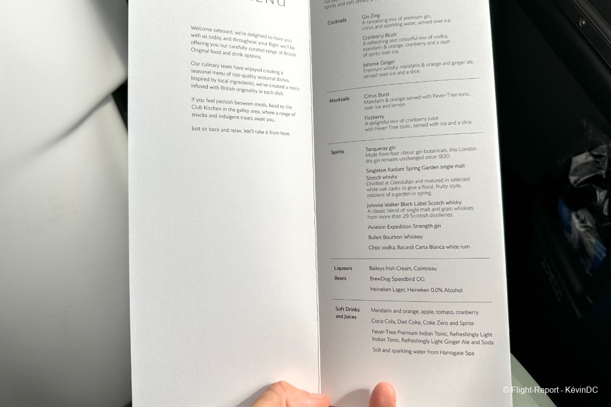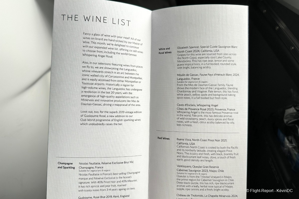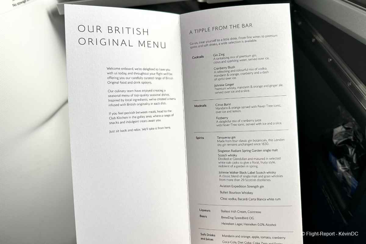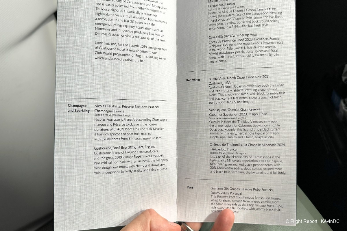 Friendly cabin crew welcome us on board and offer a pre-departure beverage, with the usual choice of water, juice, or champagne.
