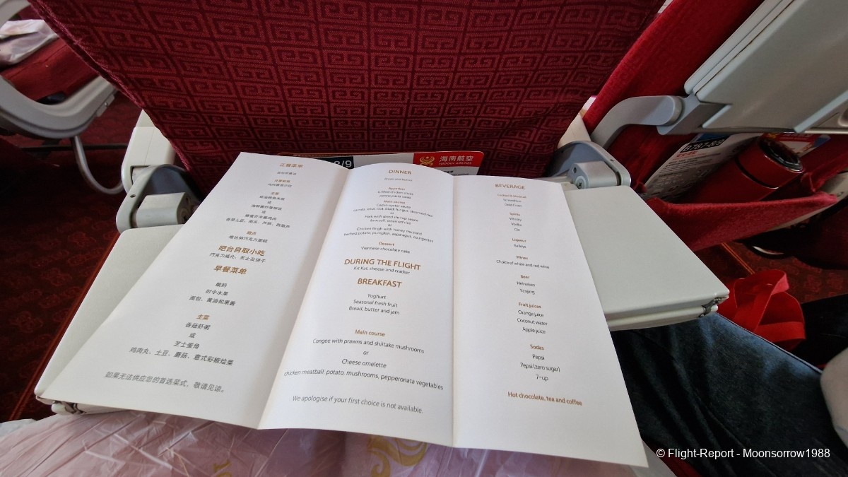 The boarding was easy too, we went with a bus to our Boeing 787-8, parked away. Boarding went smoothly too, despite the usual chaos, when travelling with Chinese nationals. Fun to watch and to experience. The crew immediately gave a friendly impression, and quite a genuine one. A little amenity bag and a menu had been given on each seat: earplugs, sleeping mask, socks and … a tooth brush. Really nice of Hainan Airlines, as I usually "sleep" better after having brushed my teeth.