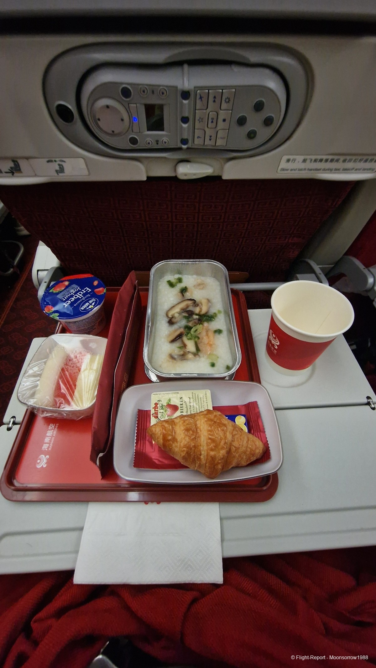 Meal was served about 1h after departure. We had the choice between meat and fish. I also saw to European ladies being served a special meal. I didn't see this option, while checking-in online. Red and white wine, as well as beers were available. And the Chinese teas, which I usually take: jasmine and black tea (red tea in Chinese). The meal was truly good: the chicken salad with pasta was fresh and tasty, the main dish, typical from South China and the Austrian yoghurt more than welcome!
