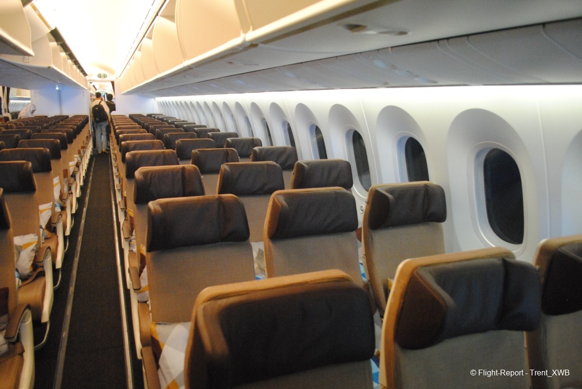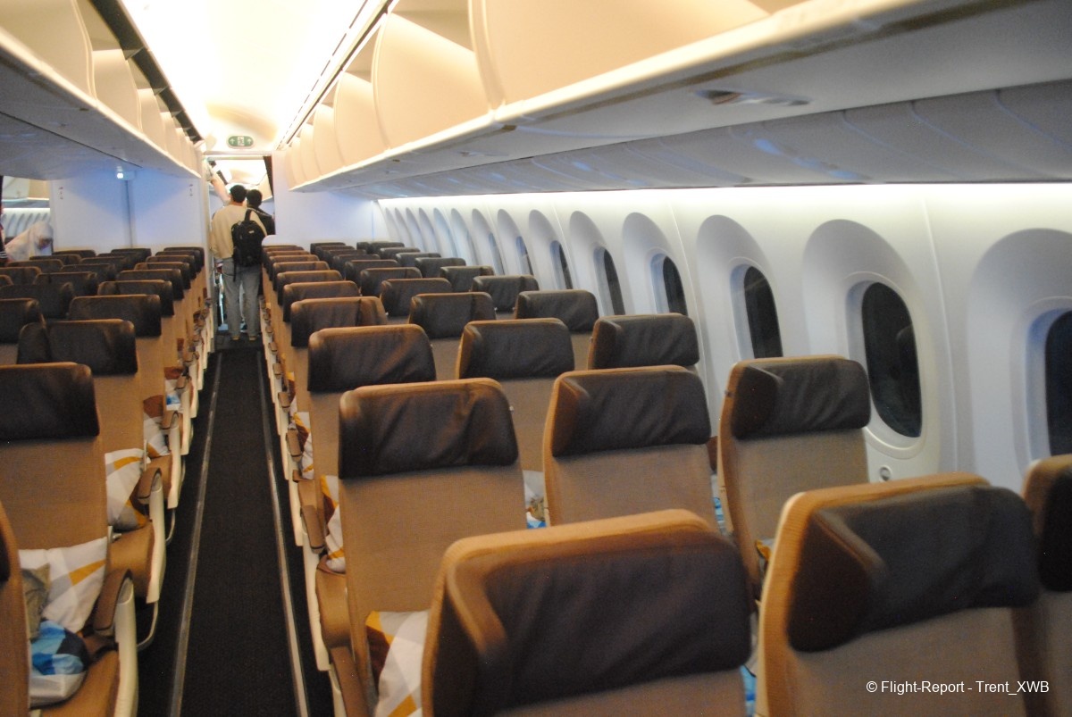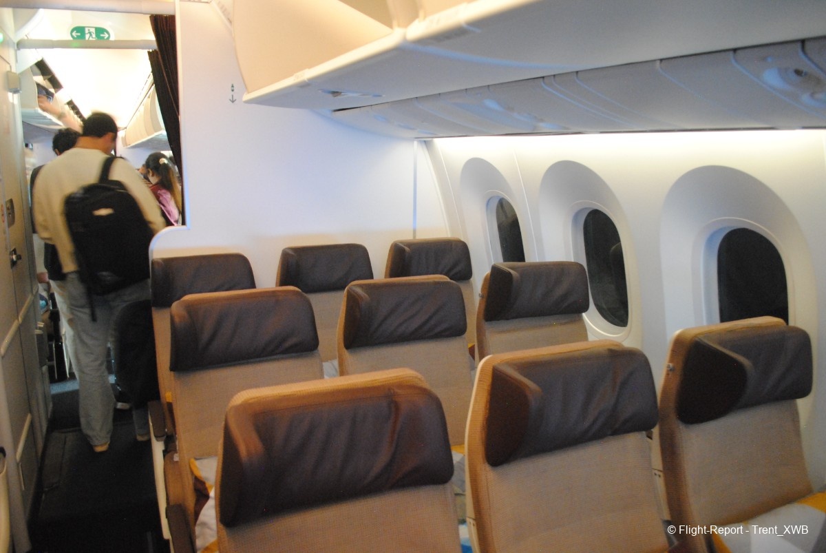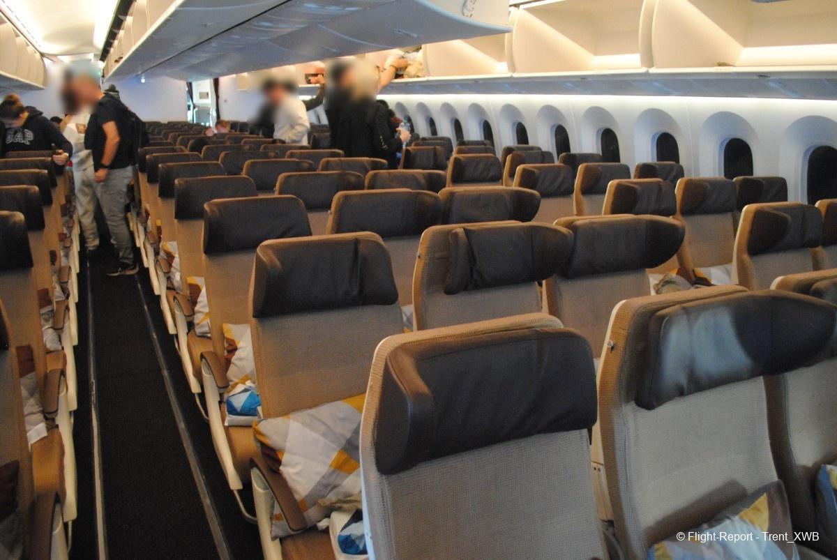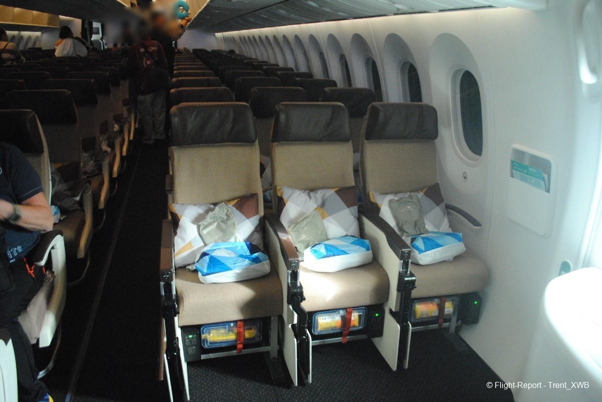 The rear economy cabin. Please notice, as all the Dreamliners traditionally have 2 missing windows in the rear cabin (due to fuselage barrels connection), here the bad row is 44 (photo 6 in the gallery). Due to fuselage tapering, the very last row 49 has duo seats near windows (photo 9 in the gallery).