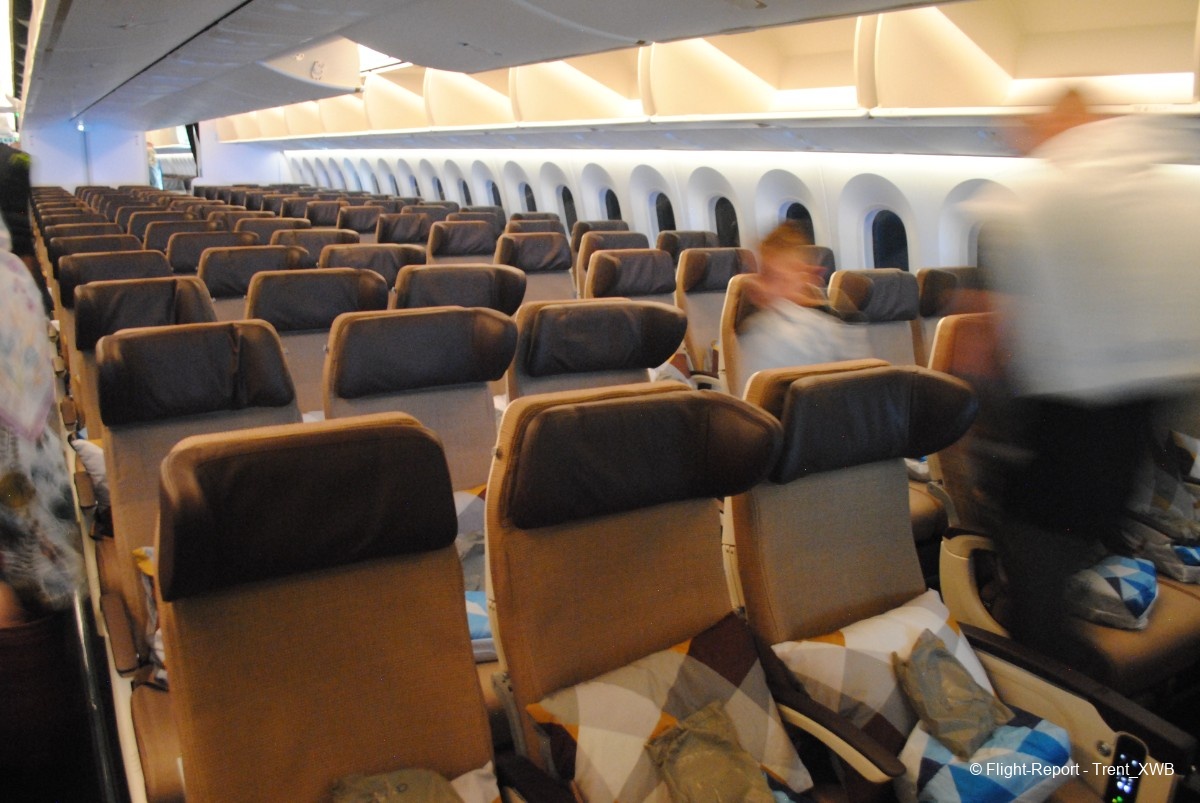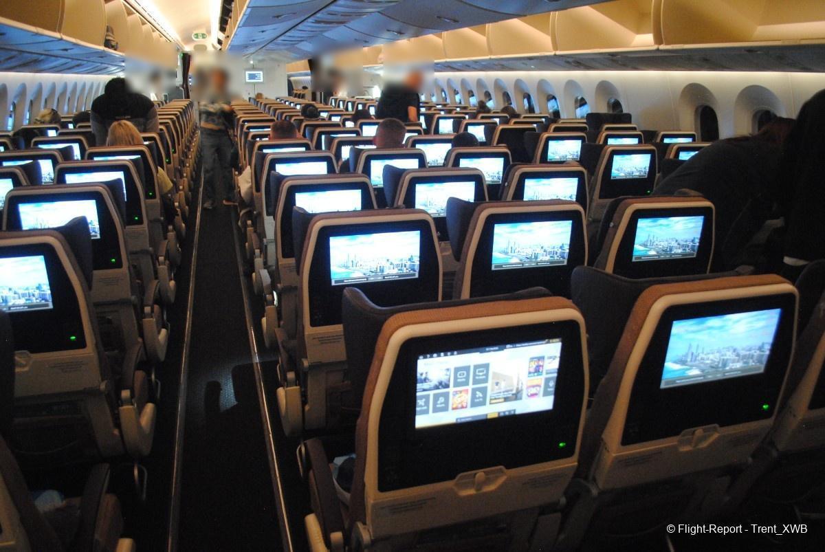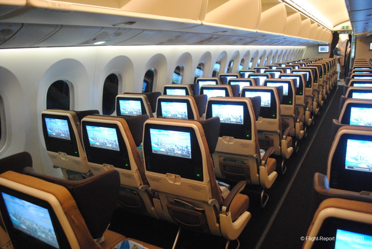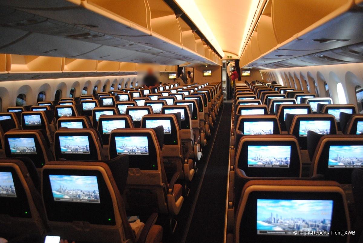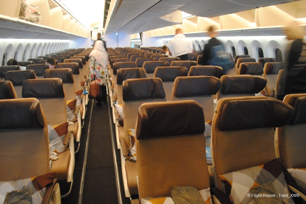 The rear economy cabin. Please notice, as all the Dreamliners traditionally have 2 missing windows in the rear cabin (due to fuselage barrels connection), here the bad row is 44 (photo 6 in the gallery). Due to fuselage tapering, the very last row 49 has duo seats near windows (photo 9 in the gallery).
