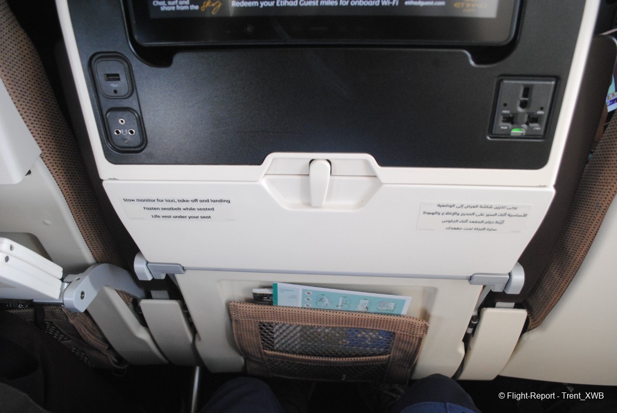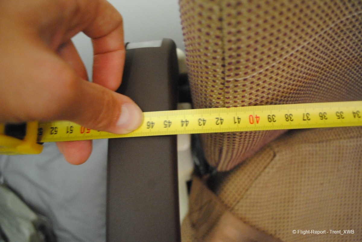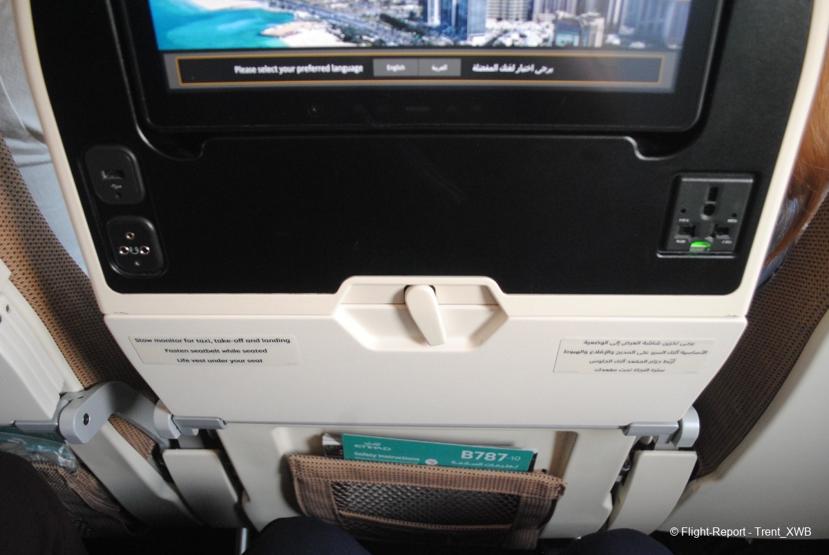 The seat model is Safran Z300 of the latest generation. Whereas I praise Z300 model for its high level of comfort and ergonomics, in this case EY obviously was greedy for padding, and the seatback felt hard (though, not as hard as Z400 one in ITA's A339). The seatwidth between armrests is impressive (for 3-3-3 Dreamliner) 17.6", though, it comes for the expense of armrests' width, which is very humble, making them decorative.