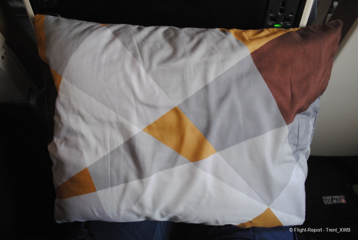 The seat has adjustable headrest (with one "wing" fixed), modern IFE with big screen with adjustable angle, universal power socket, USB port and headset port under the screen, bifold tray table and seat pocket. The row pitch is standard, which is OK for me. Waiting on the seat are pillow, blanket, headset…