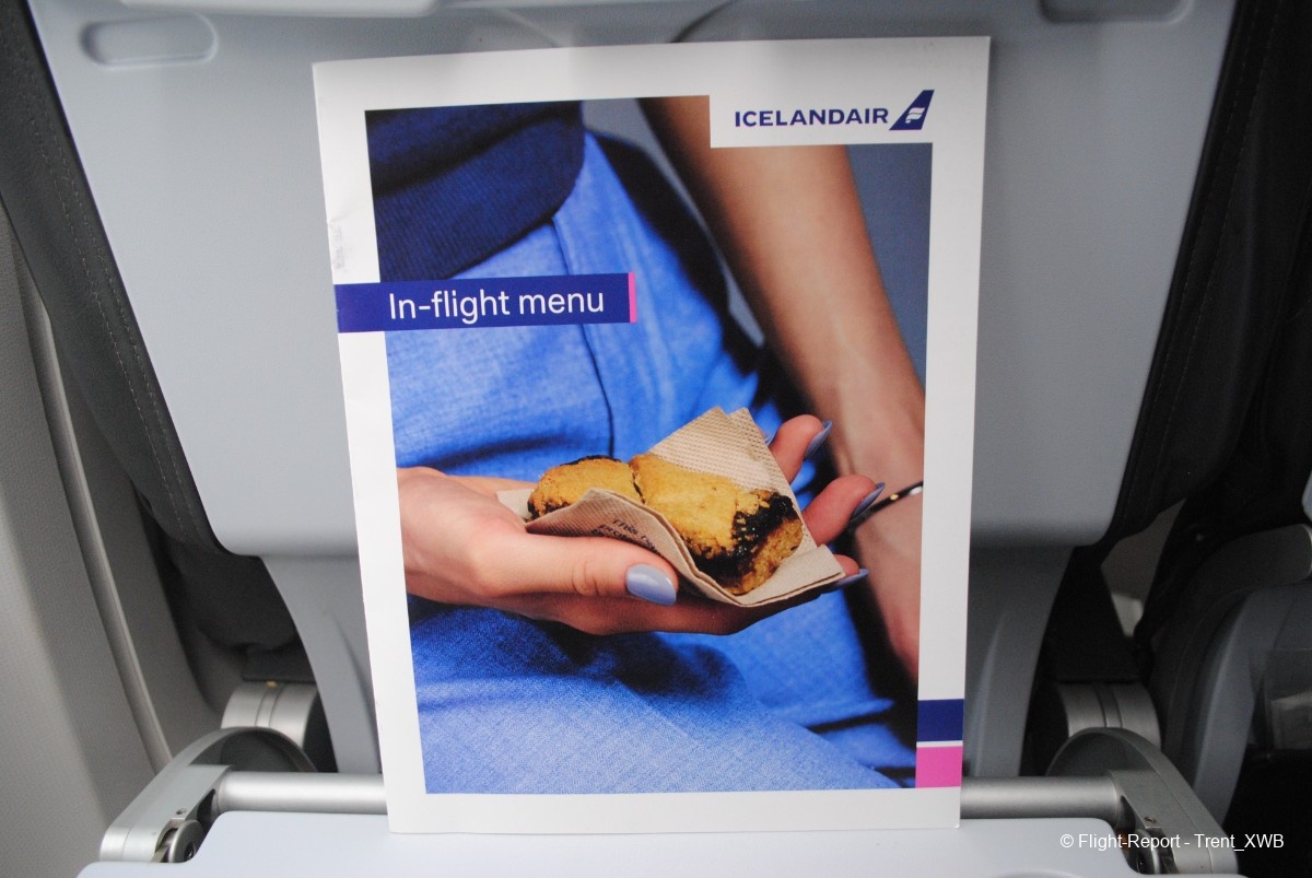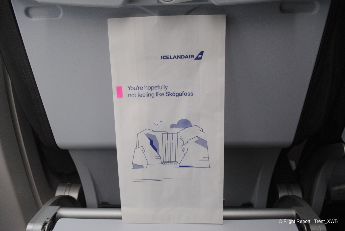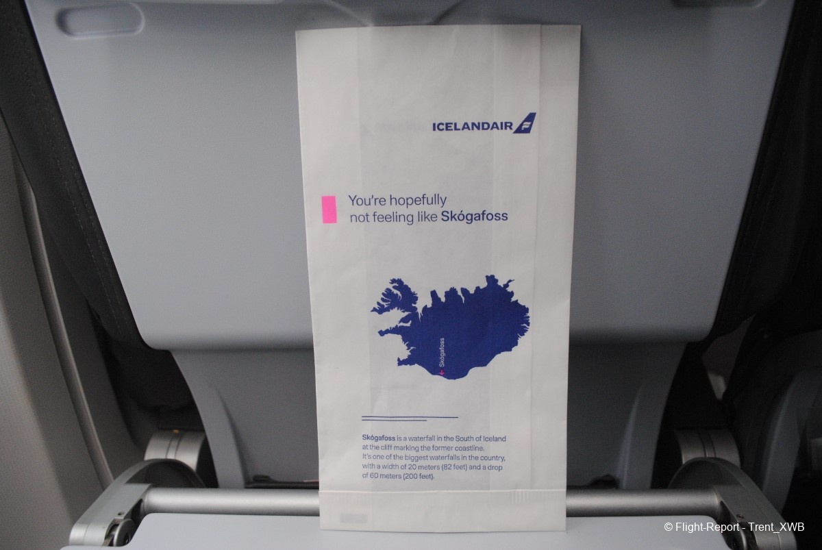The content of the seatpocket is safety card, inflight menu and waste bag with Icelandic humour.