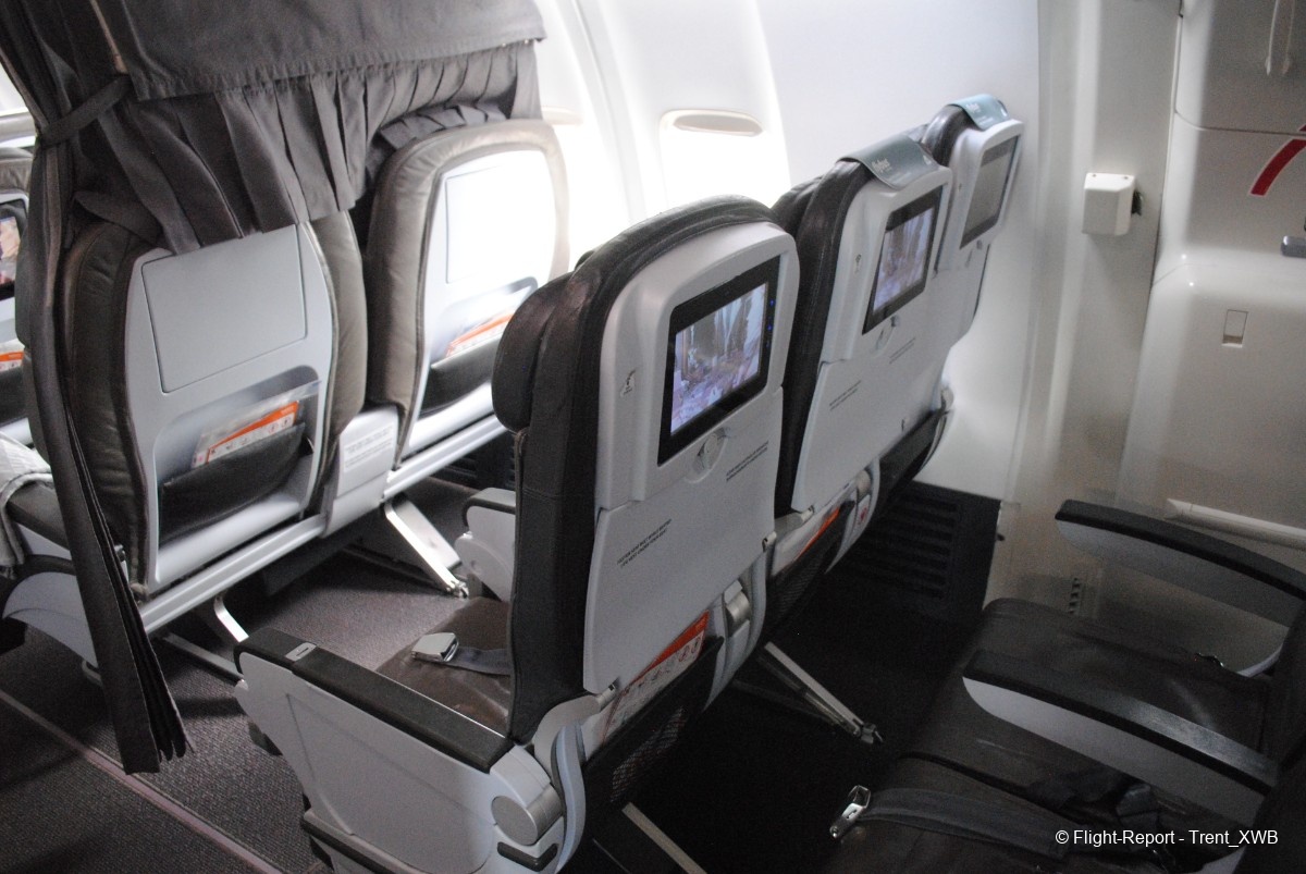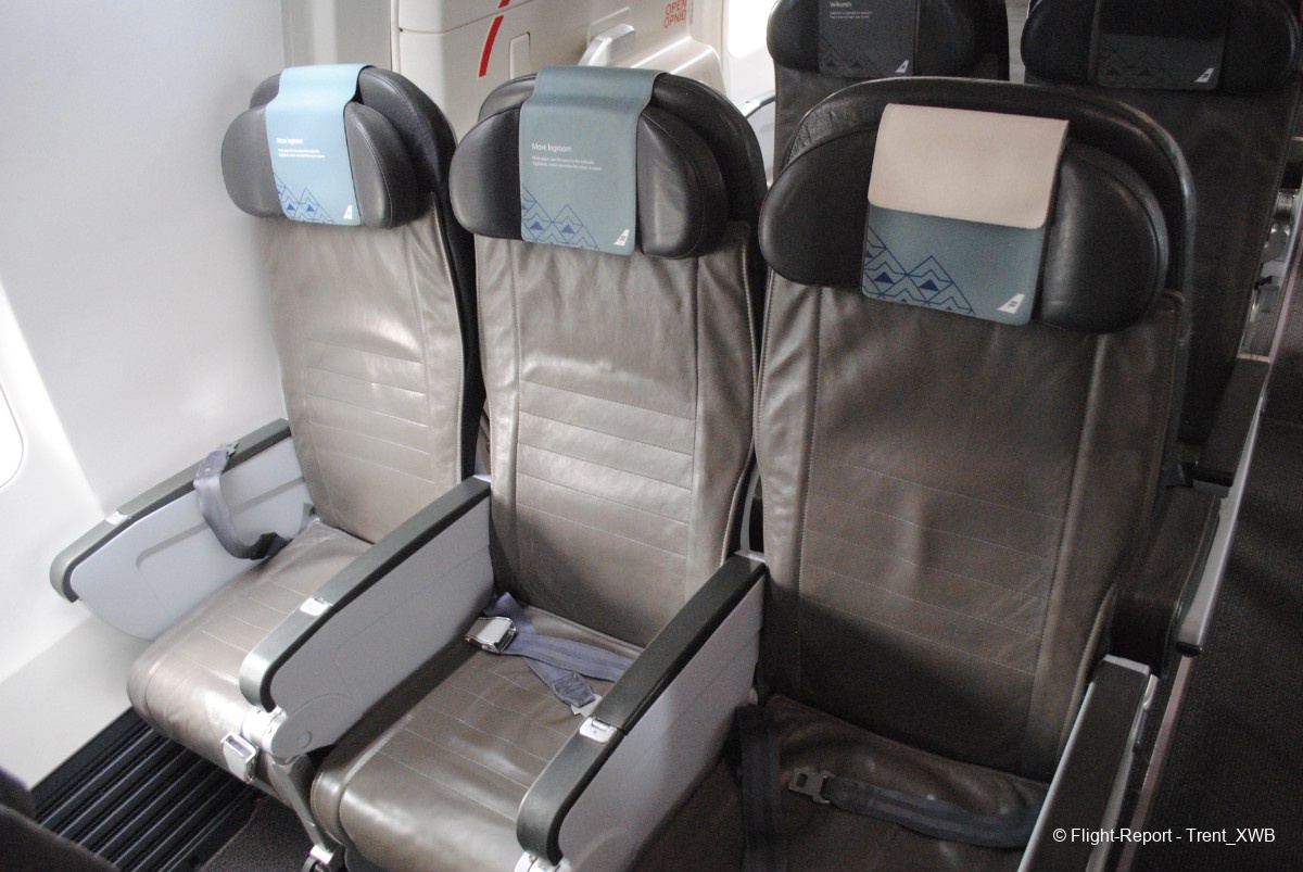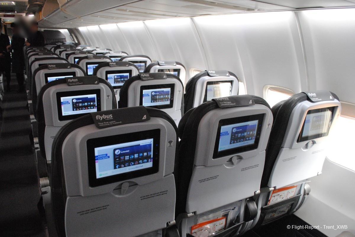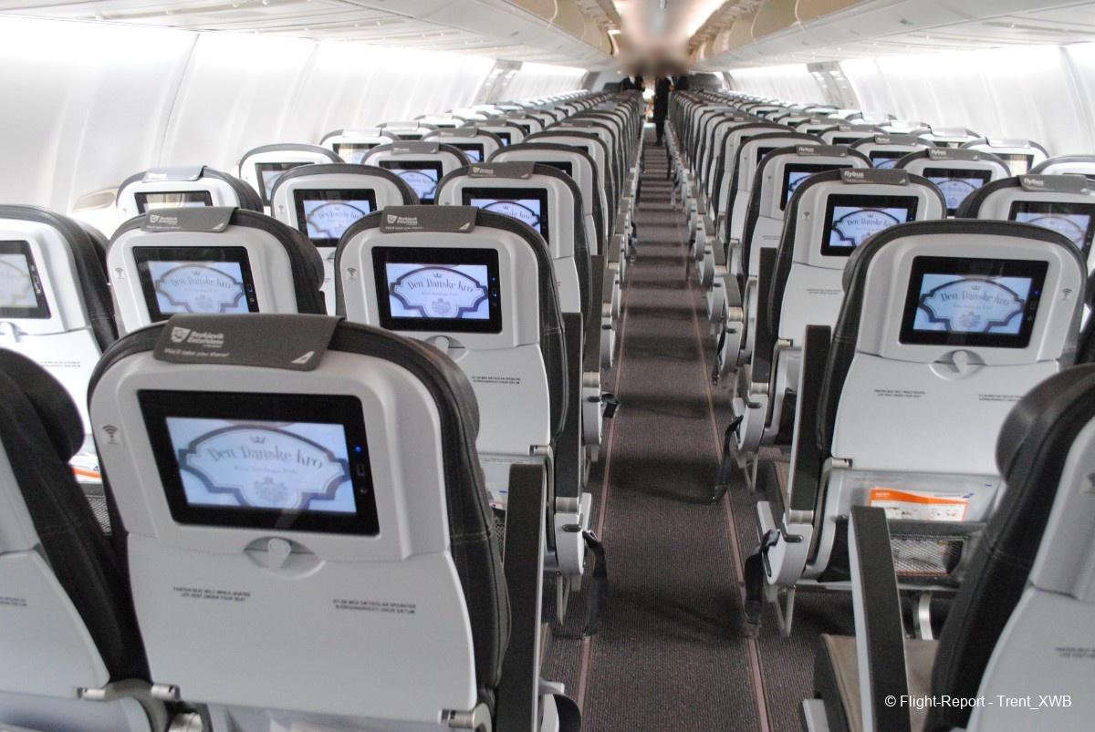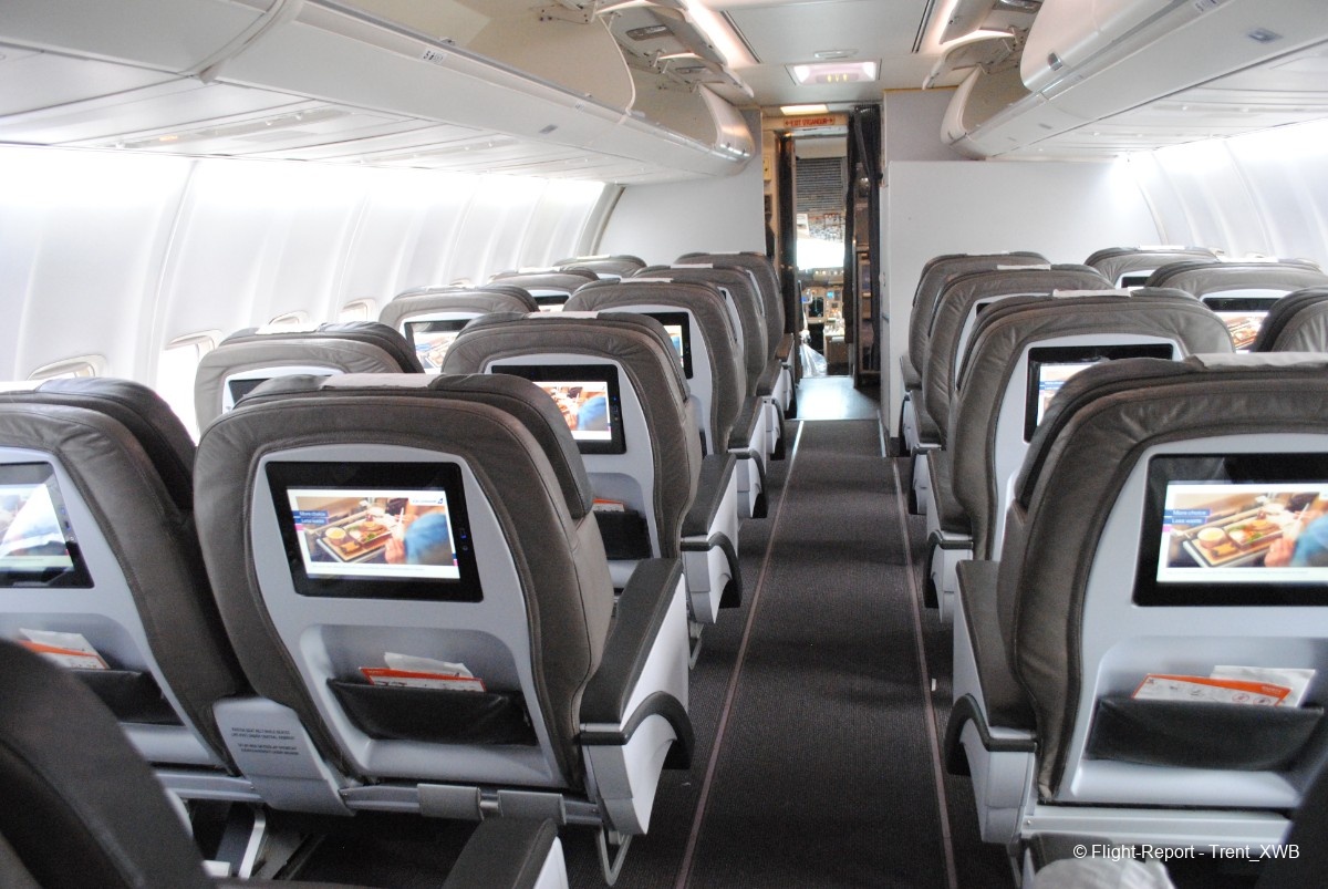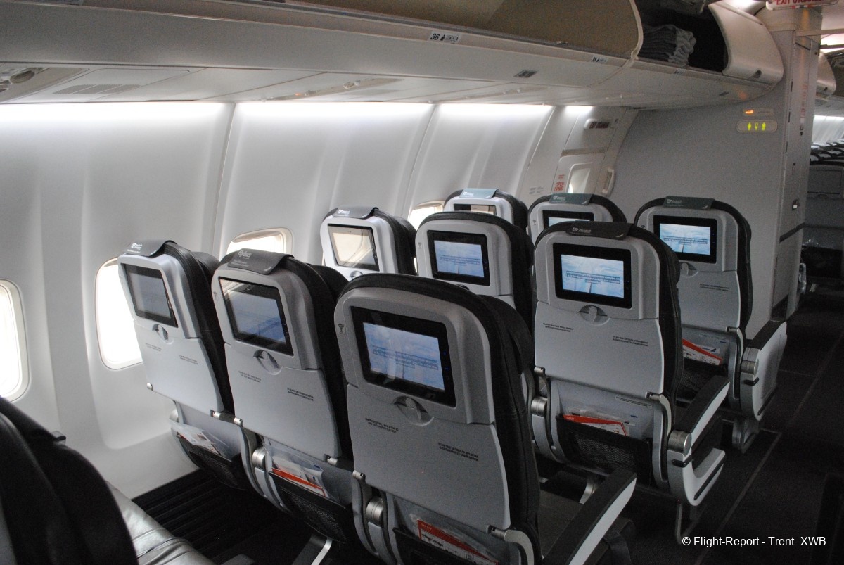 The economy class consists of 203 seats in 3-3 layout, distributed between 2 cabins: the very long front one between 2L/R and 3L/R doors and the smaller rear one between 3L/R and 4L/R doors.