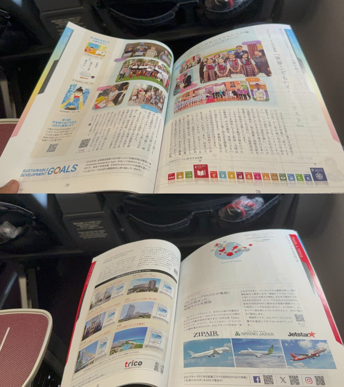 I was pleasantly surprised to find JAL’s physical inflight magazine, Skyward, in the seat pocket. Most of it was Japanese, of course — read in print from right to left — but the ‘back’ (what we call the front) had a few articles in English and Chinese, though only 15 pages. While it goes without saying that it wasn’t too Westernised, I still enjoyed leafing through the pages, and especially the fleet page or ‘Airplane Collection’! (Full resolution here.)