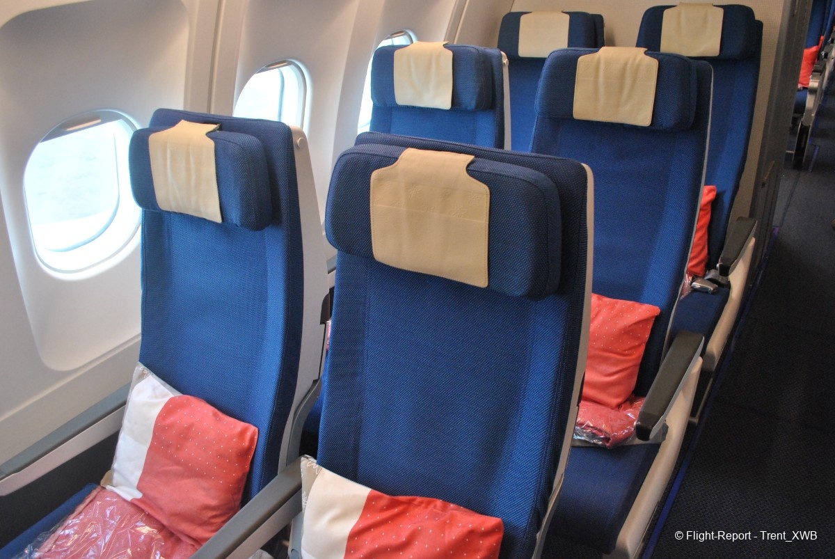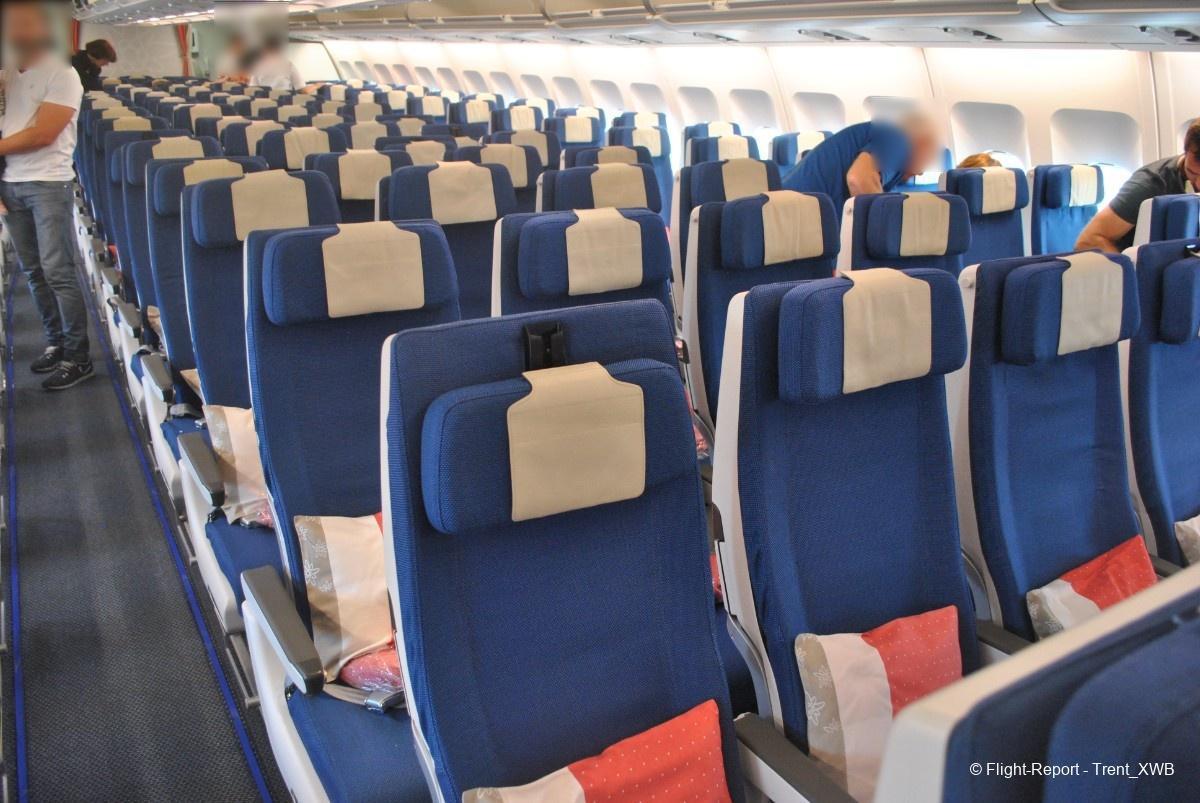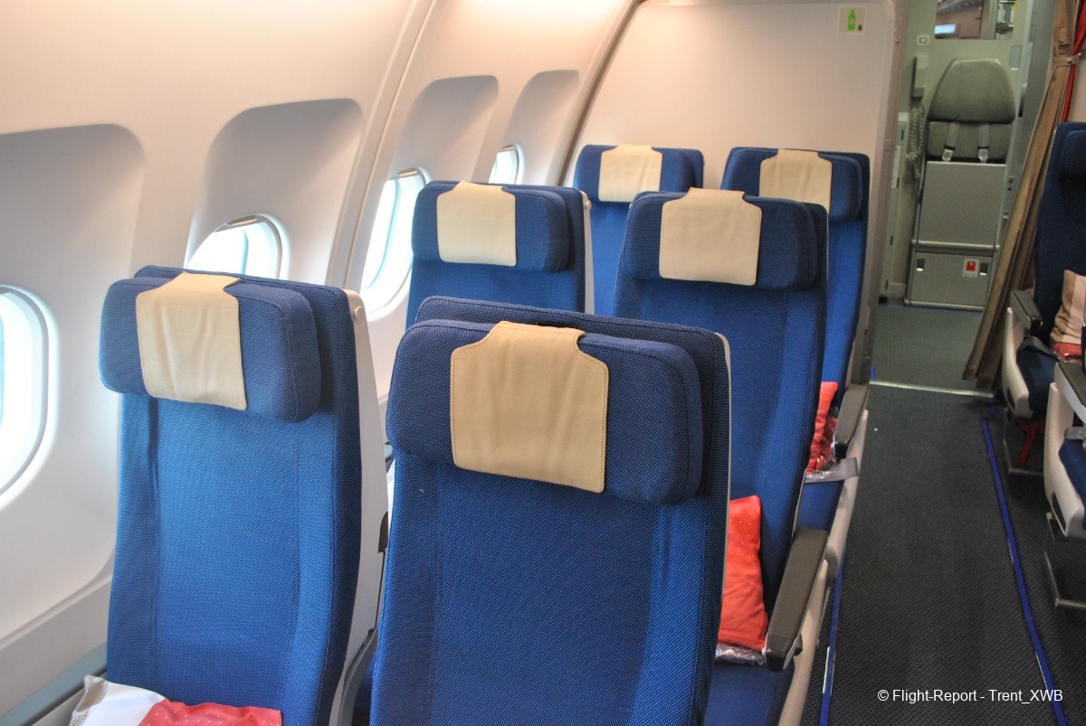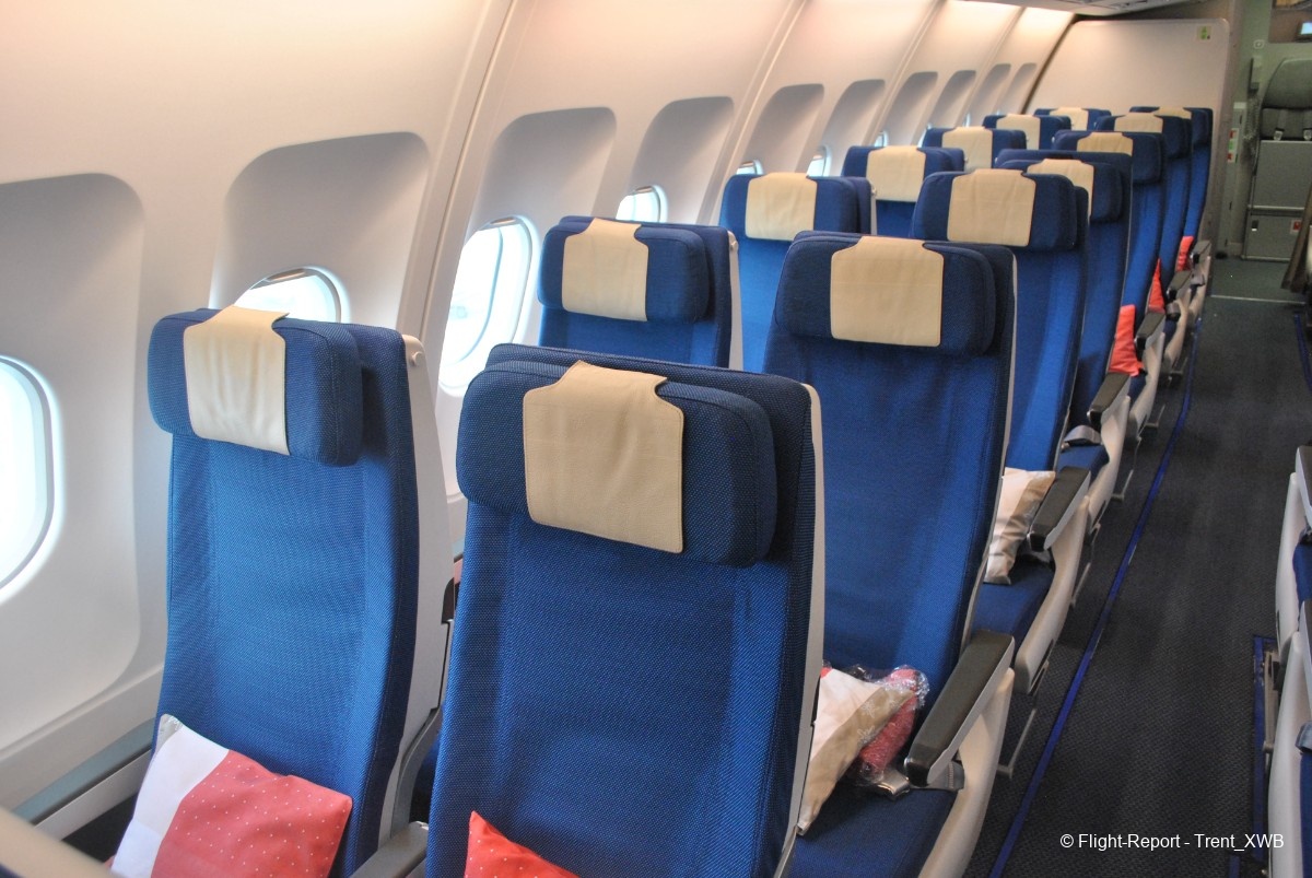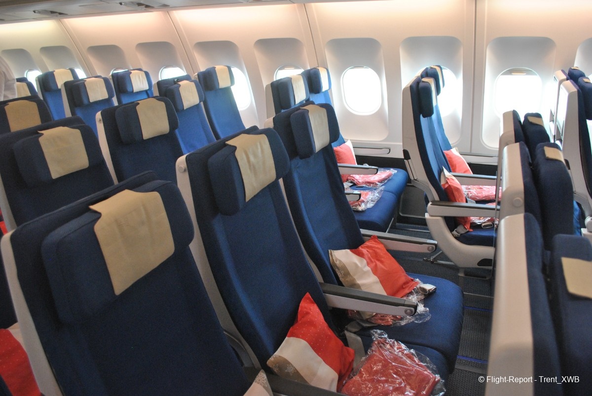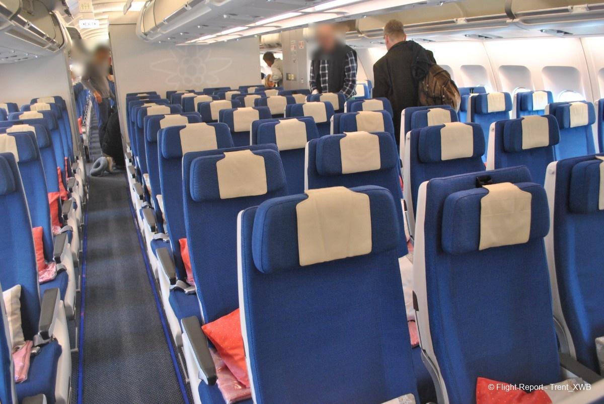Due to very nonstandard location of the business cabin, economy class, having standard 2-4-2 layout, consists of 3 cabins. The front one, consisting of 76 seats with increased pitch (kind of "economy plus") is located in the very front of the plane between 1L/R and 2L/R doors. The regular economy has 211 seats, distributed between 2 cabins: the middle one between the business cabin and 3L/R doors, and the rear one between 3L/R and 4L/R doors.