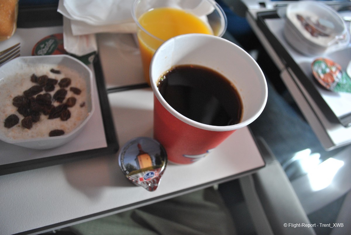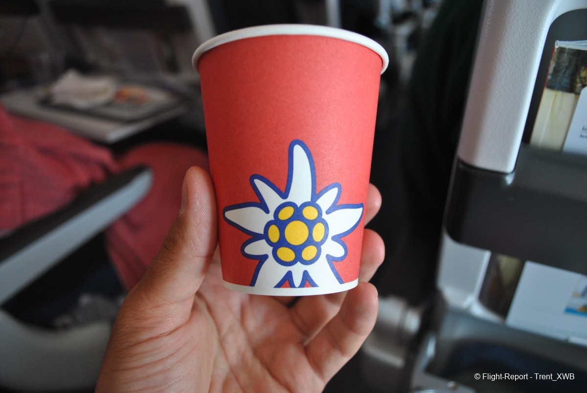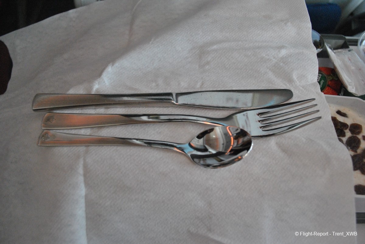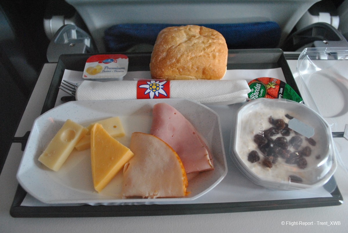 The breakfast is served. No hot dish, but good selection of Swiss cheeses, slices of meat, youghurt with musli, bun, butter and jam. The cutlery is metallic. Coffee is served in WK-branded cups. A bottle of Swiss water is also given.
