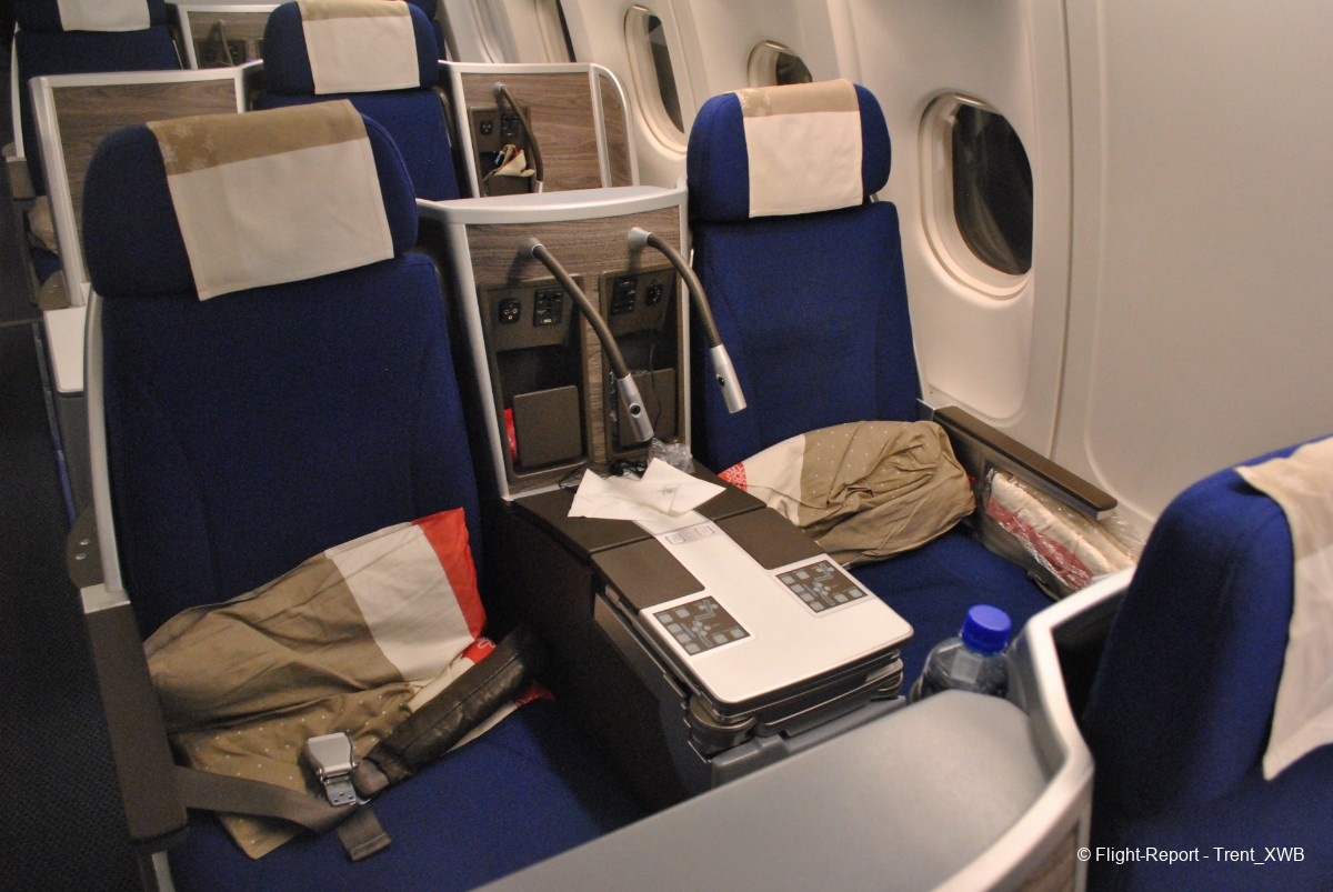 The overhead panel is standard for ancient A343/A333/A332 with no personal airvents. Notice that here one lamp position is reserved for possible ultratight 3-3-3 layout (if WK decreased seatwidth by just 0.5", it would've been able to fit these Recaros in 9 abreast).