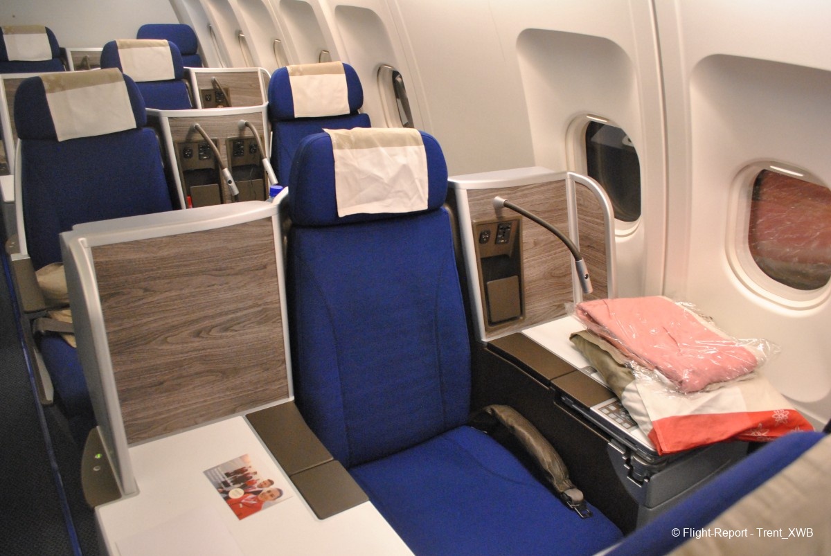 To the right from 2L door (yes, you read right: to the right!) there is the business class cabin, consisting of 27 Thompson Aero Vantage seats in very nonstandart asymmetric 1-2-1 / 2-2-1 layout (making some seat on the left side kind of "thrones", which will be shown further). I guess such location of the most premium cabin in the middle part of the plane has something to do with the weight balance (probably these seats are too heavy). The other cases when the most premium cabin is not located in the very front part of the plane, are Air China's B748s and (the last remaining) B744 (but in CA's case, as one can clearly see from the schemes, the main reason is the vast size of the first class suites which simply don't fit in the tapered Jumbo's nose).
