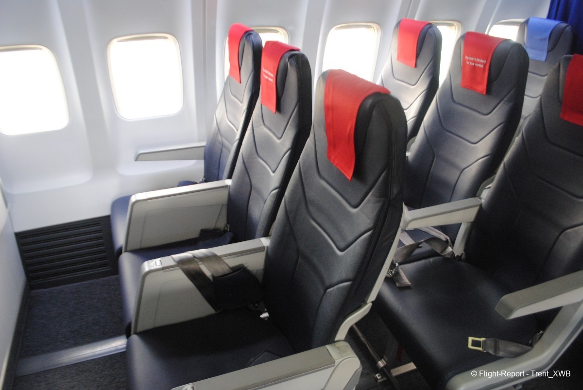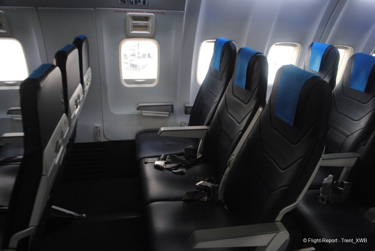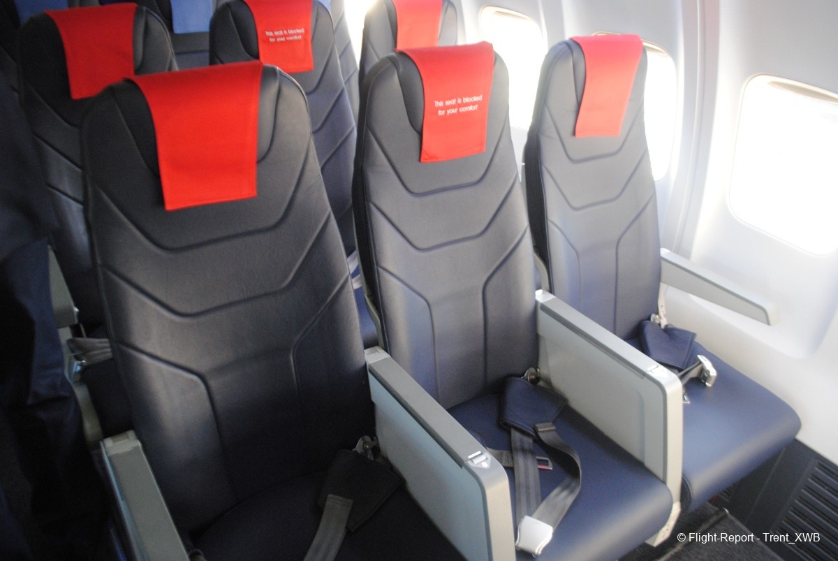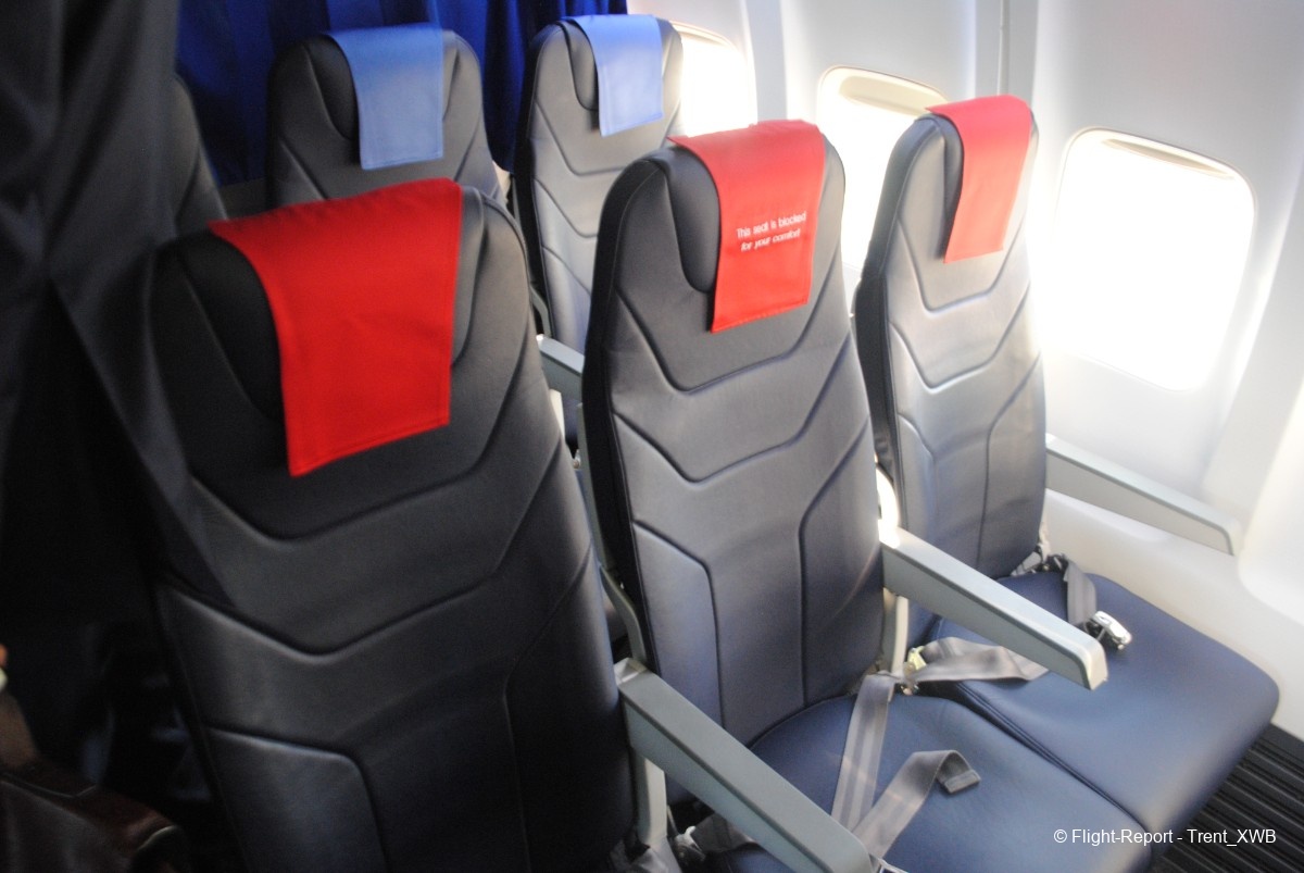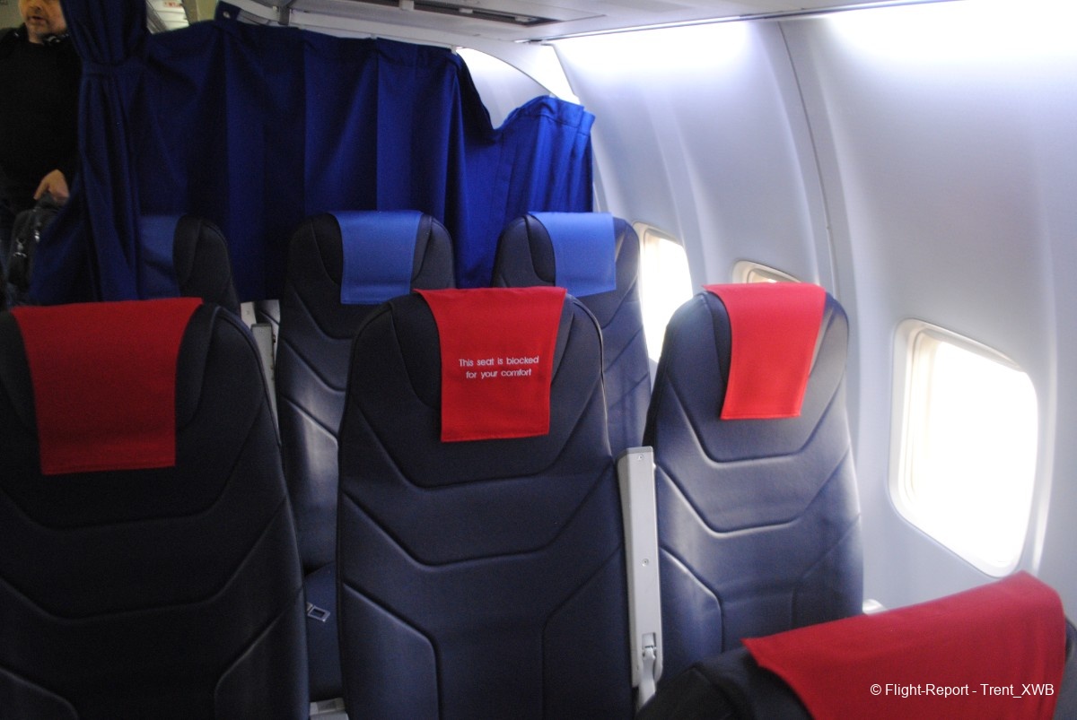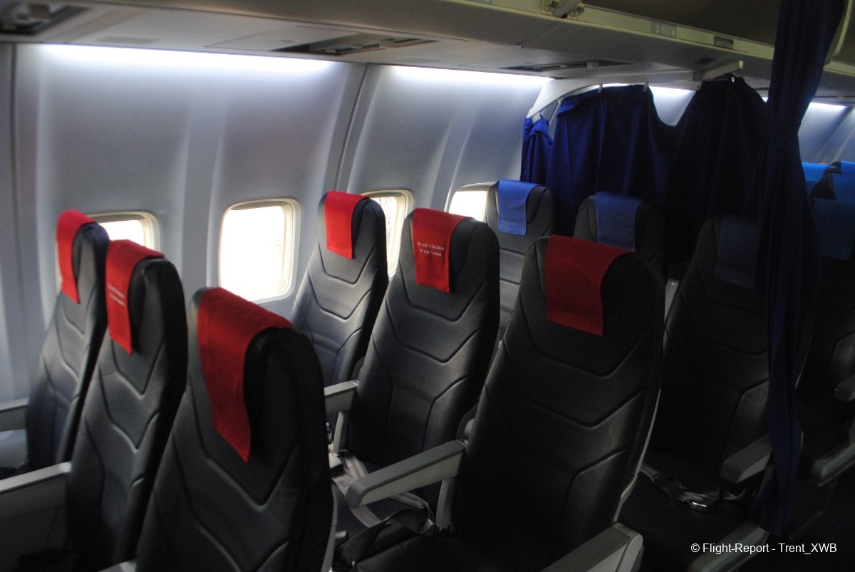 Some views of the all-economy cabin during boarding. The first two rows (red antimacassars) were kind of "priority" ones, with the first one, as usual, being "extra legroom".