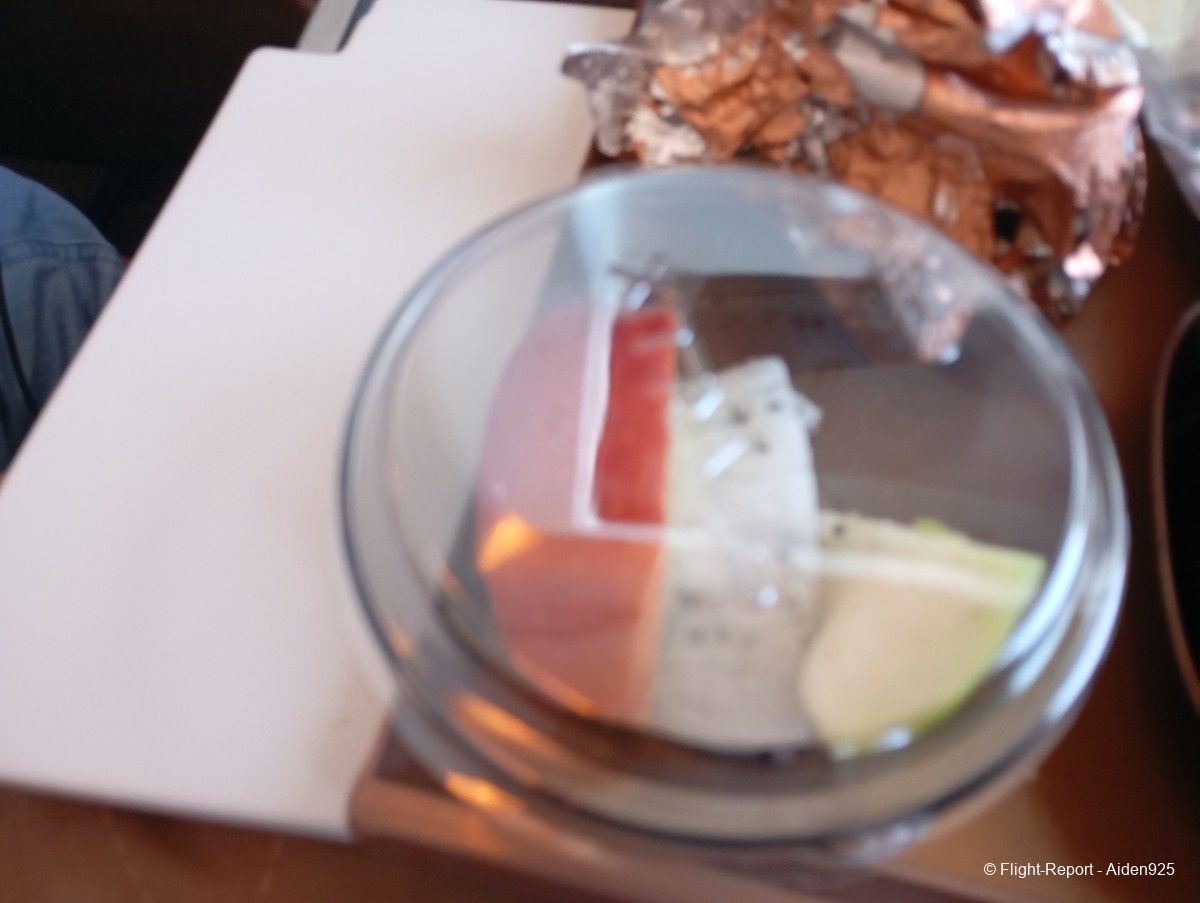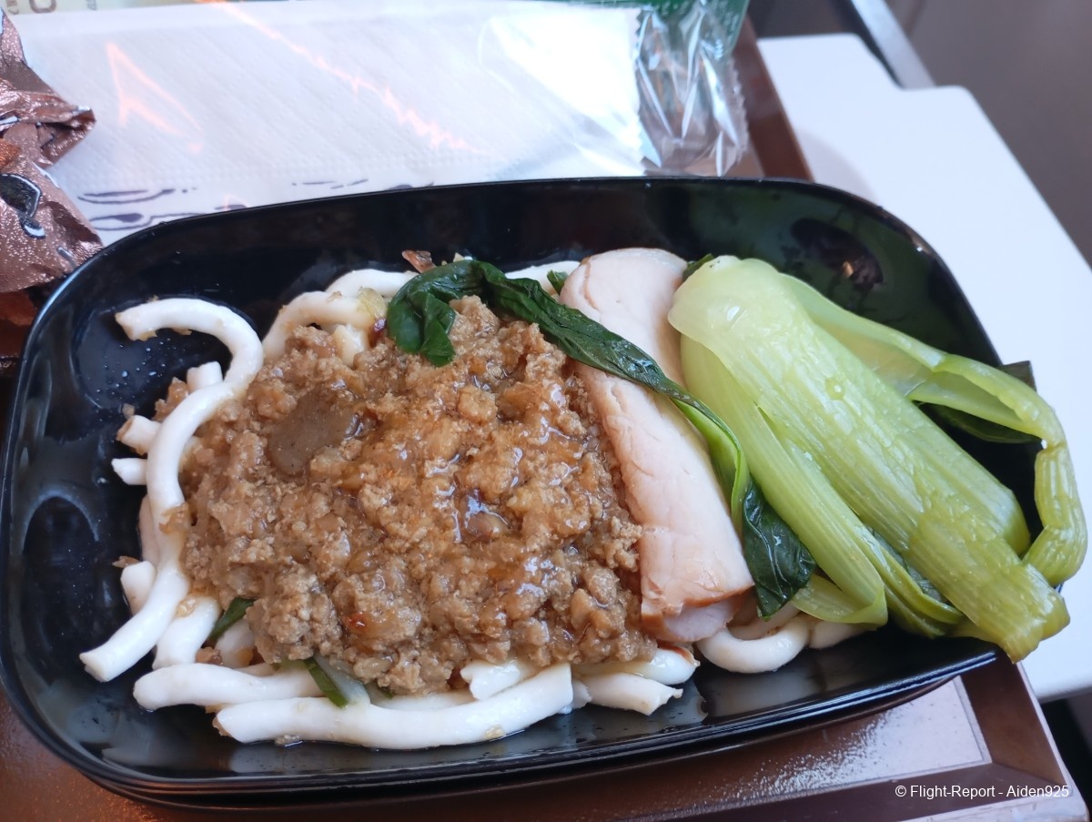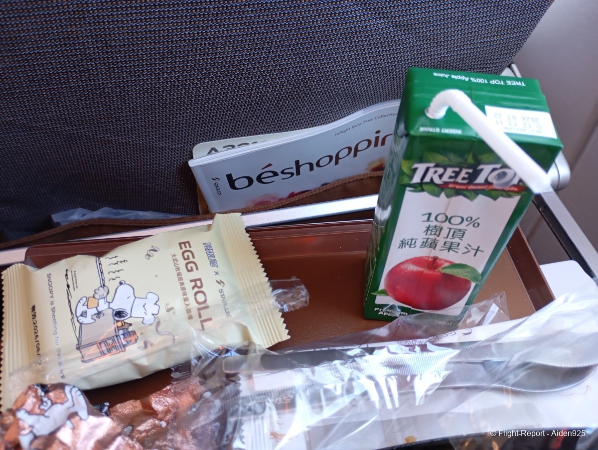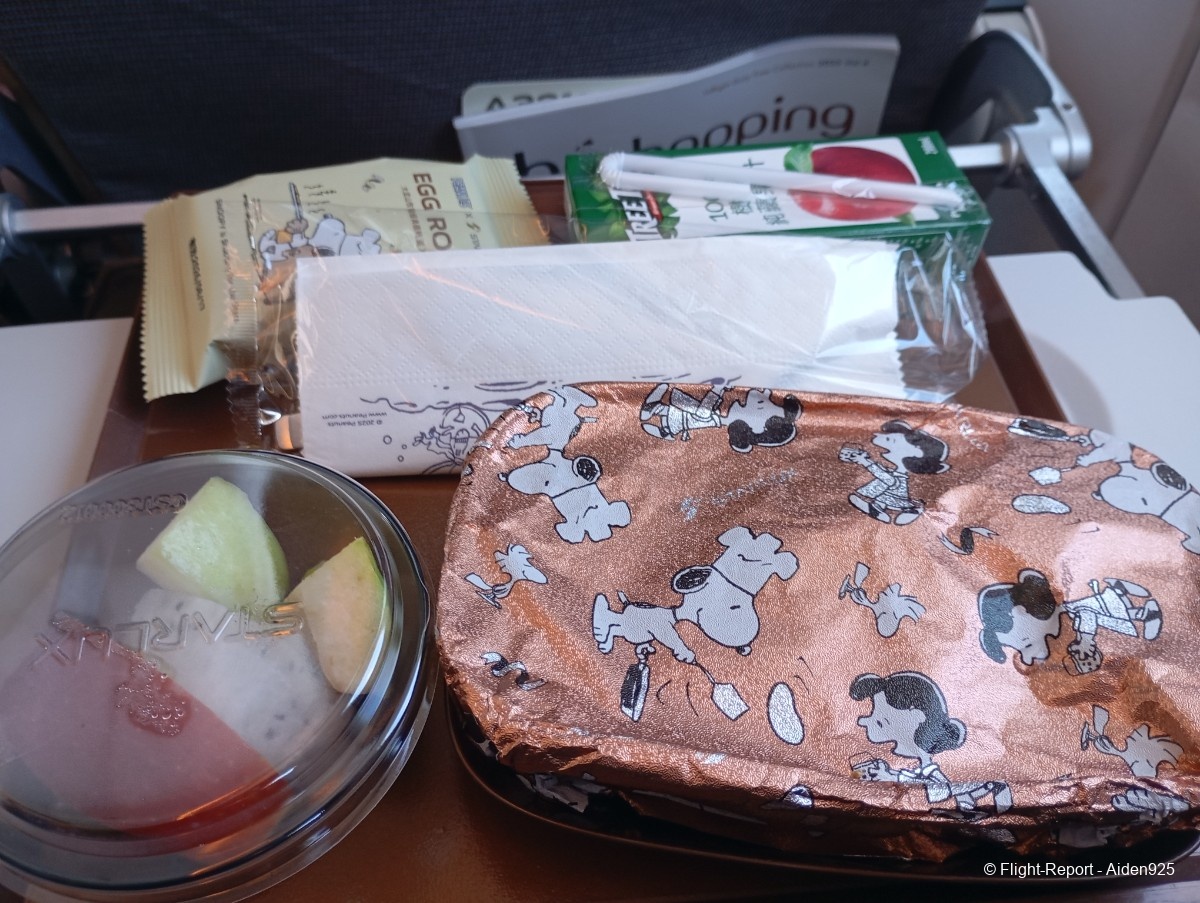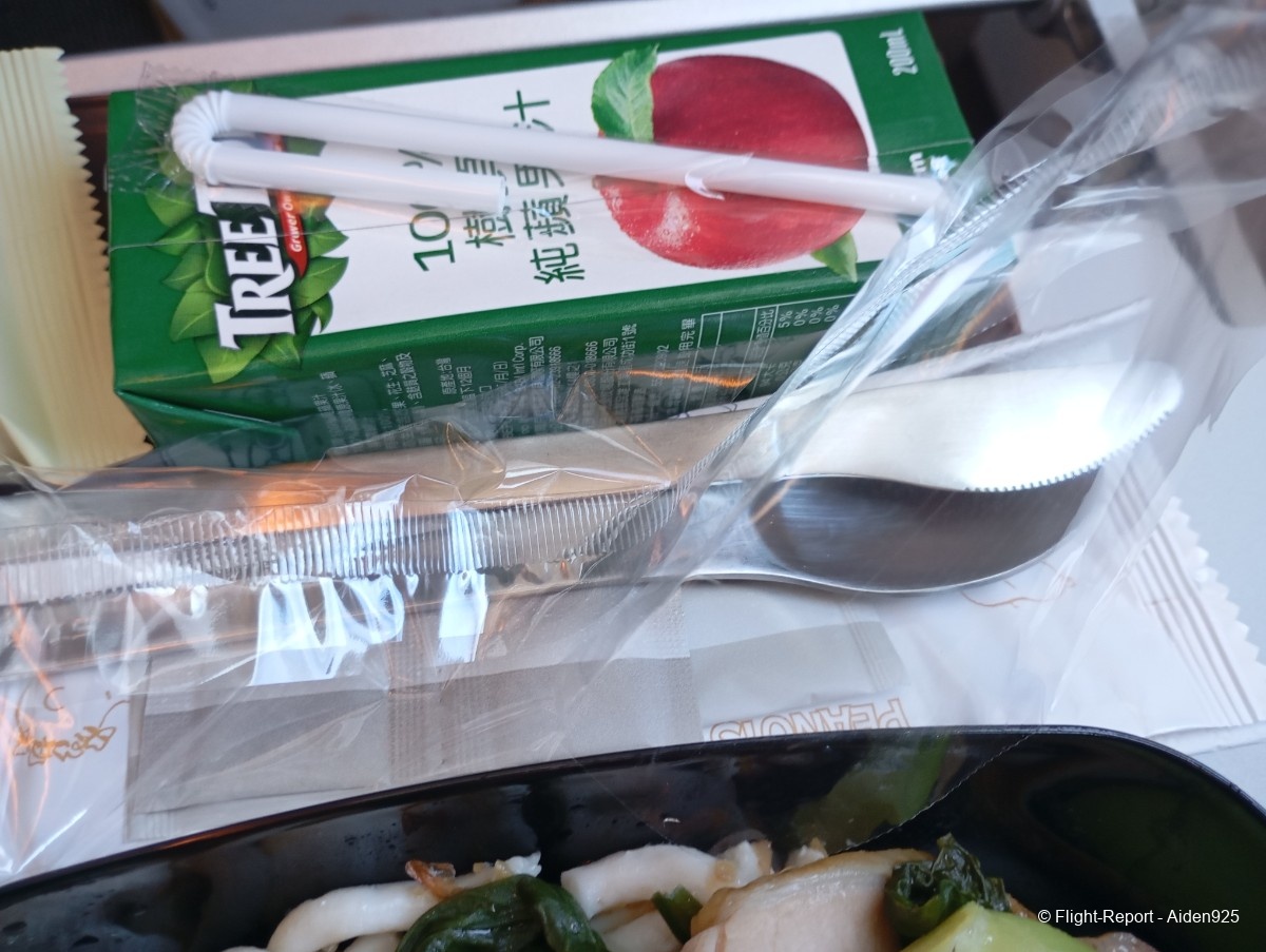 Around 10 minutes after departure, the meal service began. We were served some sort of noodles along with fruit, apple juice, and a bag of egg rolls.