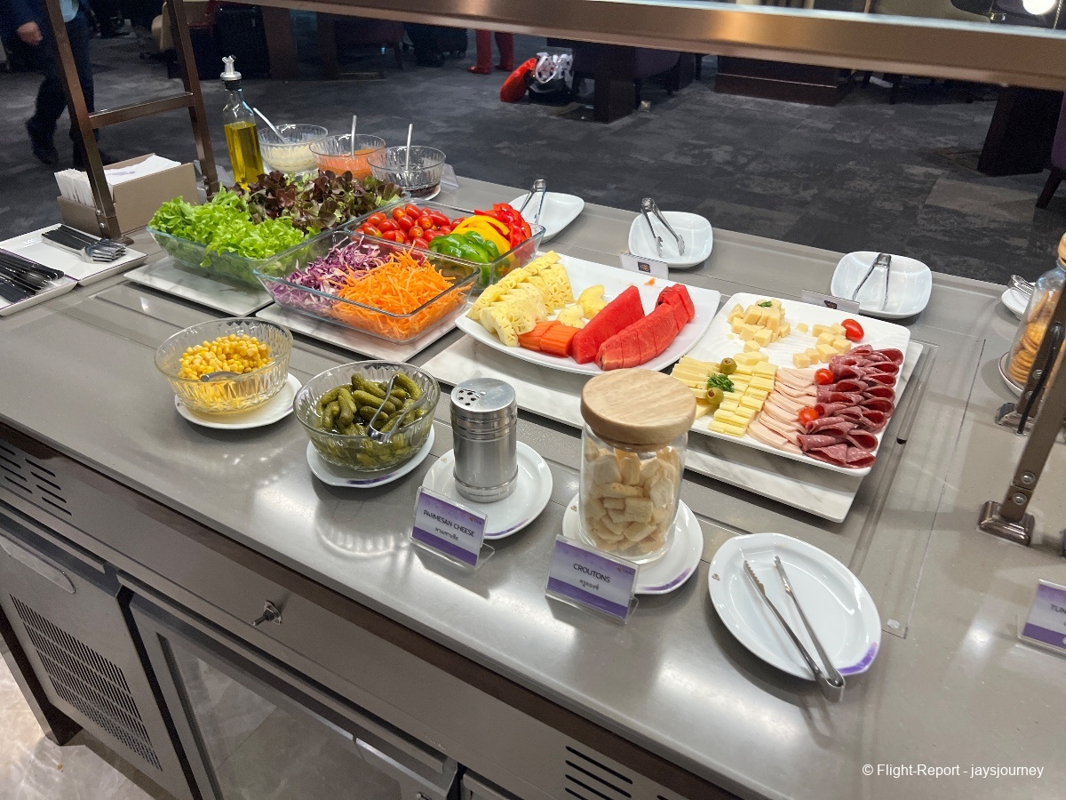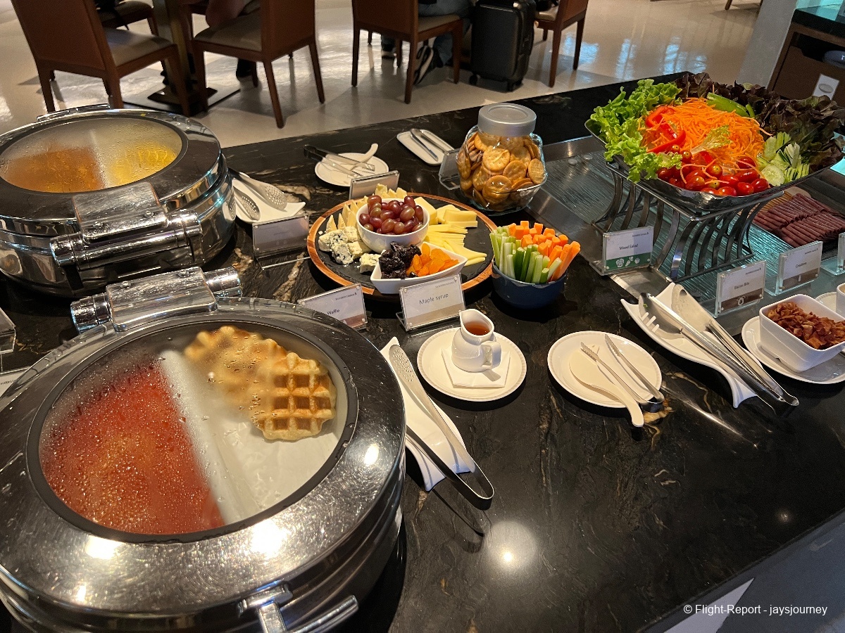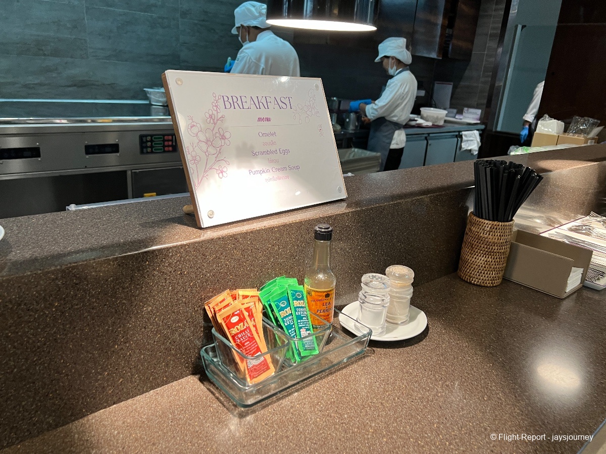 Out of curiosity, I also popped into the TG Royal Orchid Lounge, which is Thai Airways’ newest lounge. It was noticeably less crowded and much brighter than SilverKris, with a wider range of food options and even a made-to-order egg station. They were also showcasing a “Chef of the Month” menu that looked far more interesting unfortunately, it’s only available at specific times.