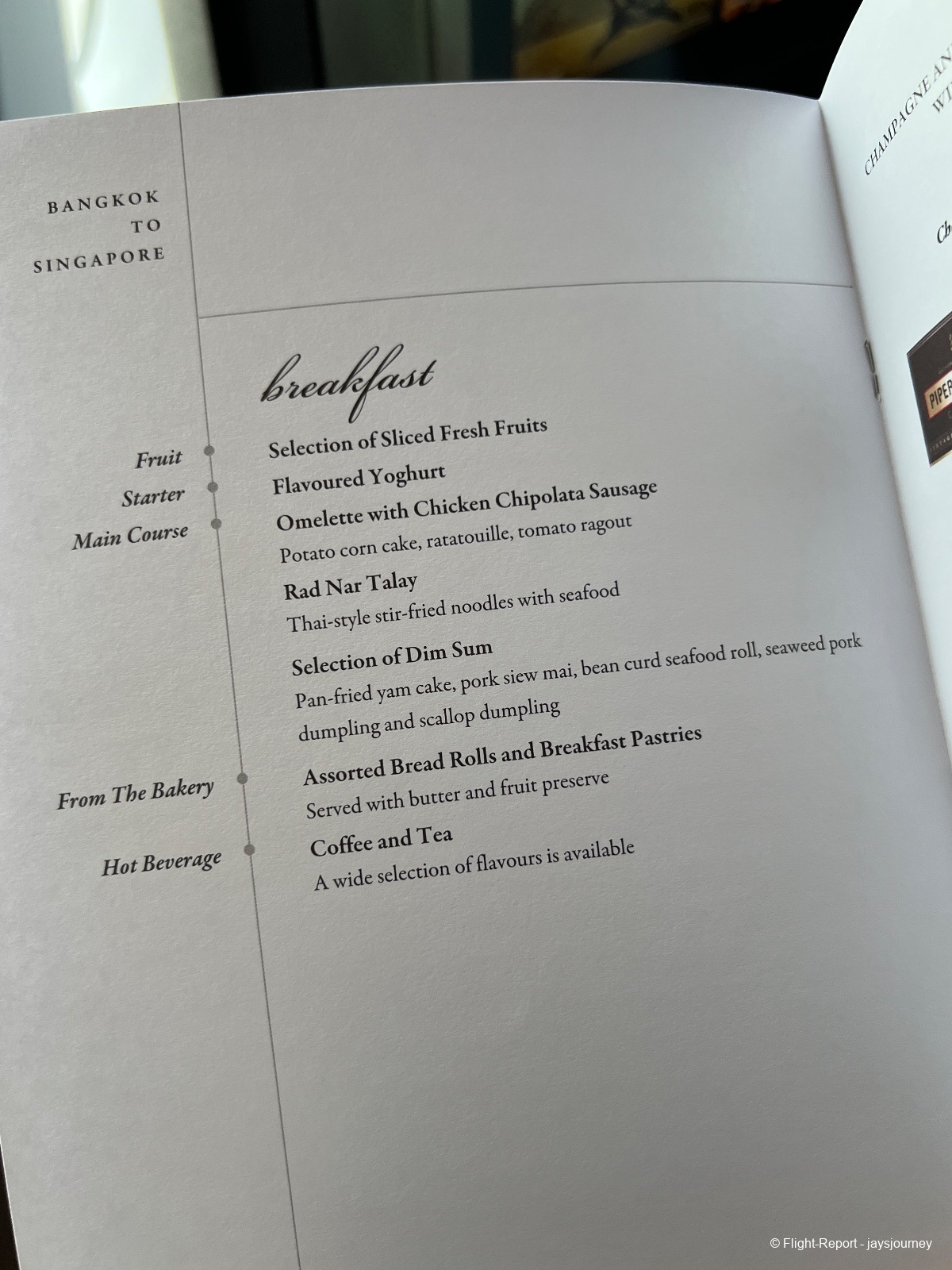 For this flight breakfast came with three main options: an omelette, Rad Nar Talay (a Thai dish of stir-fried broad noodles with seafood gravy, similar to seafood hor fun), and a dim sum set. These were served alongside fresh fruit, yoghurt, and pastries. The dim sum and Rad Nar Talay seemed to be the crowd favourites on this flight.