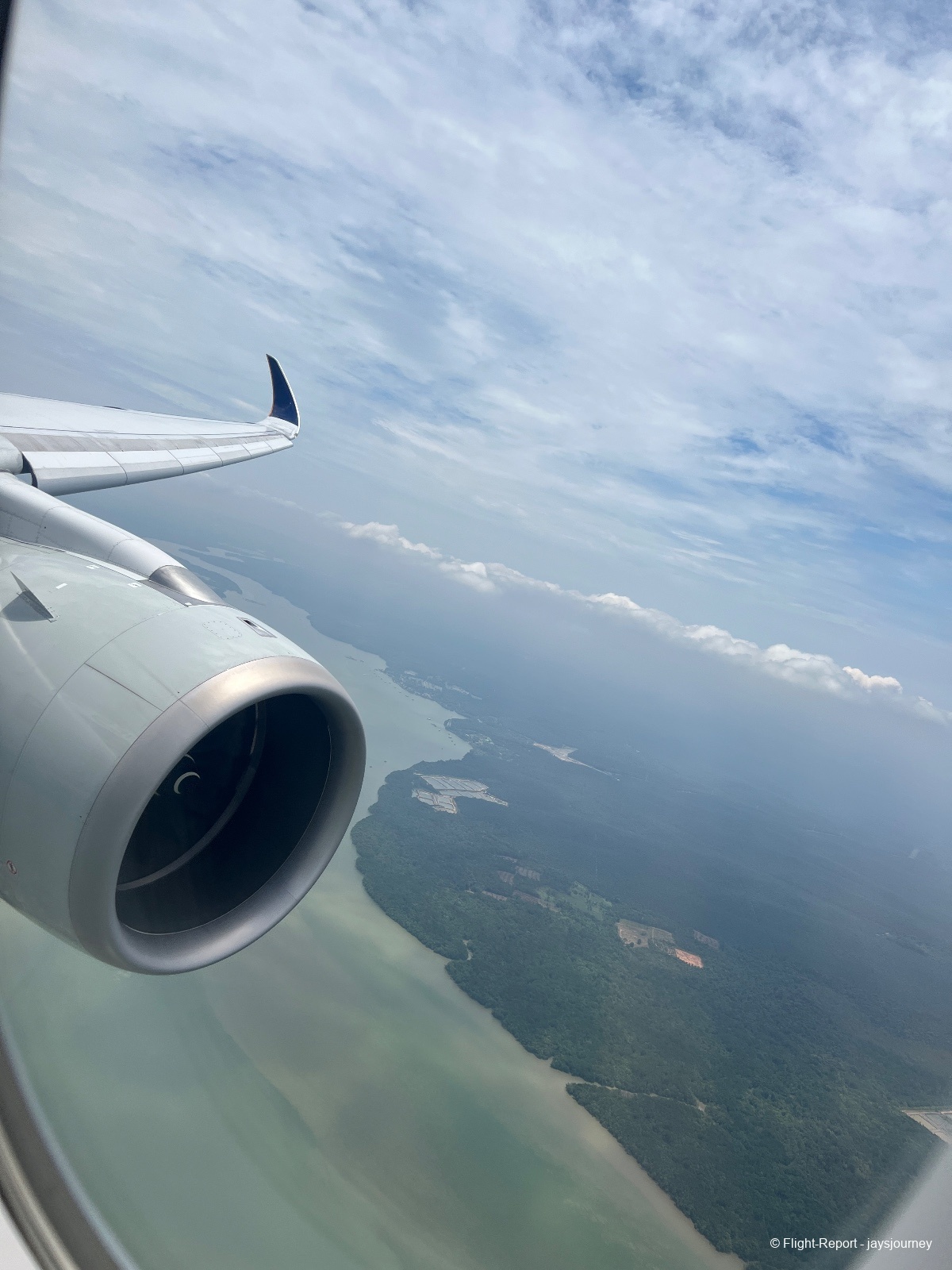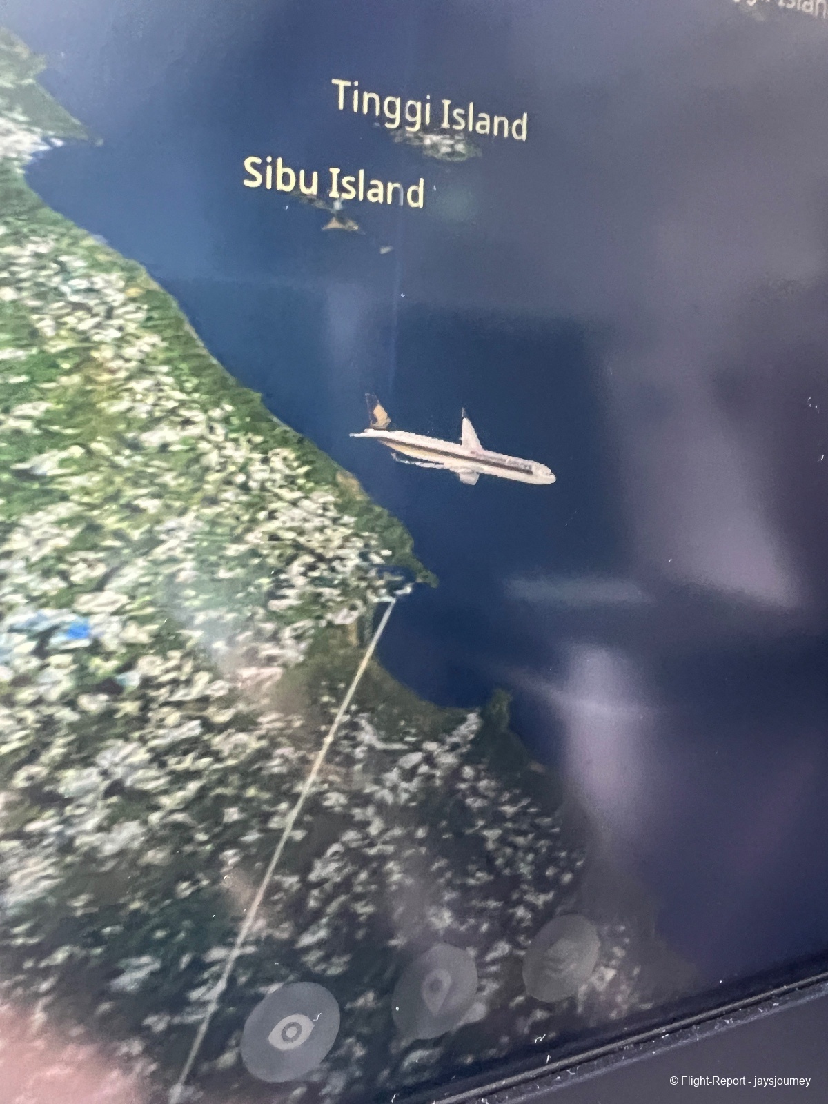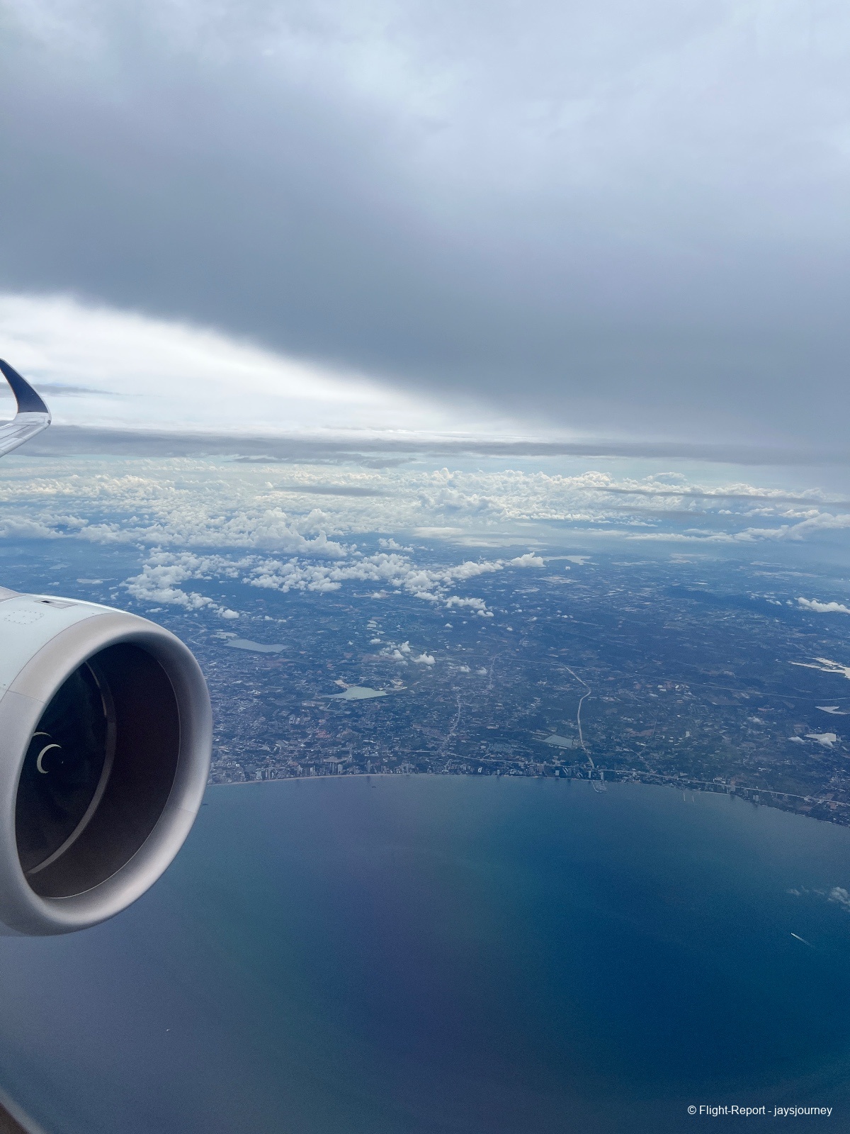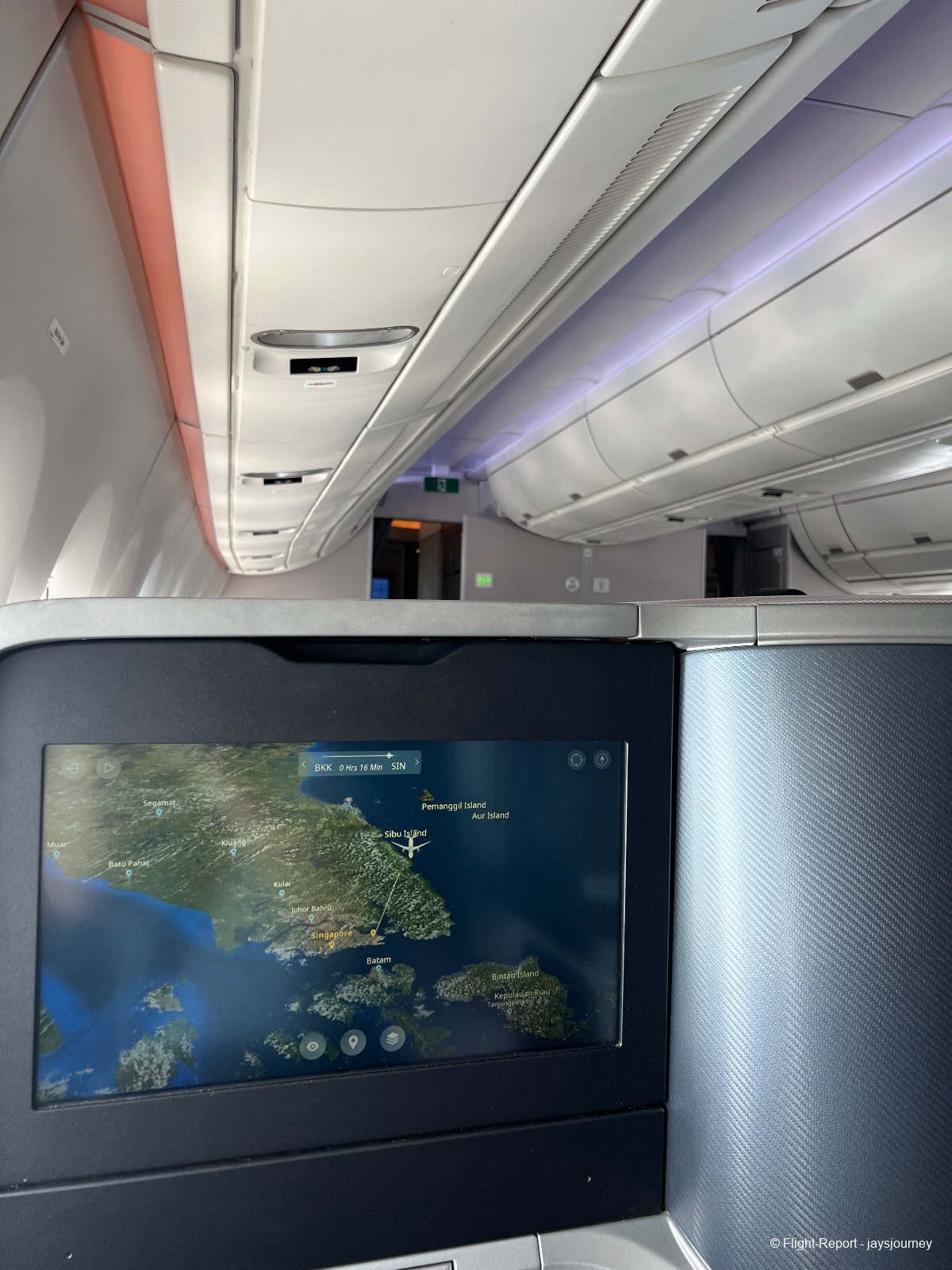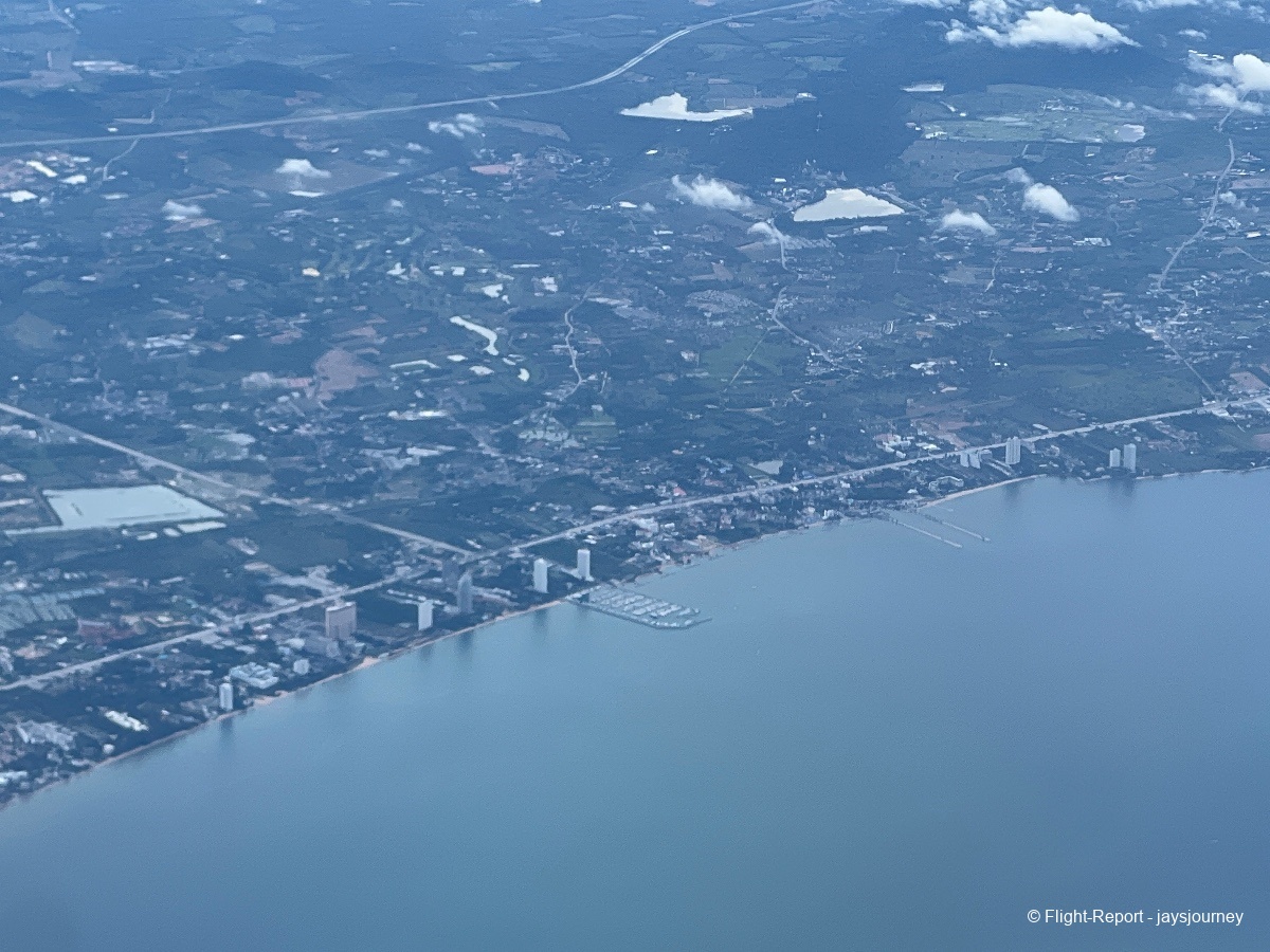 Soon we start pushing back with safety video being shown on all screens. When I took the flight, the airline had just announced a new version of the video, but it’ll clearly take some time before it reaches the whole fleet. By the time the video wrapped up, we were already lined up for take-off. Moments later, we climbed out over the eastern coast of Thailand and continued south, passing just beyond Pattaya (There is a marina there too!)