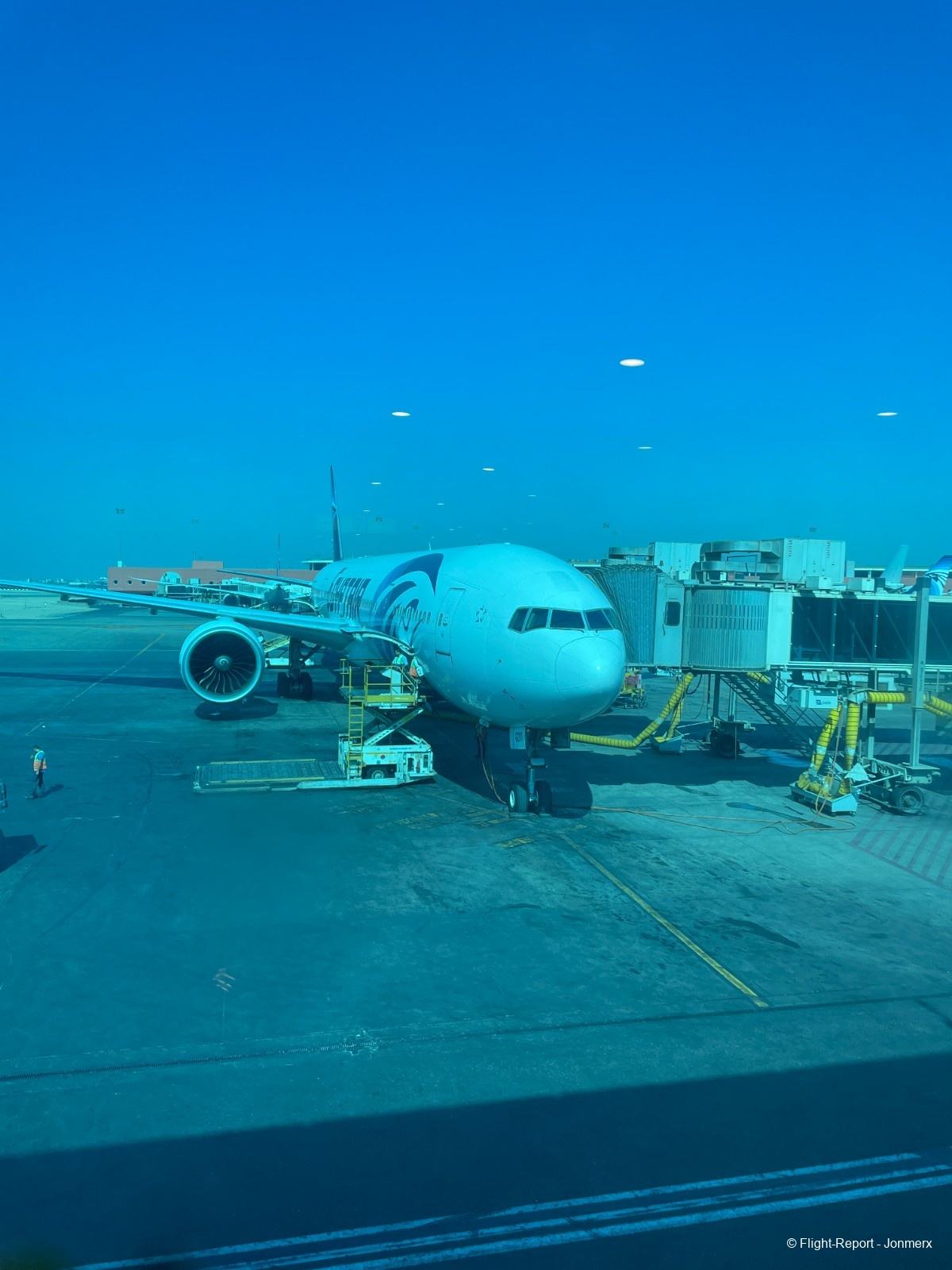 Anyway, boarding is called and the line forms down the jetbridge to our aircraft, a 13-year-old Boeing 777-300ER, registered SU-GDO. Once on board, I find my seat — 30K.