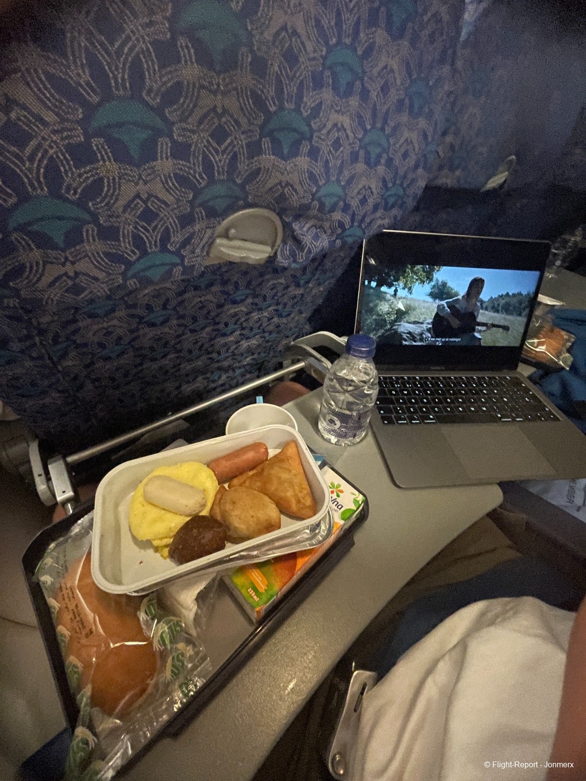 After reaching cruising altitude, we were served a light breakfast of chicken sausages, egg omelette, a samosa, bread, mango juice and water.