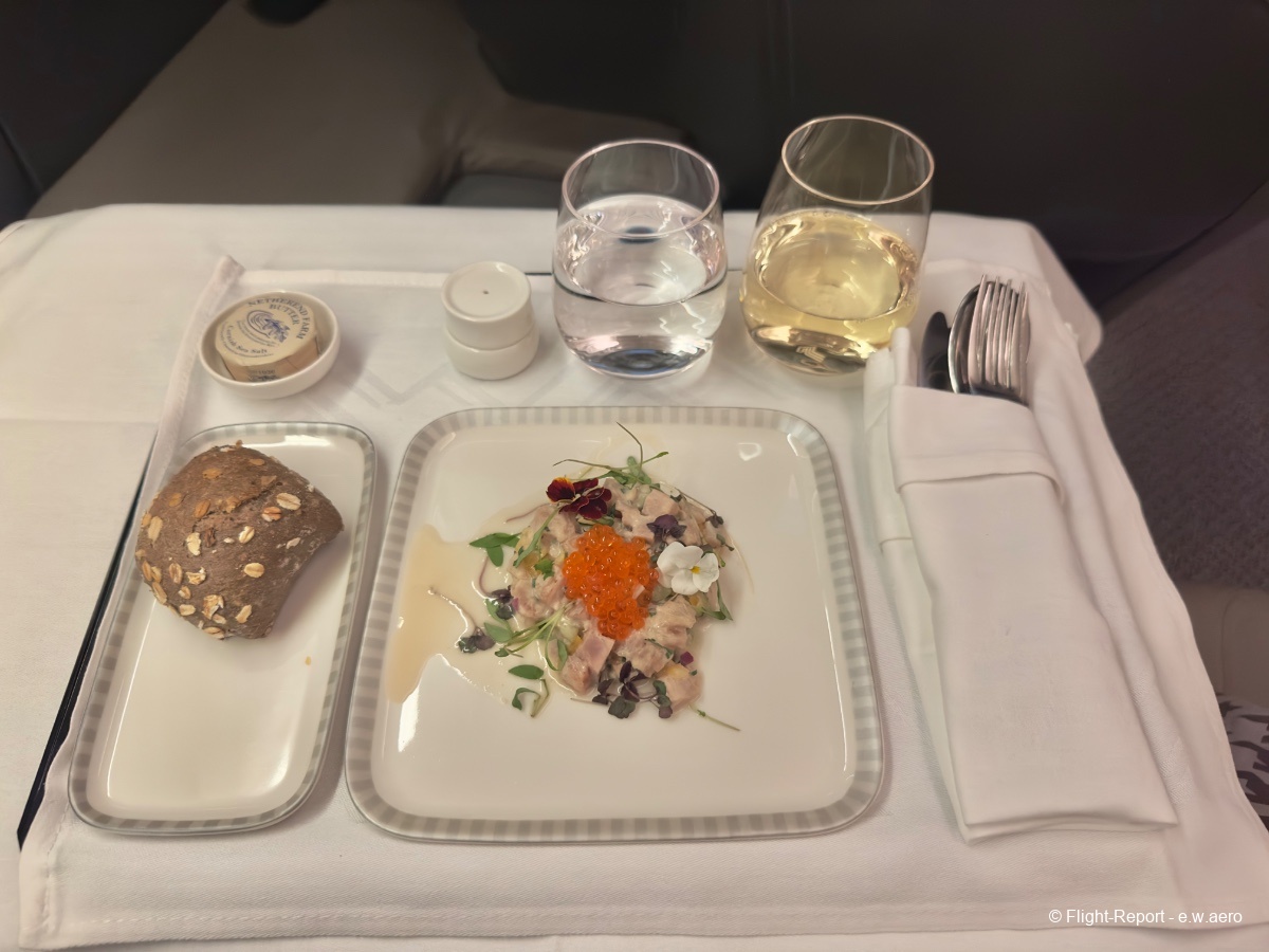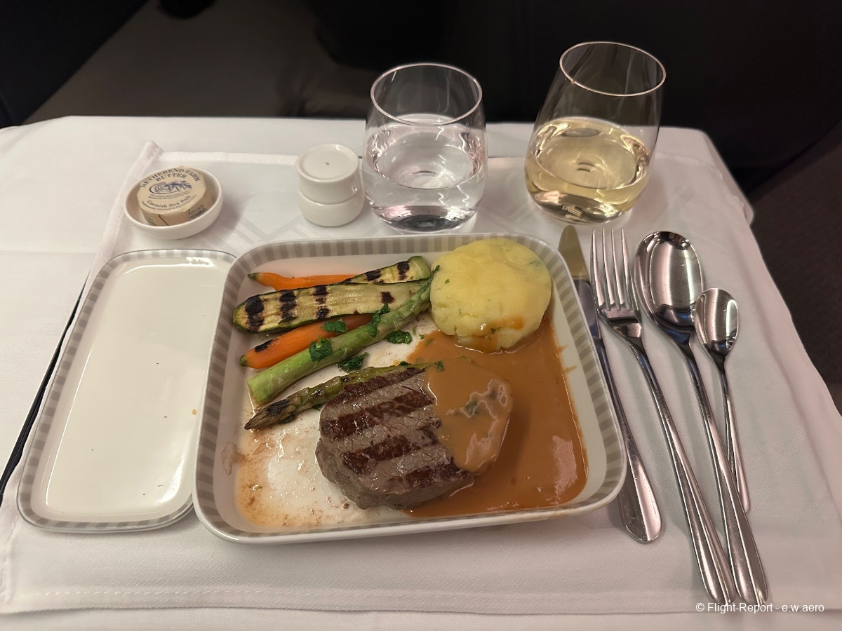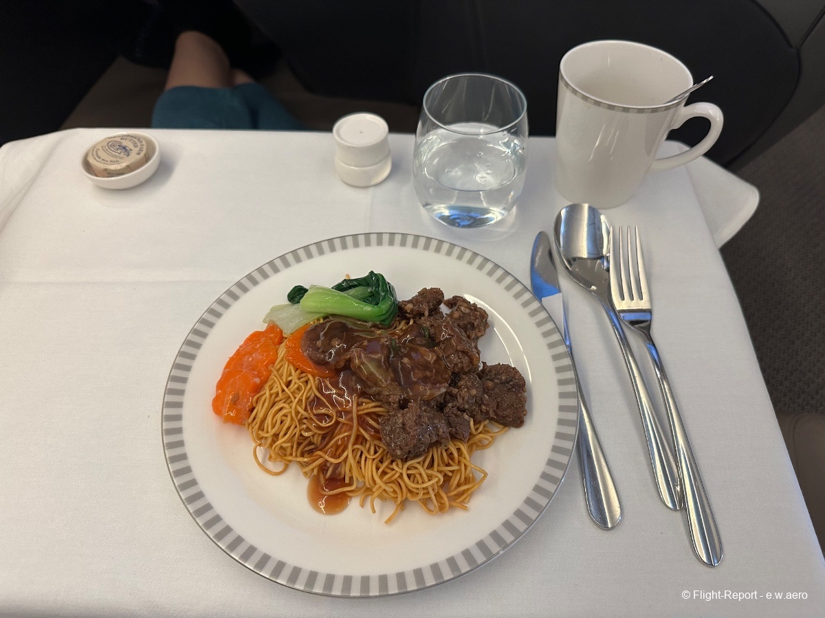 Singapore Airlines offers a "Book the Cook" service for flights departing from Heathrow, allowing me to pre-order my meals online. For lunch, I chose beef brisket with noodles, which was served shortly after takeoff. The beef was tender, although I found it a touch too salty. For dinner, I selected beef tenderloin as my main course. While the beef was well-seasoned, it was slightly overcooked. Overall, I felt a bit disappointed with the food offerings on this flight. Catering was provided by Singapore Airlines in partnership with dnata for this flight out of London.