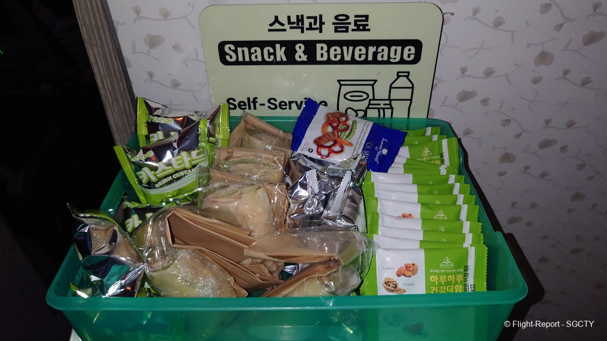 As this was a 15h flight, a snack basket was set up for passengers to serve themselves. Korean Air took the service up a notch by allowing passengers to serve wines to themselves in the drinks basket adjacent to the snack basket.