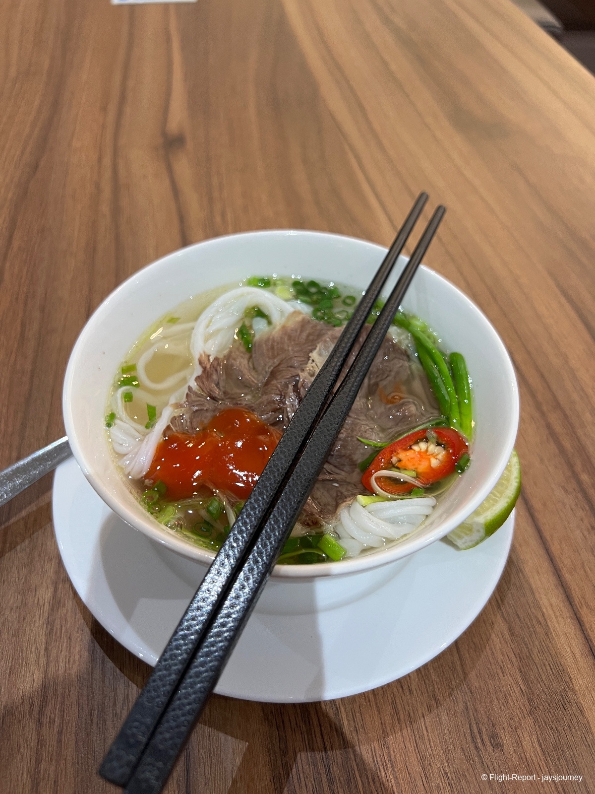 The lounge occupies a large area and offers ample access to power outlets; however, the overall design is rather utilitarian. The food selection is quite extensive and could easily satisfy a full meal. I sampled the beef pho, which was reasonably good. The beverage selection is adequate, although the spirits and wine offerings are fairly standard.