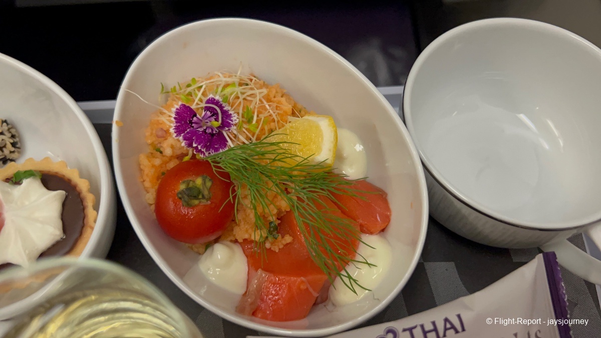 The meal was accompanied by lukewarm bread and butter, a smoked salmon salad, a trio of desserts—two traditional Thai sweets and a chocolate tart—and a small serving of salted cashew nuts.