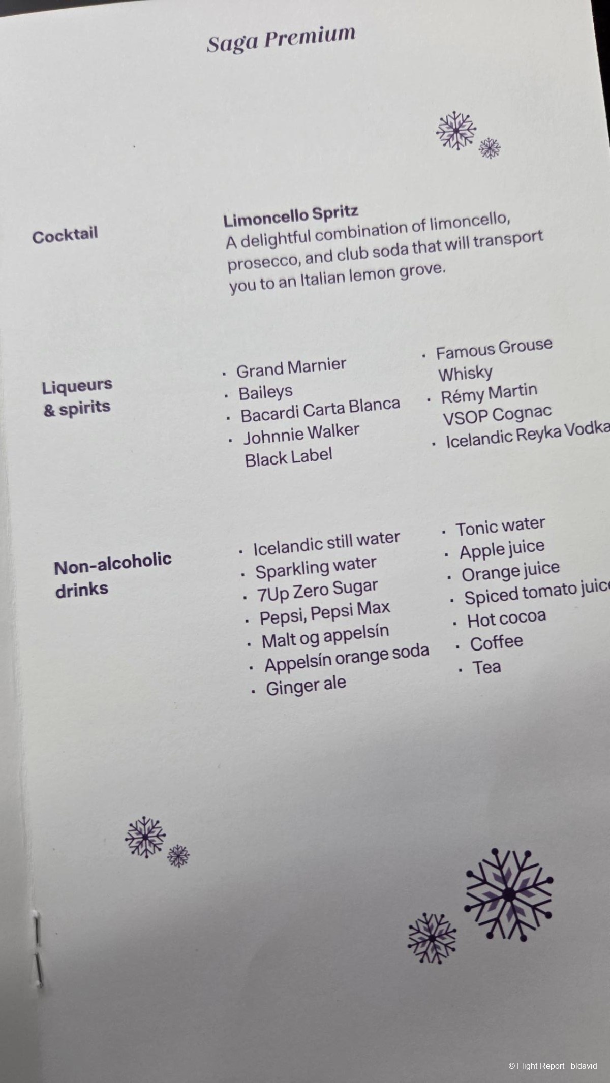 A second service came two hours and 40 minutes after departure with a choice of snacks. I had some chips with a Malt og appelsín, an Icelandic soft drink.