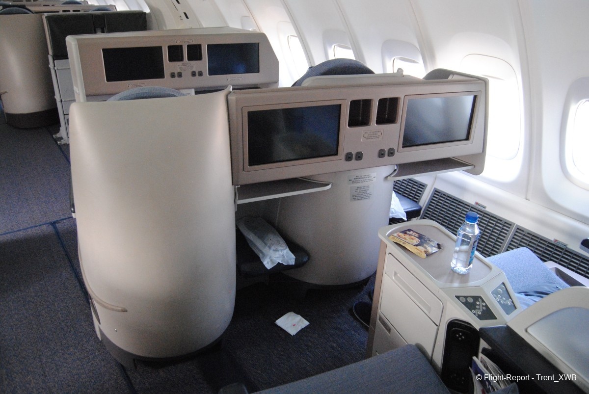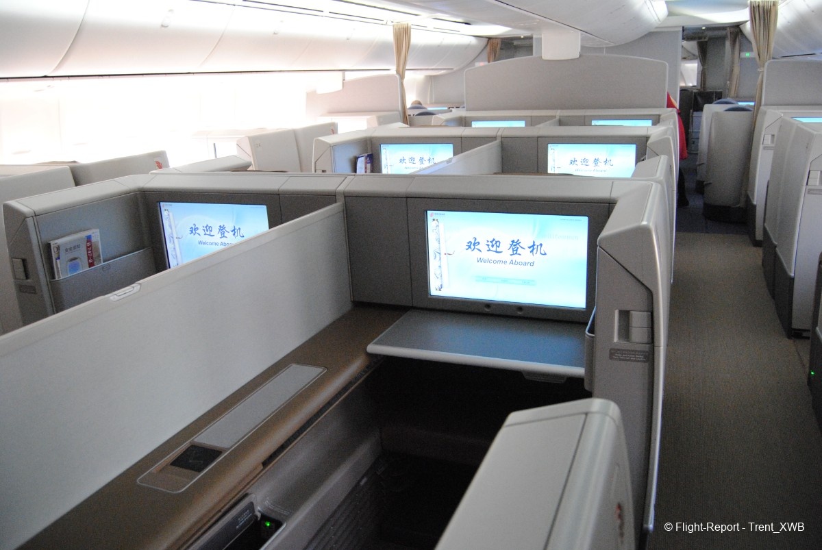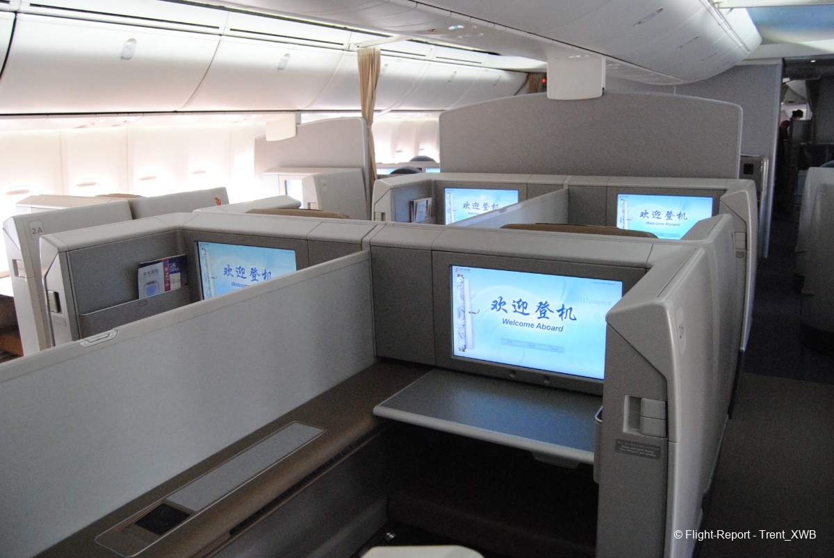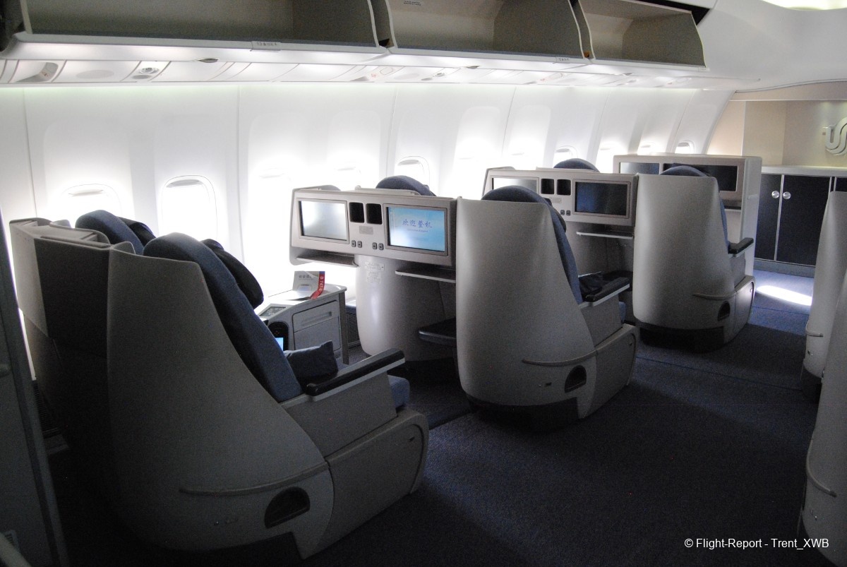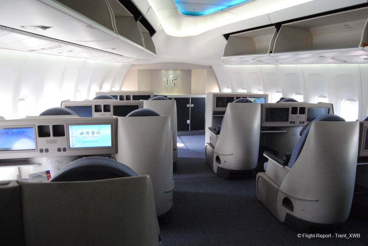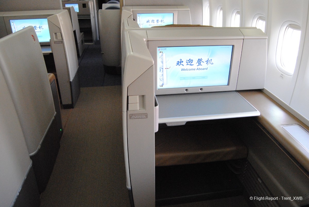 CA B748s have 3.5-class layout F12_C54_Y+66_Y233 with the most unusual location of the first class among the 3 B748 operators: it is located between 1L/R and 2L/R doors. The reason is that the first class suites (Zodias Aerospace Venus) are designed for the widest part of the large widebody fuselages (they are also used in CA's 3-class B77Ws) and simply don't fit in the tapered Jumbo's nose due to their vast size. Also, considering the number of F suites (1.5 times larger than the current LH's one and 2 times larger than KE's one), this location of F provides better weight balance of the aircraft. First class doesn't occupy the entire space between 1L/R and 2L/R doors: 2 rows of business class in 2-2-2 layout are located between 1L/R and F cabin - right where the fuselage starts tapering toward the nose. Business class also occupies the nose (2-2 layout) and the upper deck (2-2 layout). The business class seat model is quite obsolete Collins Parallel Diamond, lacking privacy and direct aisle access. The model name sounds similar to LH's Collins Diamond Parallel business seats, but in reality these models differ so significantly that it creates one of the non-obvious peculiarities of CA B748s, as I'll show in this FR. The economy+ and economy seat model is Collins Pinnacle.