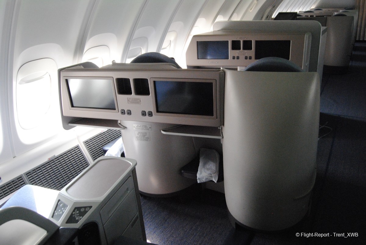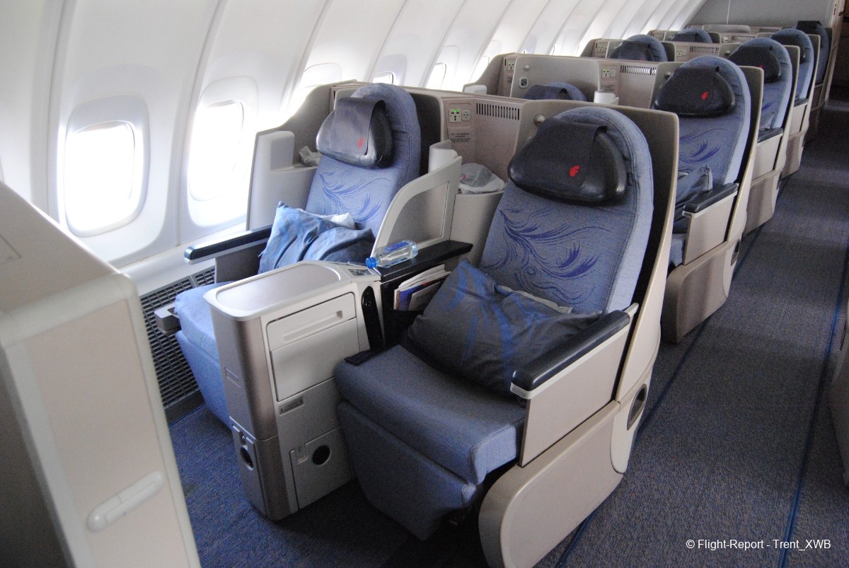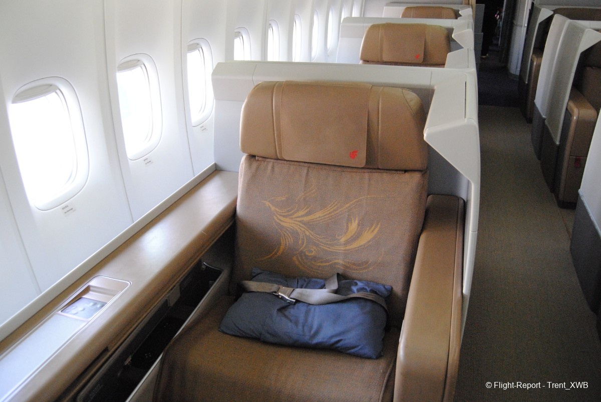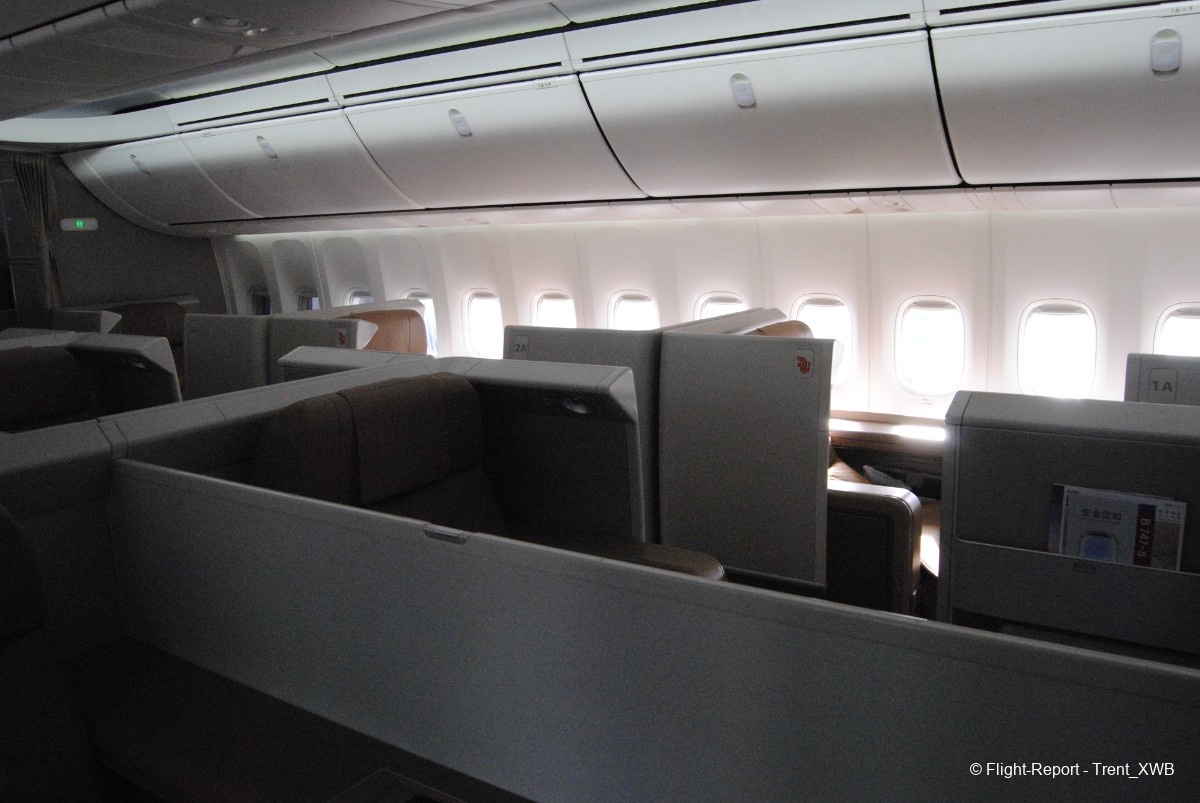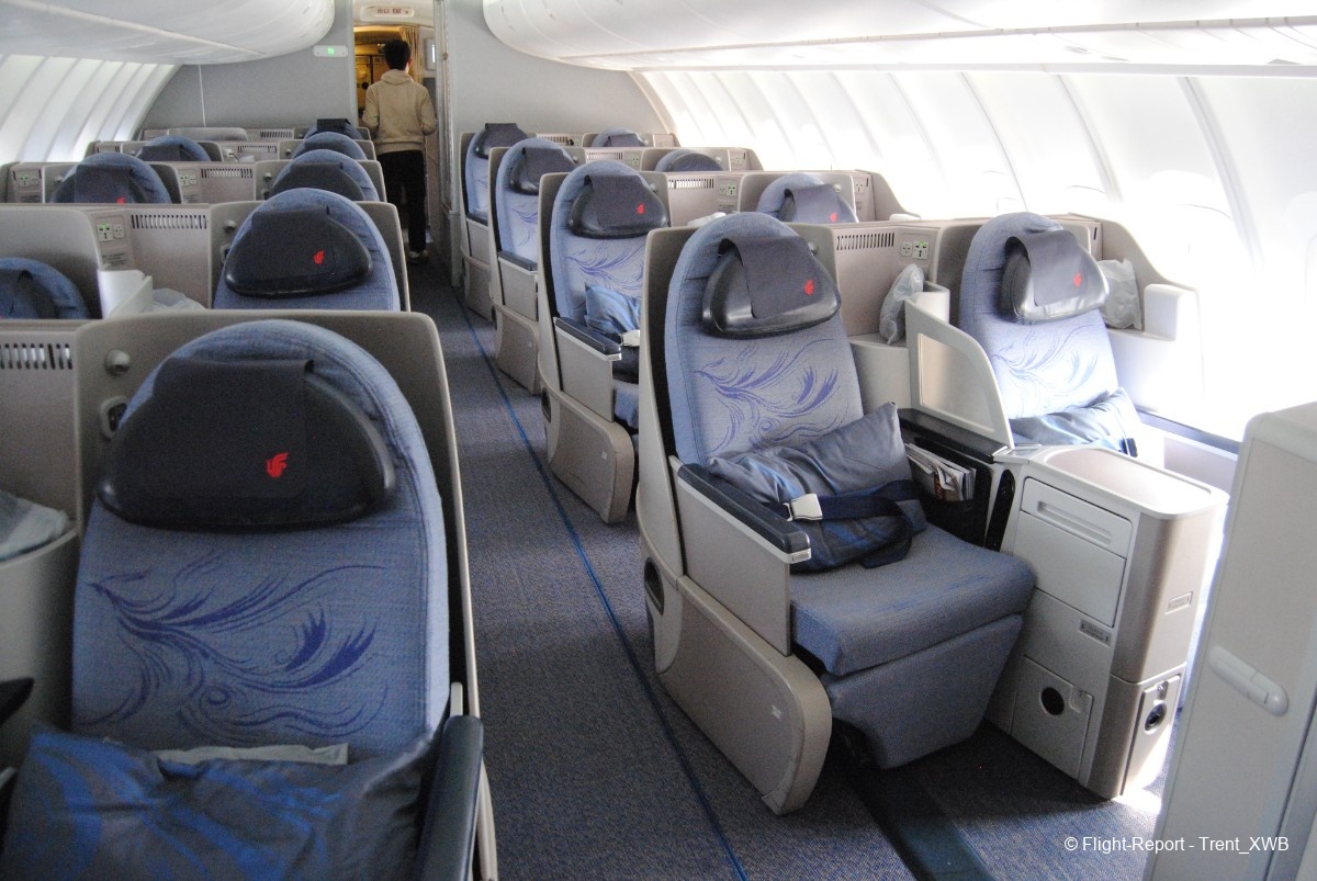 CA B748s have 3.5-class layout F12_C54_Y+66_Y233 with the most unusual location of the first class among the 3 B748 operators: it is located between 1L/R and 2L/R doors. The reason is that the first class suites (Zodias Aerospace Venus) are designed for the widest part of the large widebody fuselages (they are also used in CA's 3-class B77Ws) and simply don't fit in the tapered Jumbo's nose due to their vast size. Also, considering the number of F suites (1.5 times larger than the current LH's one and 2 times larger than KE's one), this location of F provides better weight balance of the aircraft. First class doesn't occupy the entire space between 1L/R and 2L/R doors: 2 rows of business class in 2-2-2 layout are located between 1L/R and F cabin - right where the fuselage starts tapering toward the nose. Business class also occupies the nose (2-2 layout) and the upper deck (2-2 layout). The business class seat model is quite obsolete Collins Parallel Diamond, lacking privacy and direct aisle access. The model name sounds similar to LH's Collins Diamond Parallel business seats, but in reality these models differ so significantly that it creates one of the non-obvious peculiarities of CA B748s, as I'll show in this FR. The economy+ and economy seat model is Collins Pinnacle.