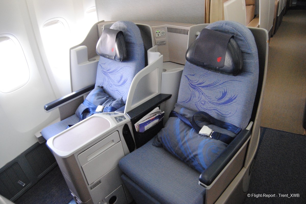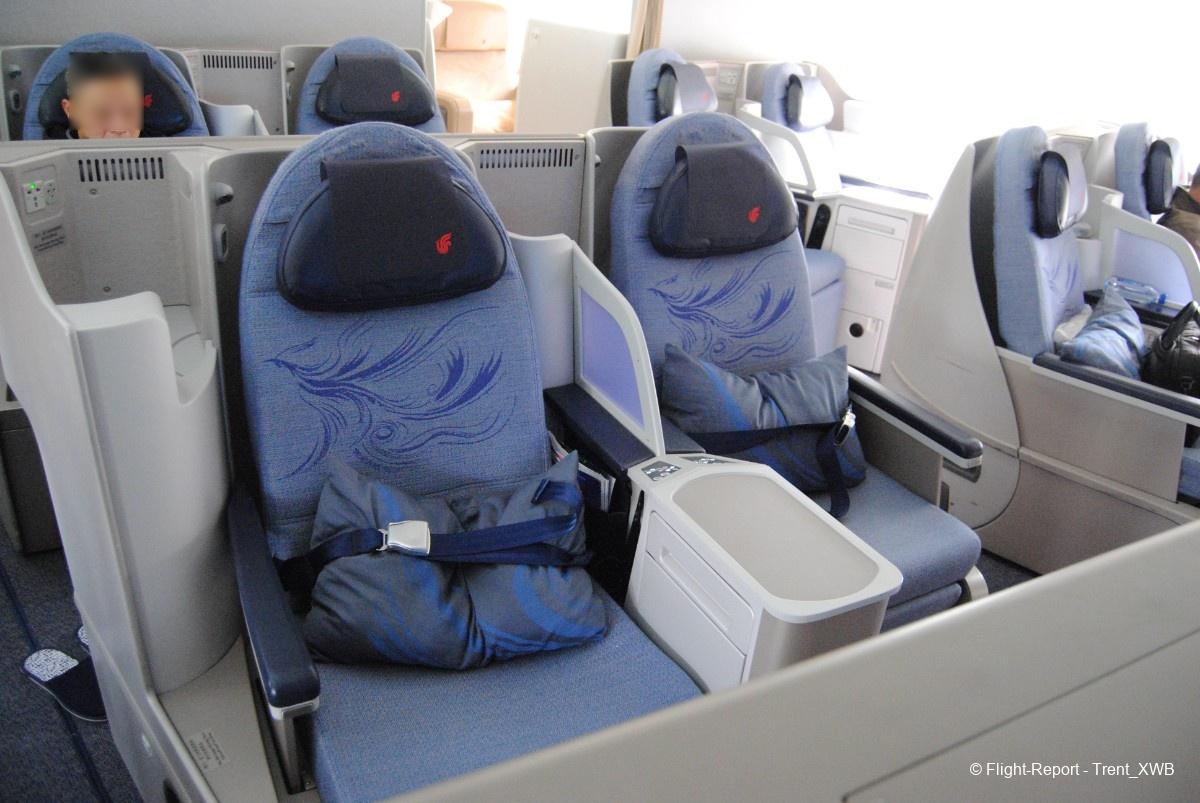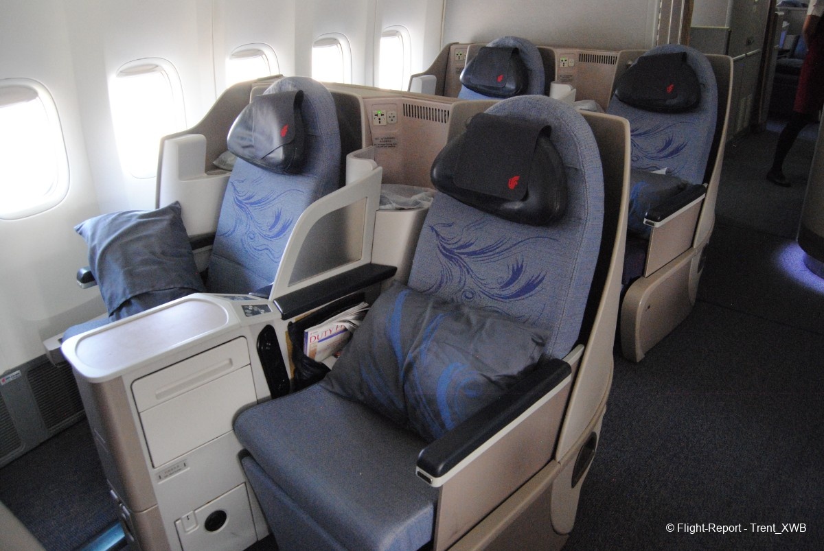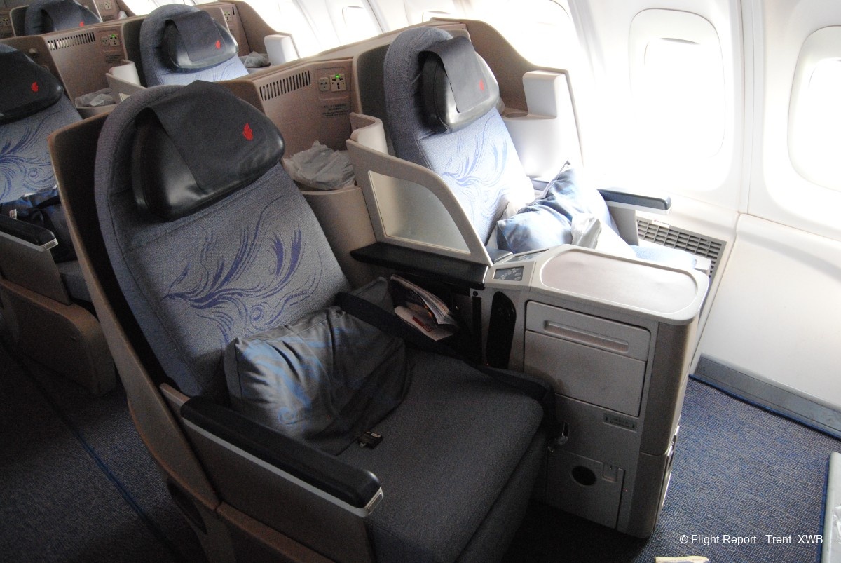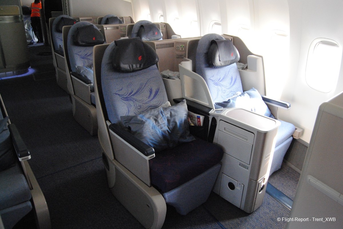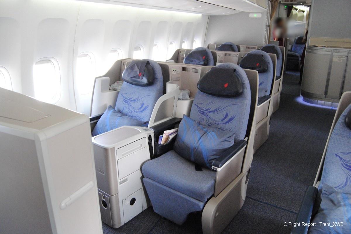 CA B748s have 3.5-class layout F12_C54_Y+66_Y233 with the most unusual location of the first class among the 3 B748 operators: it is located between 1L/R and 2L/R doors. The reason is that the first class suites (Zodias Aerospace Venus) are designed for the widest part of the large widebody fuselages (they are also used in CA's 3-class B77Ws) and simply don't fit in the tapered Jumbo's nose due to their vast size. Also, considering the number of F suites (1.5 times larger than the current LH's one and 2 times larger than KE's one), this location of F provides better weight balance of the aircraft. First class doesn't occupy the entire space between 1L/R and 2L/R doors: 2 rows of business class in 2-2-2 layout are located between 1L/R and F cabin - right where the fuselage starts tapering toward the nose. Business class also occupies the nose (2-2 layout) and the upper deck (2-2 layout). The business class seat model is quite obsolete Collins Parallel Diamond, lacking privacy and direct aisle access. The model name sounds similar to LH's Collins Diamond Parallel business seats, but in reality these models differ so significantly that it creates one of the non-obvious peculiarities of CA B748s, as I'll show in this FR. The economy+ and economy seat model is Collins Pinnacle.