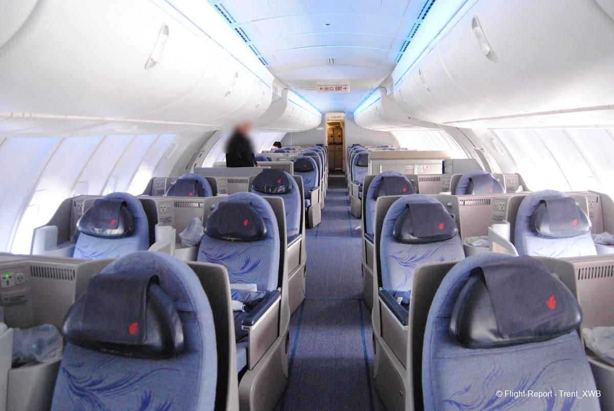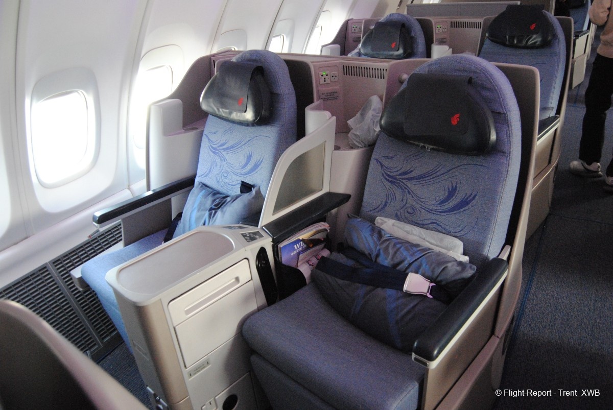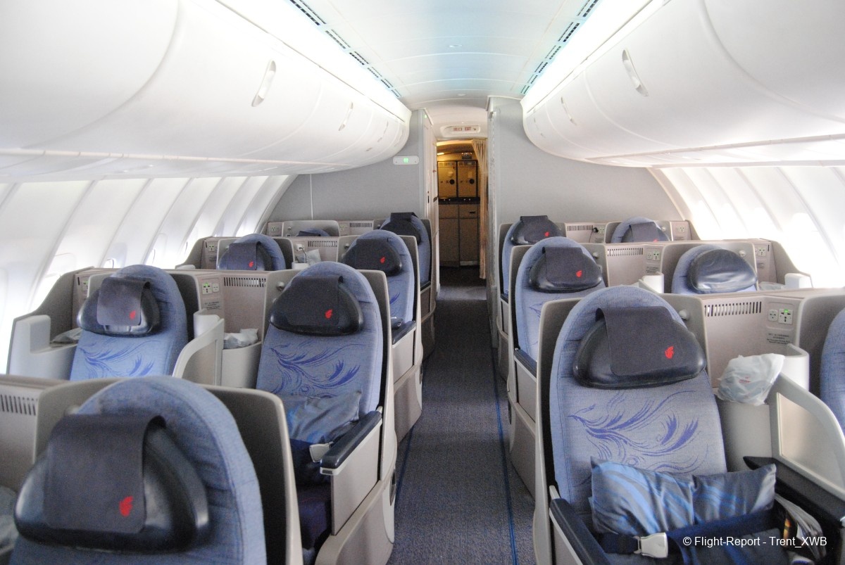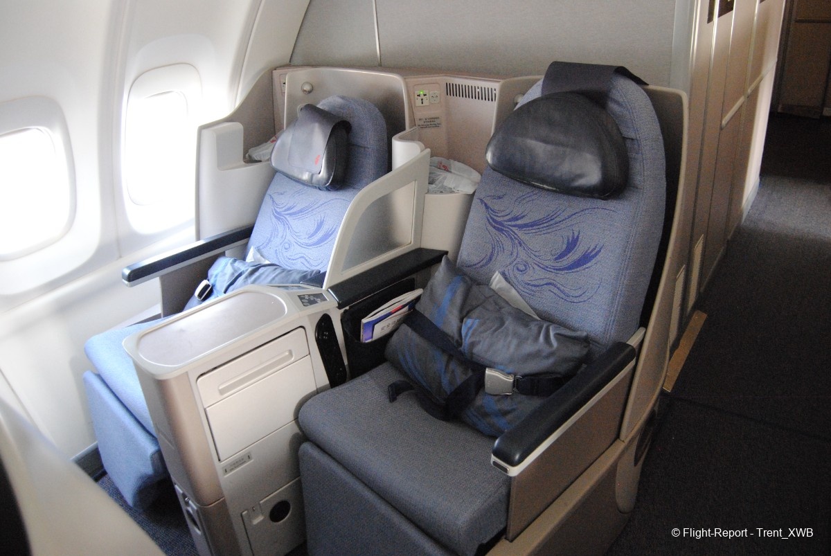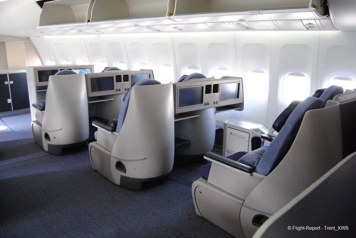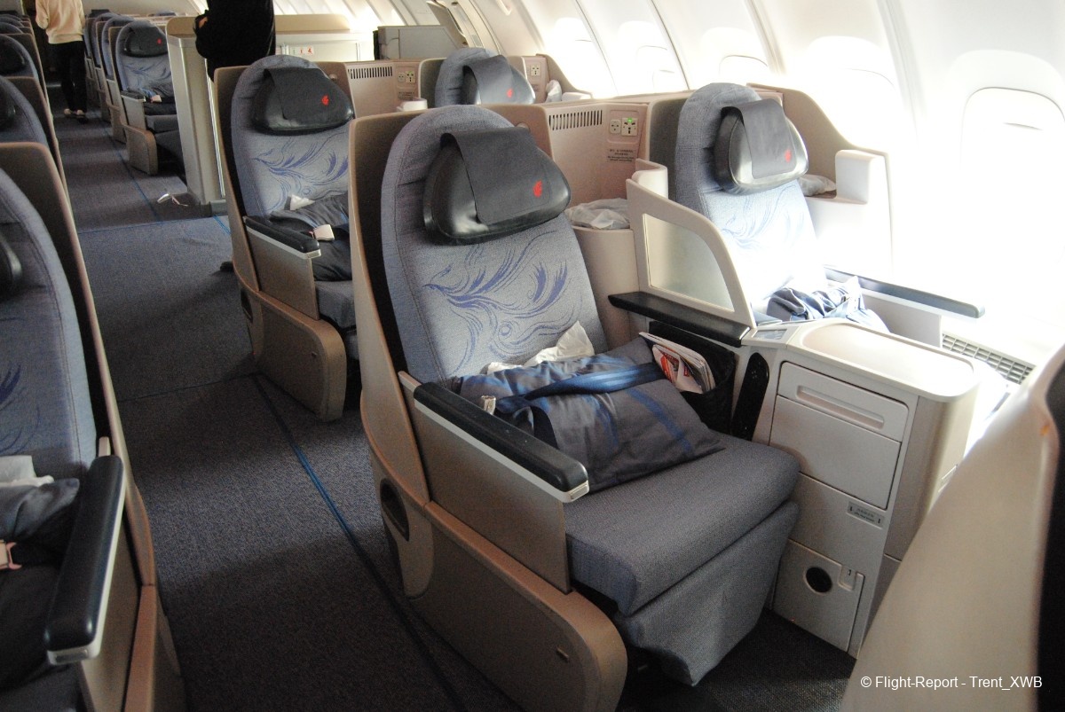 CA B748s have 3.5-class layout F12_C54_Y+66_Y233 with the most unusual location of the first class among the 3 B748 operators: it is located between 1L/R and 2L/R doors. The reason is that the first class suites (Zodias Aerospace Venus) are designed for the widest part of the large widebody fuselages (they are also used in CA's 3-class B77Ws) and simply don't fit in the tapered Jumbo's nose due to their vast size. Also, considering the number of F suites (1.5 times larger than the current LH's one and 2 times larger than KE's one), this location of F provides better weight balance of the aircraft. First class doesn't occupy the entire space between 1L/R and 2L/R doors: 2 rows of business class in 2-2-2 layout are located between 1L/R and F cabin - right where the fuselage starts tapering toward the nose. Business class also occupies the nose (2-2 layout) and the upper deck (2-2 layout). The business class seat model is quite obsolete Collins Parallel Diamond, lacking privacy and direct aisle access. The model name sounds similar to LH's Collins Diamond Parallel business seats, but in reality these models differ so significantly that it creates one of the non-obvious peculiarities of CA B748s, as I'll show in this FR. The economy+ and economy seat model is Collins Pinnacle.