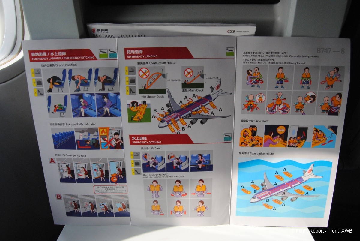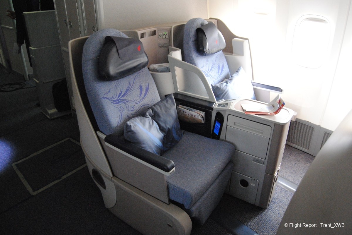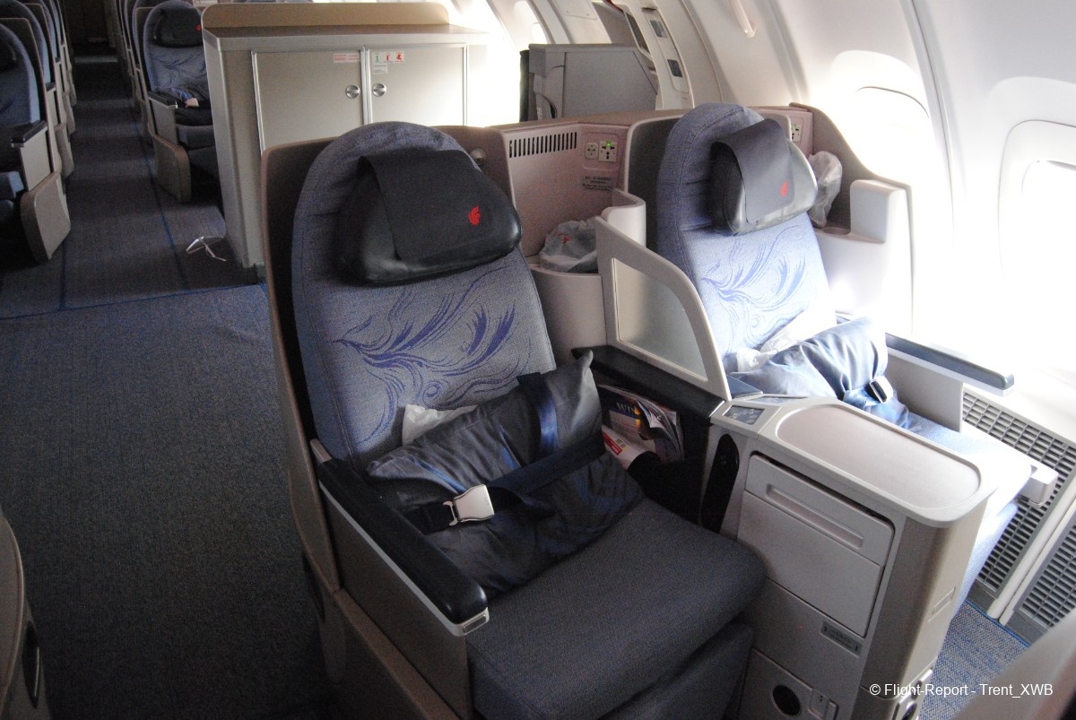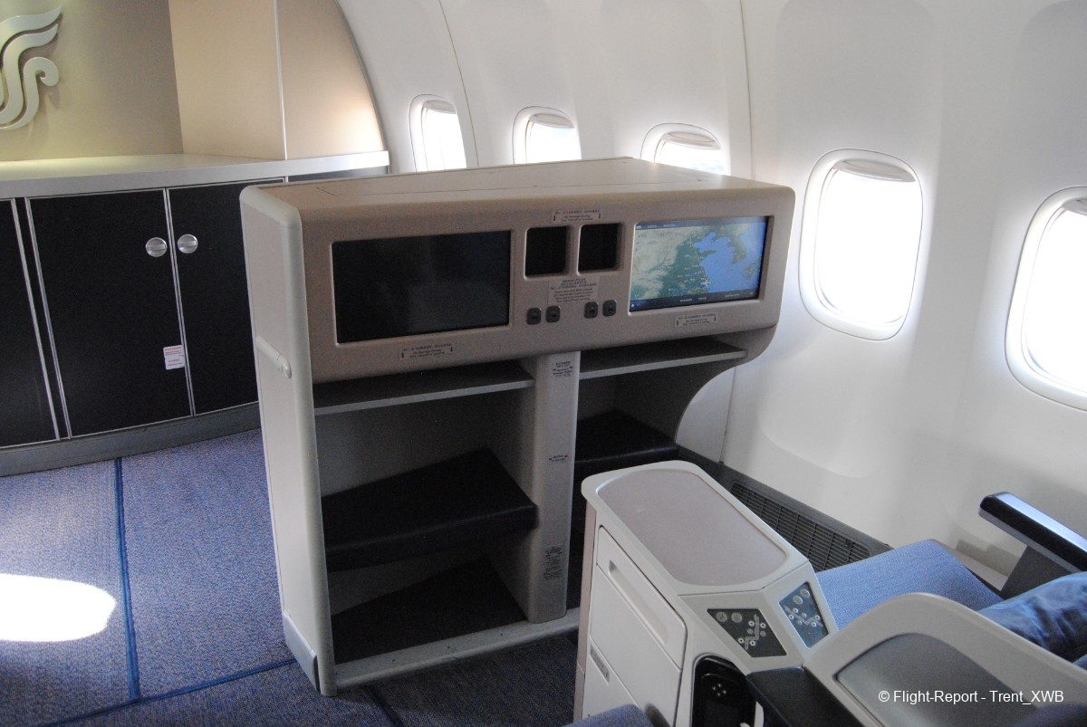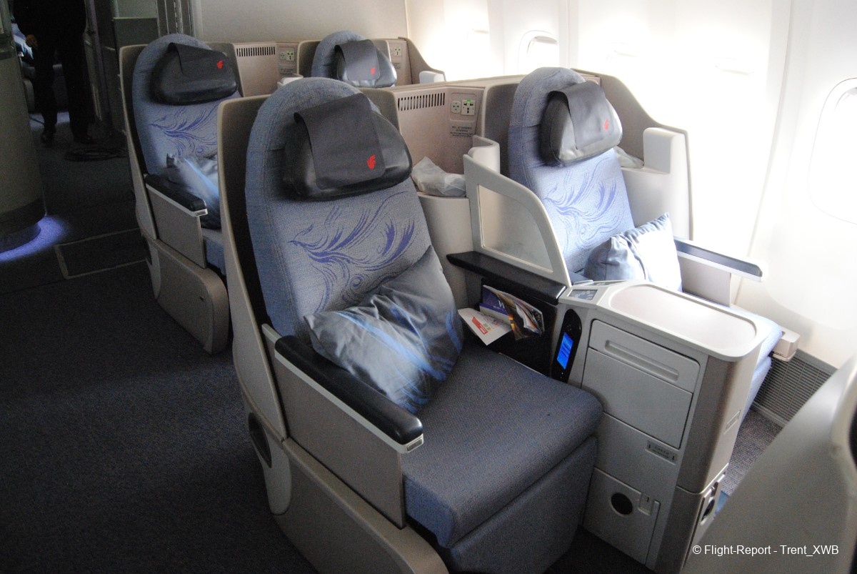 CA B748s have 3.5-class layout F12_C54_Y+66_Y233 with the most unusual location of the first class among the 3 B748 operators: it is located between 1L/R and 2L/R doors. The reason is that the first class suites (Zodias Aerospace Venus) are designed for the widest part of the large widebody fuselages (they are also used in CA's 3-class B77Ws) and simply don't fit in the tapered Jumbo's nose due to their vast size. Also, considering the number of F suites (1.5 times larger than the current LH's one and 2 times larger than KE's one), this location of F provides better weight balance of the aircraft. First class doesn't occupy the entire space between 1L/R and 2L/R doors: 2 rows of business class in 2-2-2 layout are located between 1L/R and F cabin - right where the fuselage starts tapering toward the nose. Business class also occupies the nose (2-2 layout) and the upper deck (2-2 layout). The business class seat model is quite obsolete Collins Parallel Diamond, lacking privacy and direct aisle access. The model name sounds similar to LH's Collins Diamond Parallel business seats, but in reality these models differ so significantly that it creates one of the non-obvious peculiarities of CA B748s, as I'll show in this FR. The economy+ and economy seat model is Collins Pinnacle.