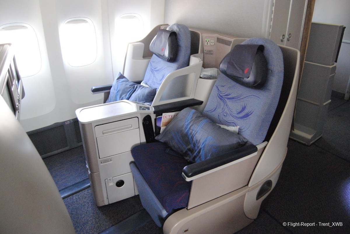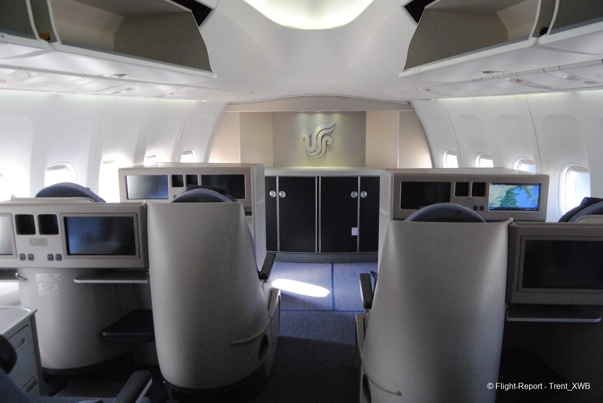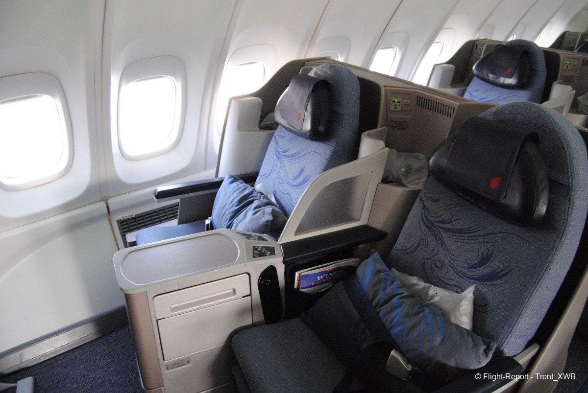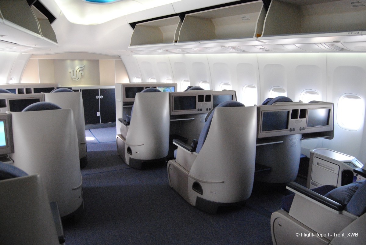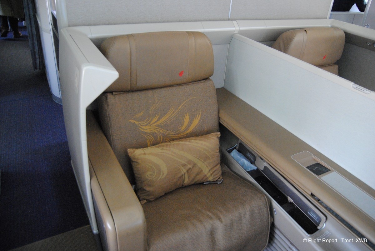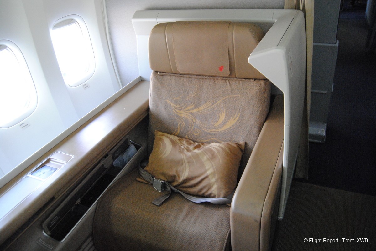 CA B748s have 3.5-class layout F12_C54_Y+66_Y233 with the most unusual location of the first class among the 3 B748 operators: it is located between 1L/R and 2L/R doors. The reason is that the first class suites (Zodias Aerospace Venus) are designed for the widest part of the large widebody fuselages (they are also used in CA's 3-class B77Ws) and simply don't fit in the tapered Jumbo's nose due to their vast size. Also, considering the number of F suites (1.5 times larger than the current LH's one and 2 times larger than KE's one), this location of F provides better weight balance of the aircraft. First class doesn't occupy the entire space between 1L/R and 2L/R doors: 2 rows of business class in 2-2-2 layout are located between 1L/R and F cabin - right where the fuselage starts tapering toward the nose. Business class also occupies the nose (2-2 layout) and the upper deck (2-2 layout). The business class seat model is quite obsolete Collins Parallel Diamond, lacking privacy and direct aisle access. The model name sounds similar to LH's Collins Diamond Parallel business seats, but in reality these models differ so significantly that it creates one of the non-obvious peculiarities of CA B748s, as I'll show in this FR. The economy+ and economy seat model is Collins Pinnacle.