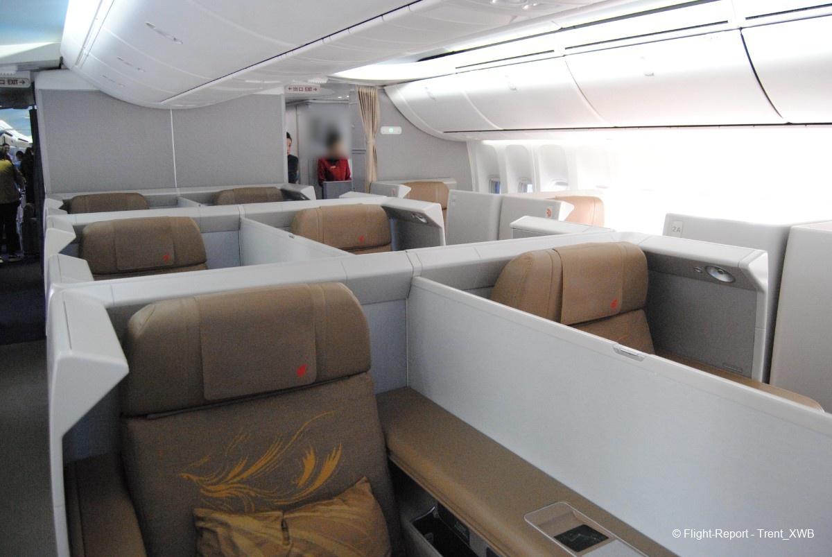 The 2nd business class cabin, consisting also of 12 Collins Parallel Diamond seats, arranged in 2 rows (rows 14-15) with 2-2-2 layout, is located between 1L/R doors and the first class cabin. This is where the fuselage tapering (towards nose) begins, so it's rather unsuitable for Zodiac Aerospace Venus first class suites, and CA's decision to install here 2 rows of business seats seems reasonable.