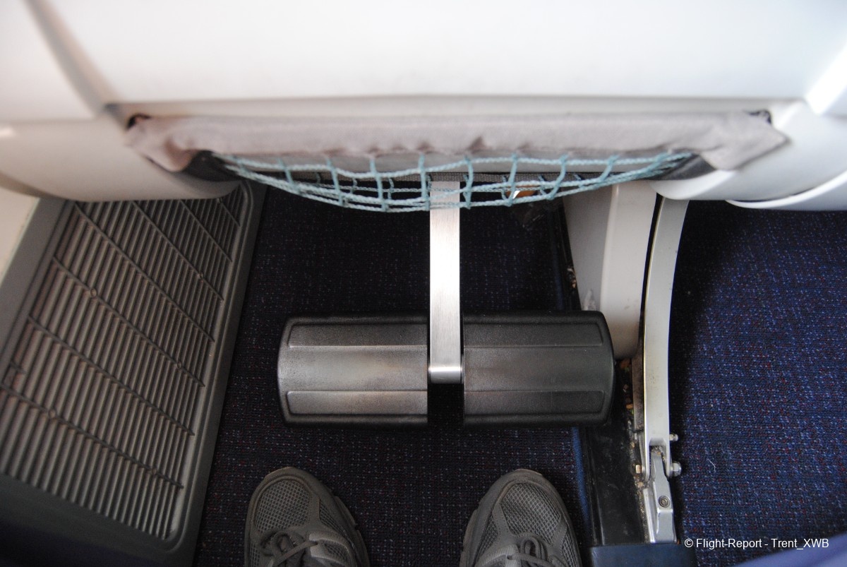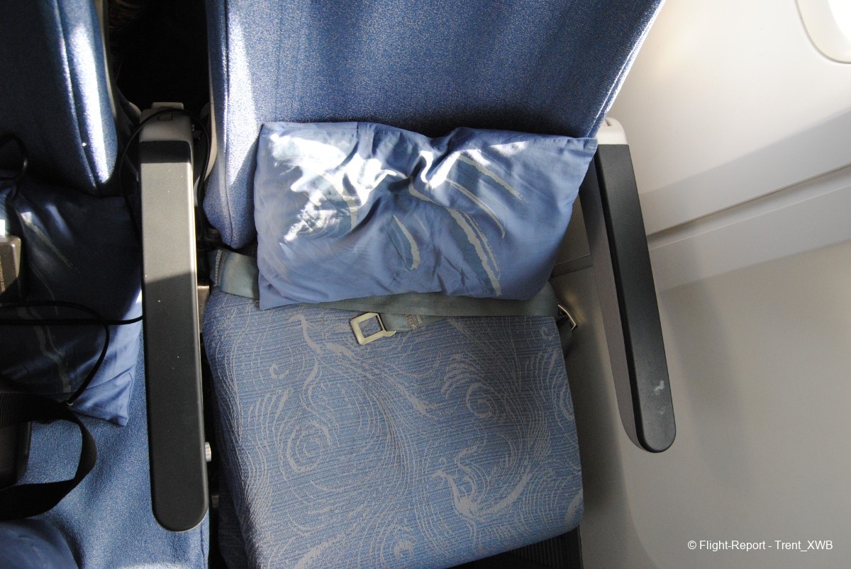 The seat has adjustable headrest, IFE with USB port, upper hard pocket, coat hanger, bifold tray table with cup holder, lower soft pocket, footrest and underseat universal power socket. Window seats have IFE power box, but quite slim and not bothersome. Waiting on the seat was just pillow (blankets were available at request). The IFE screen is rather small and, in addition to the "tired" state of the seat, the IFE didn't want to turn on, so I asked a FA to reset it (later on it had to be reset again).