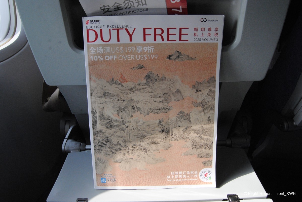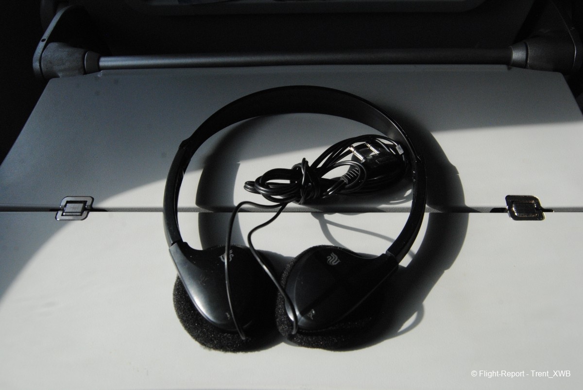The headset, handed by crew, and the seat pocket content - safety card and duty-free magazine.