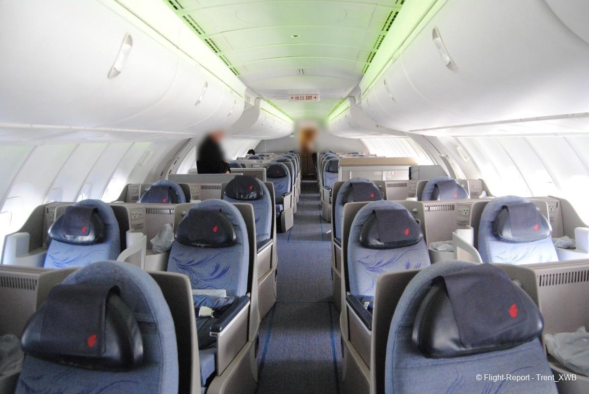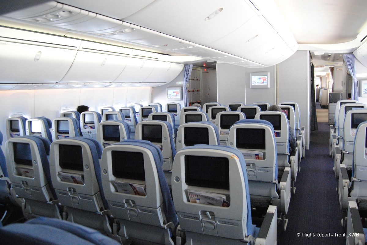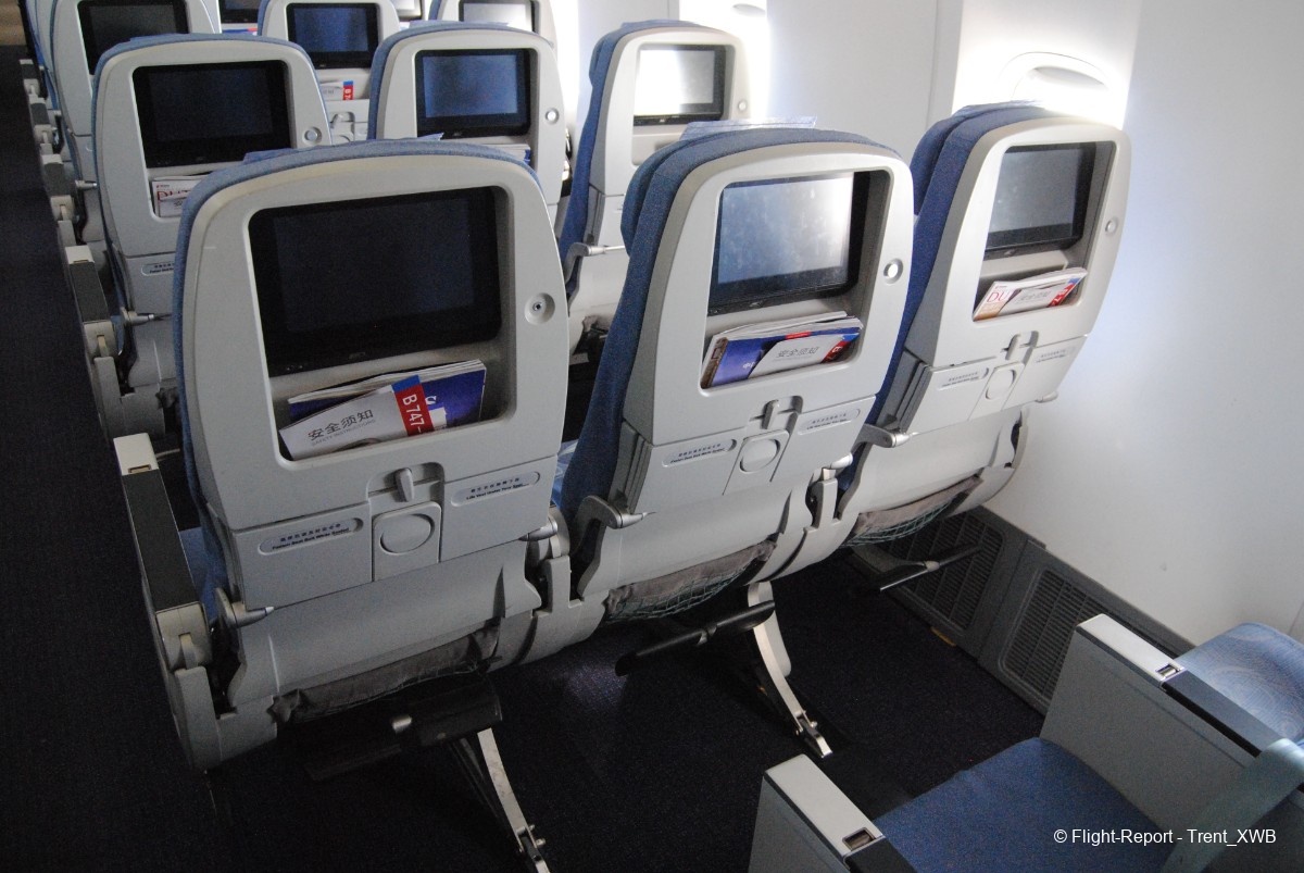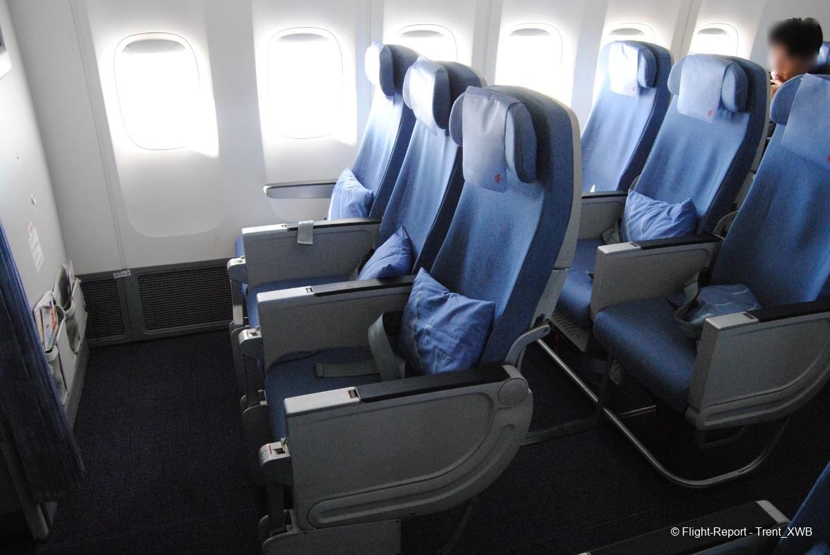 The front economy cabin, consisting of 92 seats, arranged in 10 rows (rows 38 to 47) with 3-4-3 layout, is located between 3L/R and 4L/R doors. Rows 38 and 47 don't have central 4-seaters blocks.